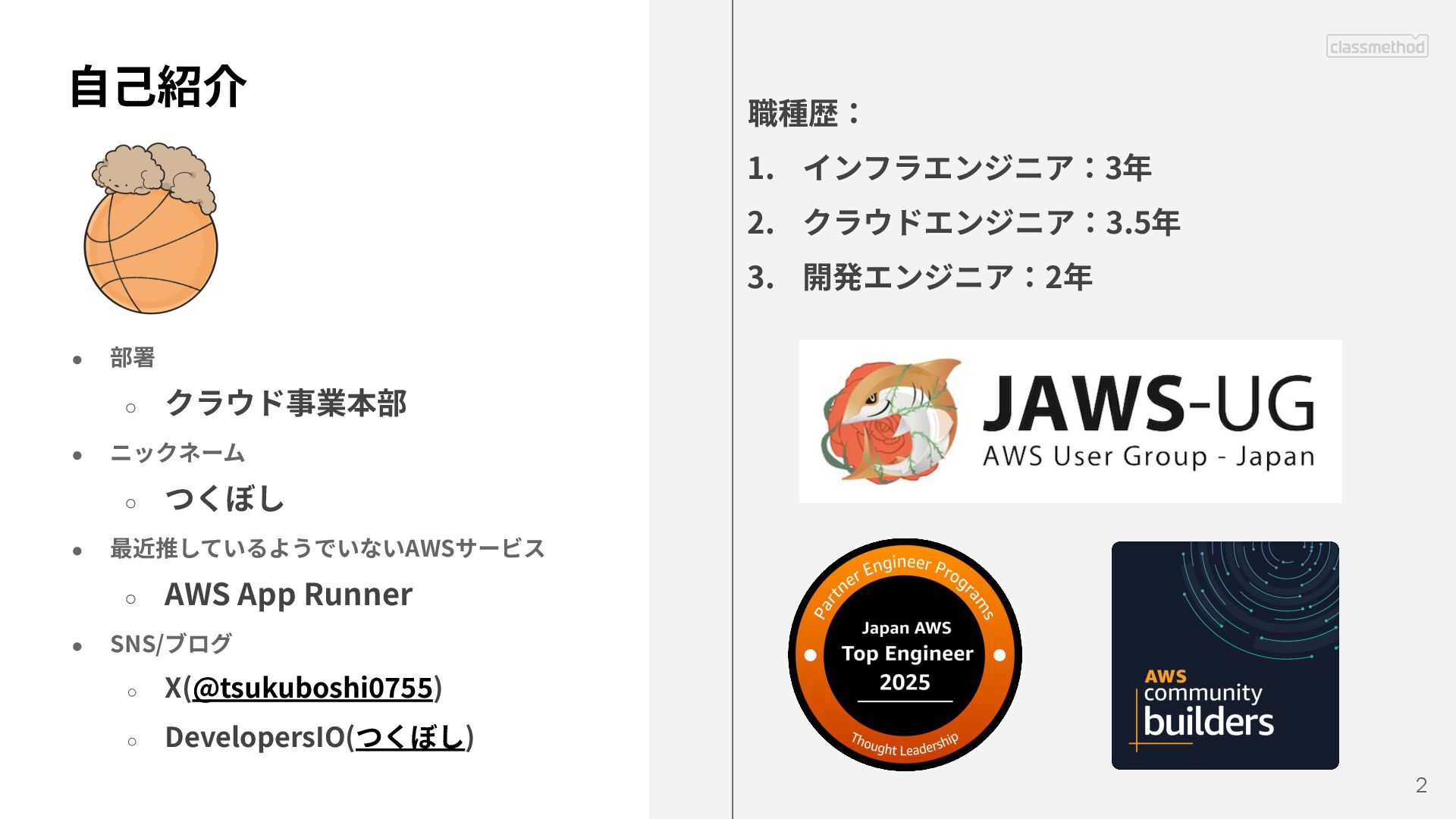 • 最近推しているようでいないAWSサービス ◦ AWS App Runner • SNS/ブログ ◦ X(@tsukuboshi0755) ◦ DevelopersIO(つくぼし) 職種歴: 1. インフラエンジニア:3年 2. クラウドエンジニア:3.5年 3. 開発エンジニア:2年
