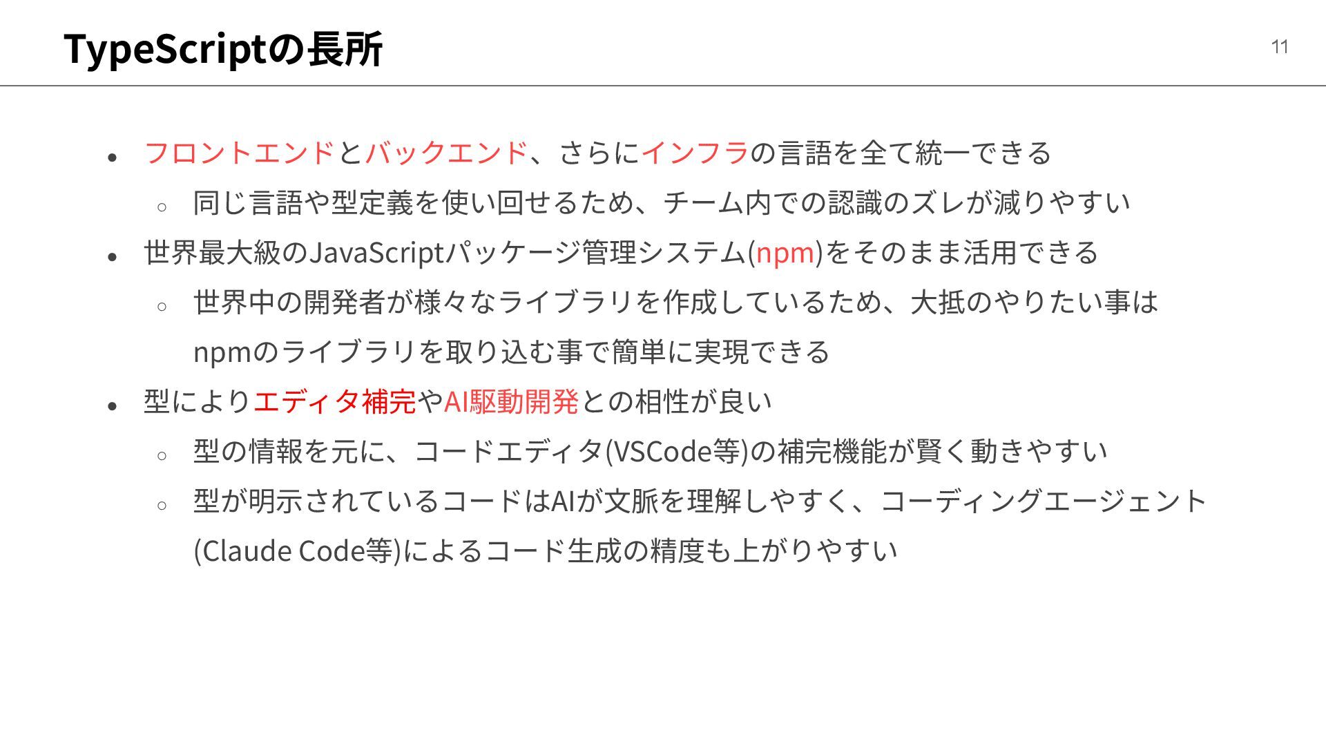 • 型によりエディタ補完やAI駆動開発との相性が良い ◦ 型の情報を元に、コードエディタ(VSCode等)の補完機能が賢く動きやすい ◦ 型が明⽰されているコードはAIが⽂脈を理解しやすく、コーディングエージェント (Claude Code等)によるコード⽣成の精度も上がりやすい 11