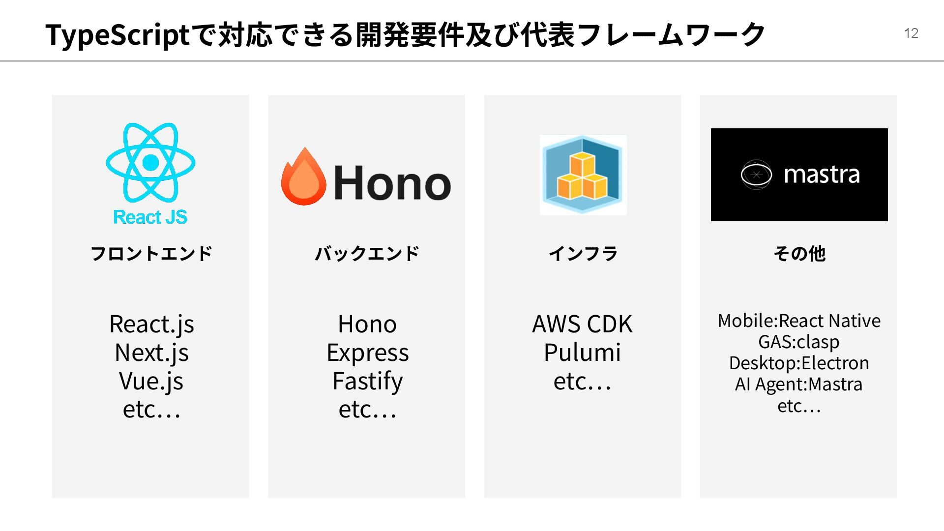 etc… インフラ その他 12 AWS CDK Pulumi etc… Mobile:React Native GAS:clasp Desktop:Electron AI Agent:Mastra etc…