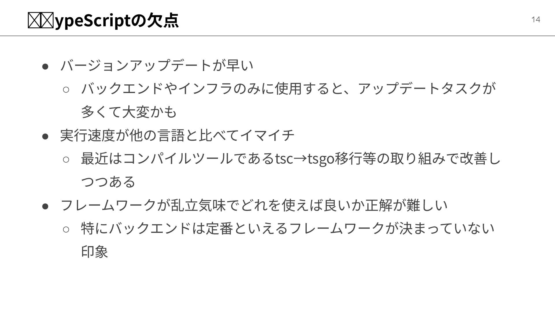 余談 - TypeScriptの⽋点 • バージョンアップデートが早い ◦ バックエンドやインフラのみに使⽤すると、アップデートタスクが 多くて⼤変かも • 実⾏速度が他の⾔語と⽐べてイマイチ