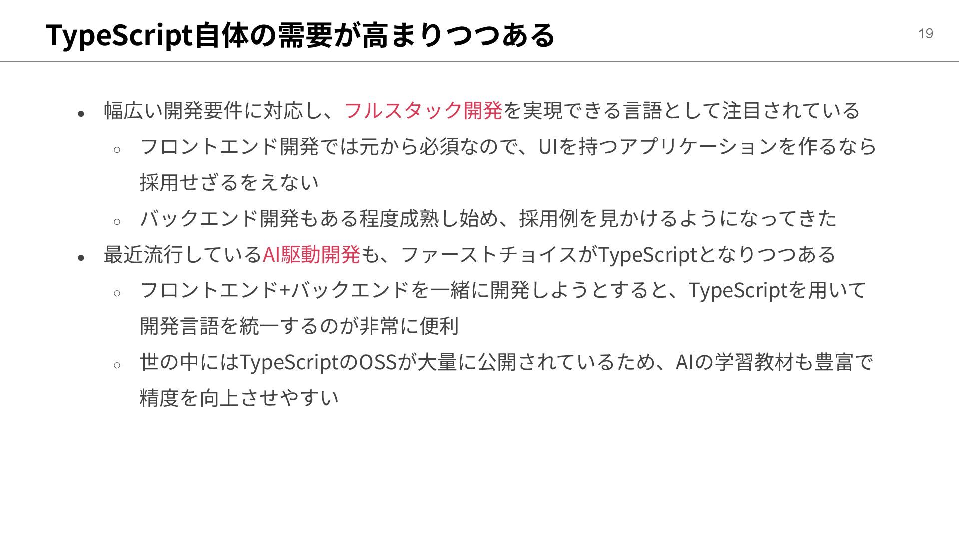 最近流⾏しているAI駆動開発も、ファーストチョイスがTypeScriptとなりつつある ◦ フロントエンド+バックエンドを⼀緒に開発しようとすると、TypeScriptを⽤いて 開発⾔語を統⼀するのが⾮常に便利 ◦ 世の中にはTypeScriptのOSSが⼤量に公開されているため、AIの学習教材も豊富で 精度を向上させやすい
