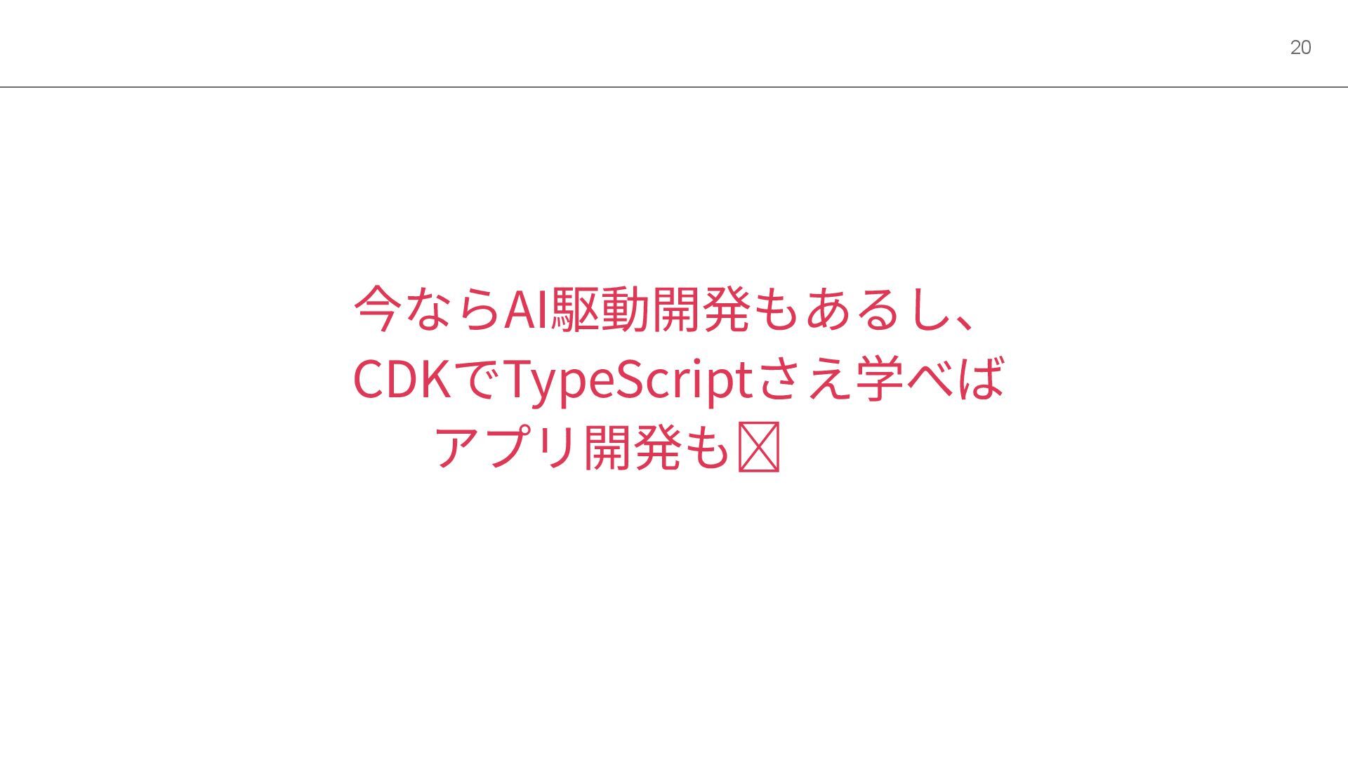 今ならAI駆動開発もあるし、 CDKでTypeScriptさえ学べば アプリ開発も余裕...? 20