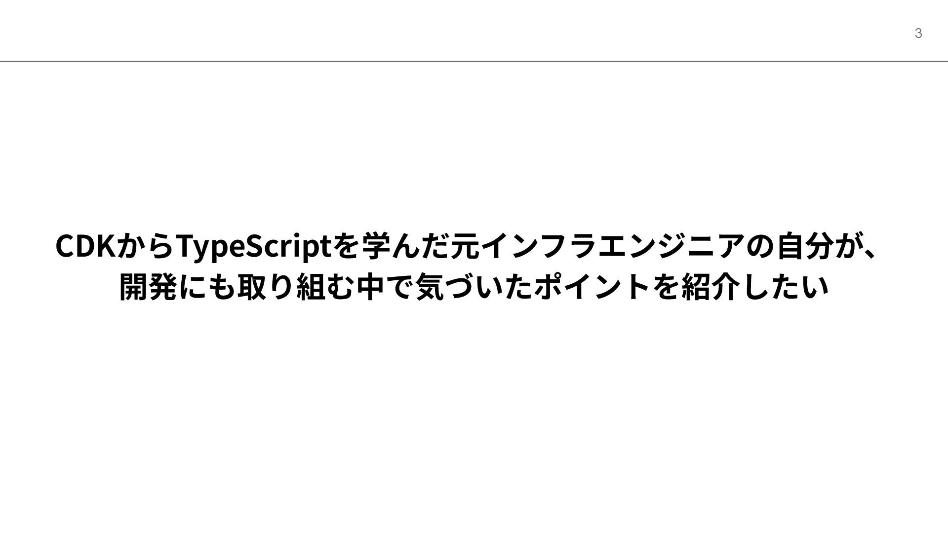 CDKからTypeScriptを学んだ元インフラエンジニアの⾃分が、 開発にも取り組む中で気づいたポイントを紹介したい 3