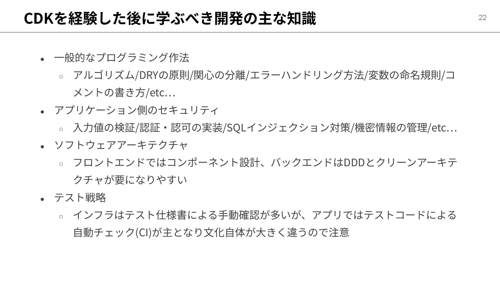 CDKを経験した後に学ぶべき開発の主な知識 22 • ⼀般的なプログラミング作法 ◦ アルゴリズム/DRYの原則/関⼼の分離/エラーハンドリング⽅法/変数の命名規則/コ メントの書き⽅/etc… • アプリケーション側のセキュリティ ◦