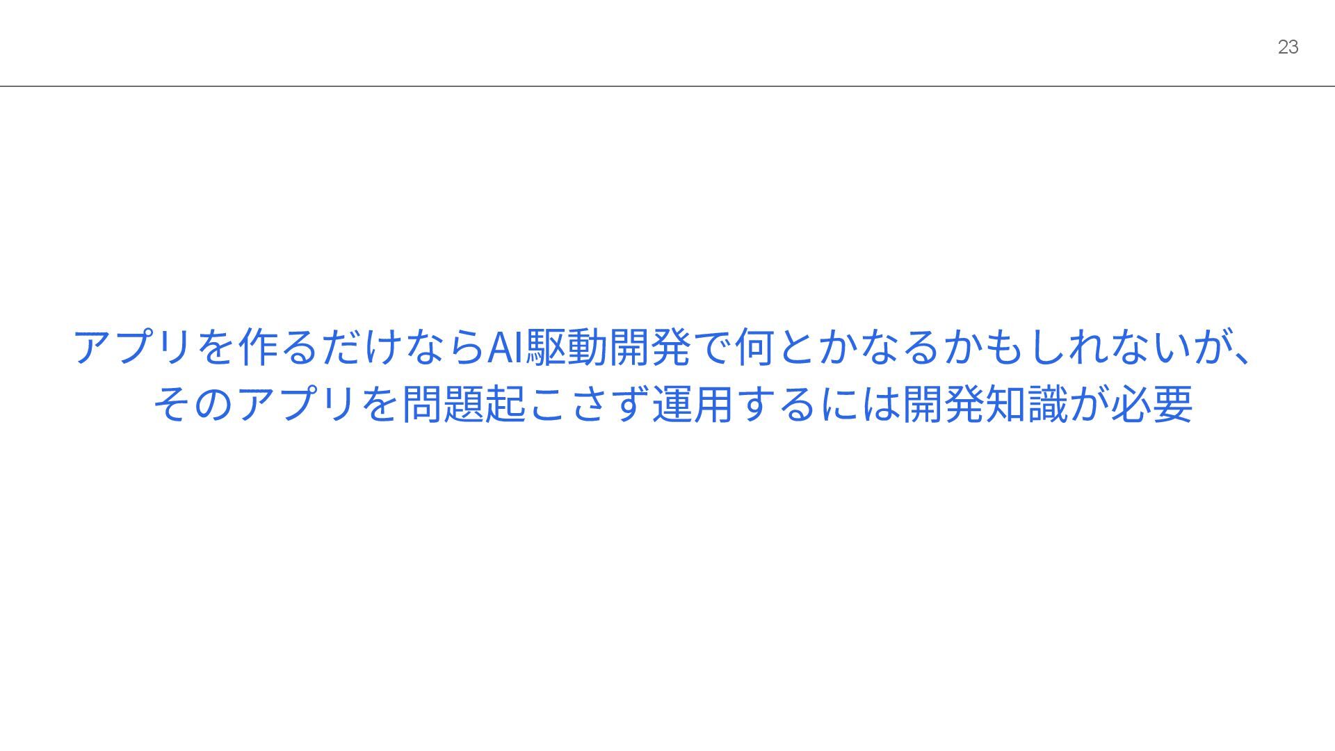 アプリを作るだけならAI駆動開発で何とかなるかもしれないが、 そのアプリを問題起こさず運⽤するには開発知識が必要 23