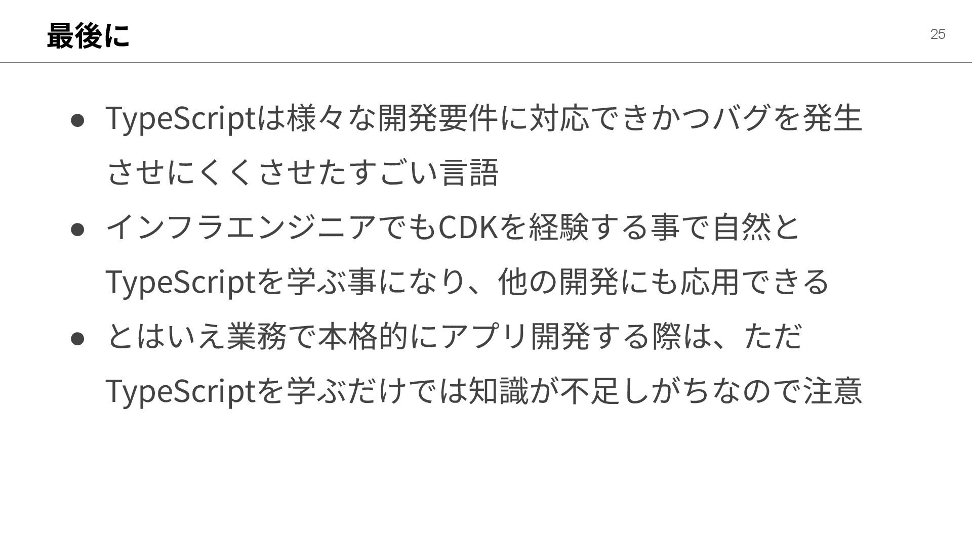最後に 25 • TypeScriptは様々な開発要件に対応できかつバグを発⽣ させにくくさせたすごい⾔語 • インフラエンジニアでもCDKを経験する事で⾃然と TypeScriptを学ぶ事になり、他の開発にも応⽤できる • とはいえ業務で本格的にアプリ開発する際は、ただ