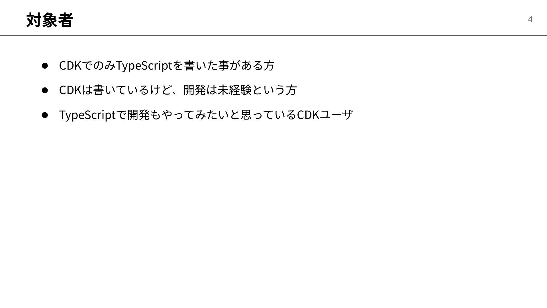 対象者 4 • CDKでのみTypeScriptを書いた事がある⽅ • CDKは書いているけど、開発は未経験という⽅ • TypeScriptで開発もやってみたいと思っているCDKユーザ