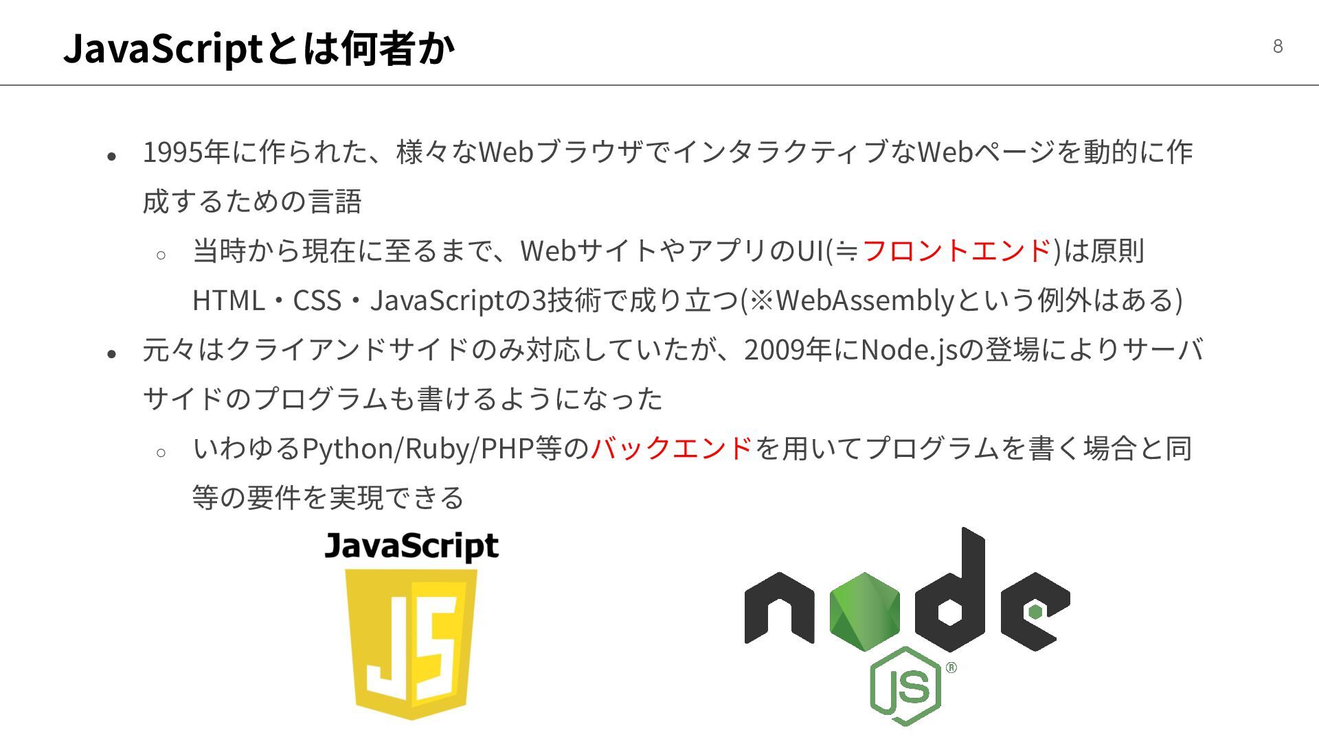 JavaScriptとは何者か • 1995年に作られた、様々なWebブラウザでインタラクティブなWebページを動的に作 成するための⾔語 ◦ 当時から現在に⾄るまで、WebサイトやアプリのUI(≒フロントエンド)は原則 HTML‧CSS‧JavaScriptの3技術で成り⽴つ(※WebAssemblyという例外はある) • 元々はクライアンドサイドのみ対応していたが、2009年にNode.jsの登場によりサーバ サイドのプログラムも書けるようになった