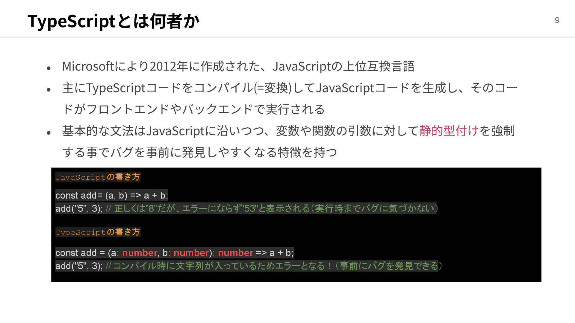JavaScriptの書き方 const add= (a, b) => a + b; add("5", 3); // 正しくは”8”だが、エラーにならず"53"と表示される(実行時までバグに気づかない) TypeScriptの書き方 const add = (a: number, b: number): number => a + b; add("5", 3); // コンパイル時に文字列が入っているためエラーとなる!(事前にバグを発見できる)