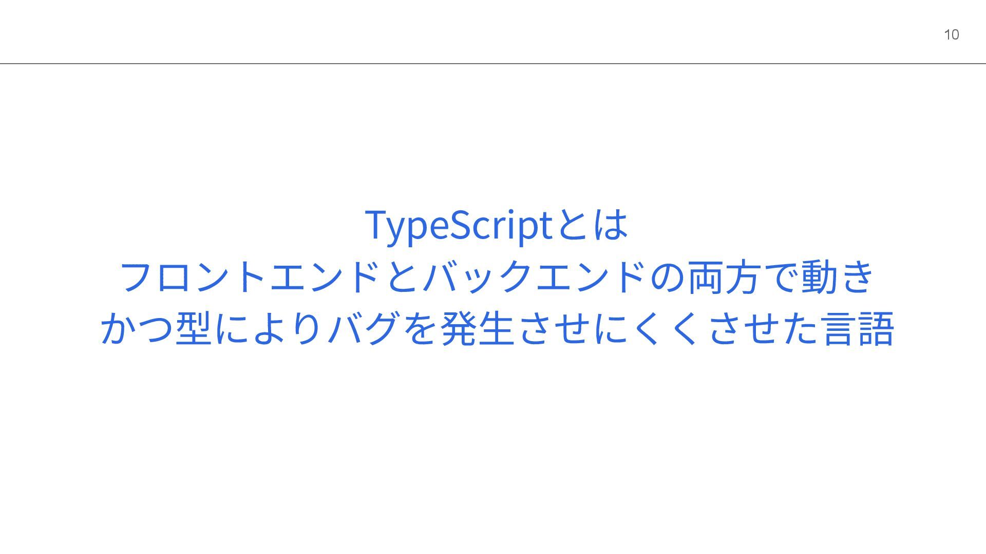 TypeScriptとは フロントエンドとバックエンドの両⽅で動き かつ型によりバグを発⽣させにくくさせた⾔語 10
