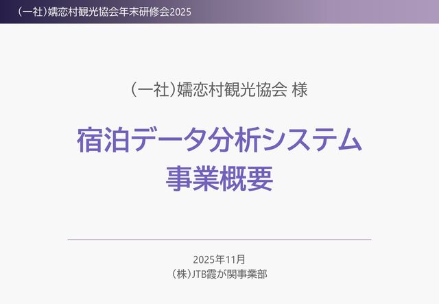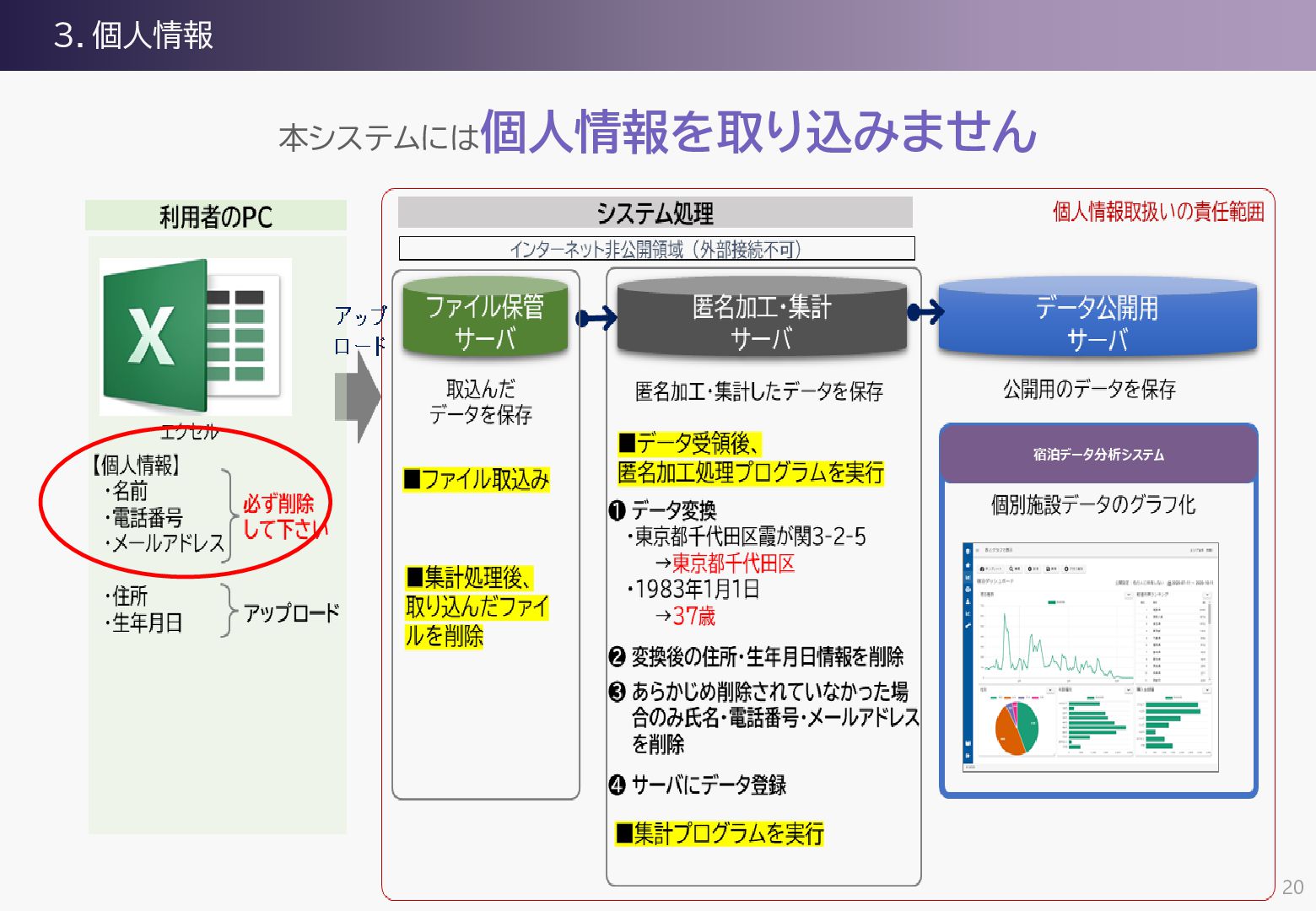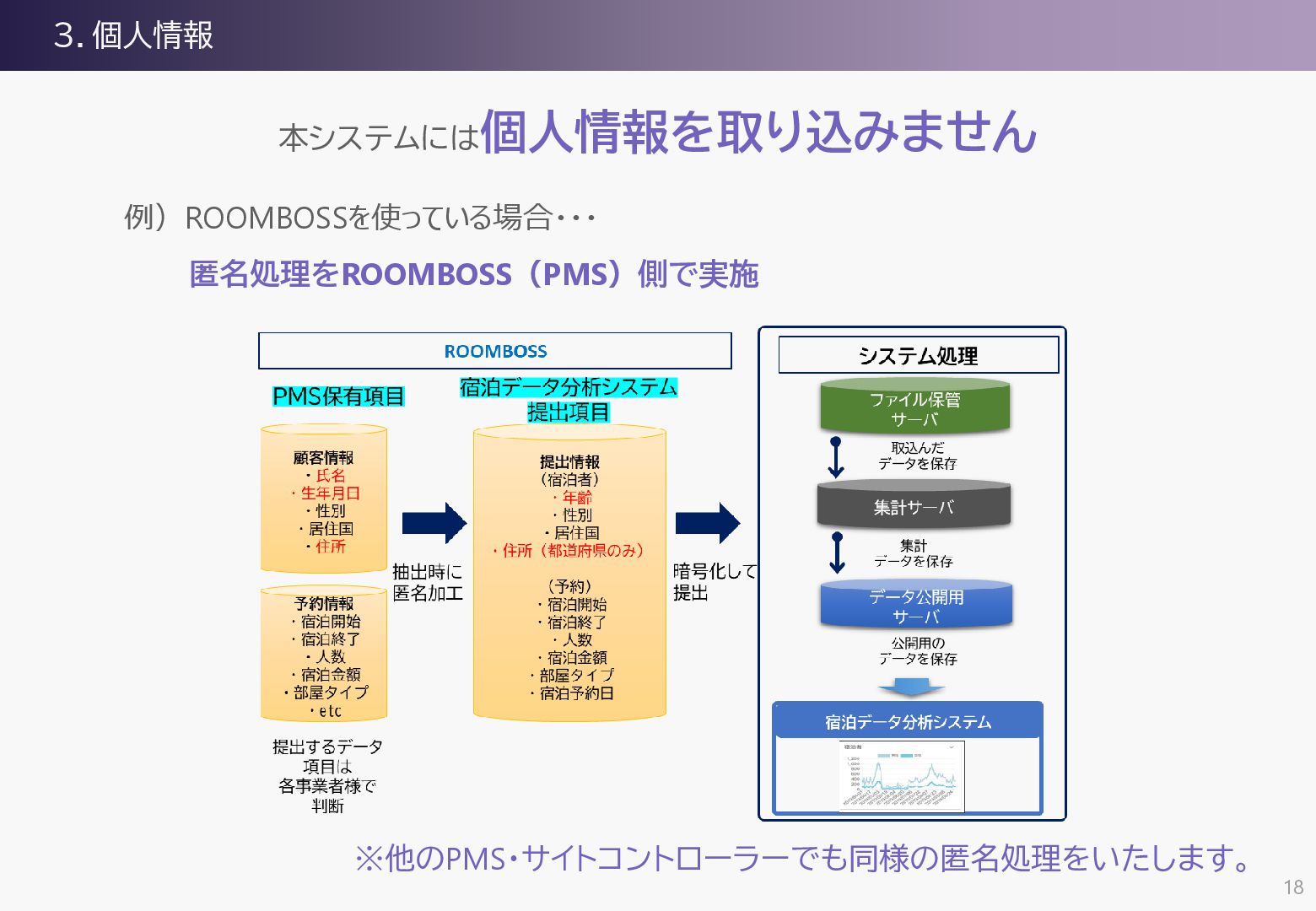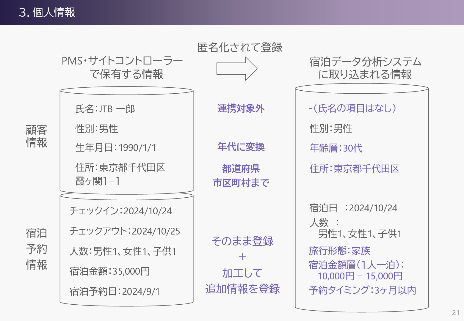 チェックイン:2024/10/24 チェックアウト:2024/10/25 人数:男性1、女性1、子供1 宿泊データ分析システム に取り込まれる情報 宿泊金額:35,000円 宿泊予約日:2024/9/1 そのまま登録 + 加工して 追加情報を登録 連携対象外 年代に変換 都道府県 市区町村まで 性別:男性 年齢層:30代 住所:東京都千代田区 宿泊日 :2024/10/24 匿名化されて登録 -(氏名の項目はなし) 人数 : 男性1、女性1、子供1 旅行形態:家族 宿泊金額層(1人一泊): 10,000円 – 15,000円 予約タイミング:3ヶ月以内 顧客 情報 宿泊 予約 情報
