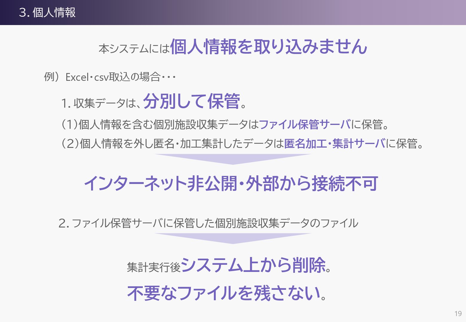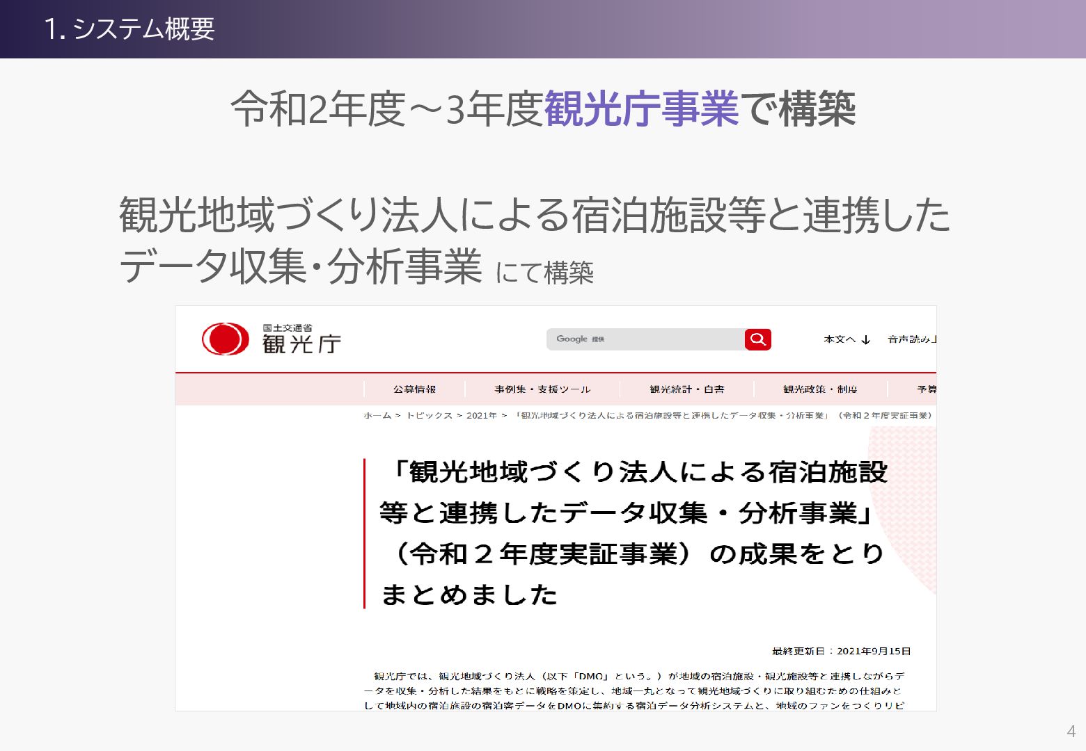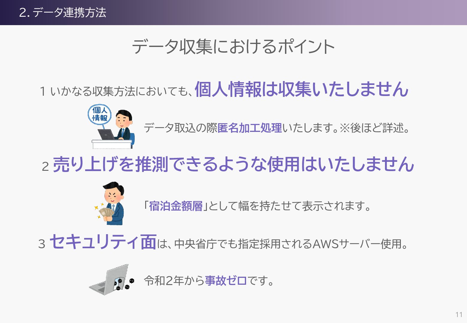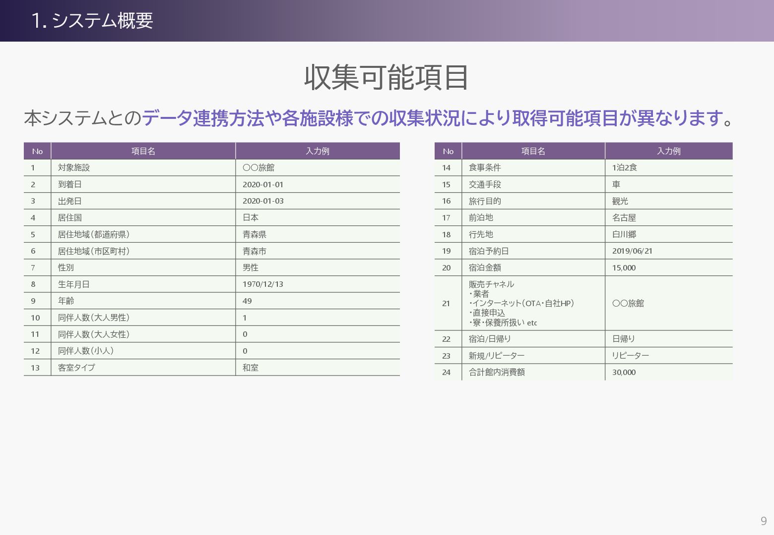 3. 9 1.システム概要 収集可能項目 本システムとのデータ連携方法や各施設様での収集状況により取得可能項目が異なります。 No 項目名 入力例 1 対象施設 ◦◦旅館