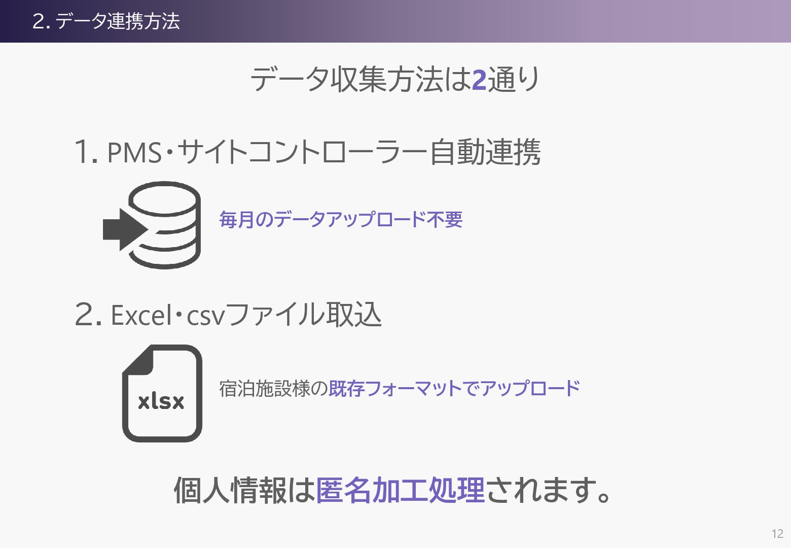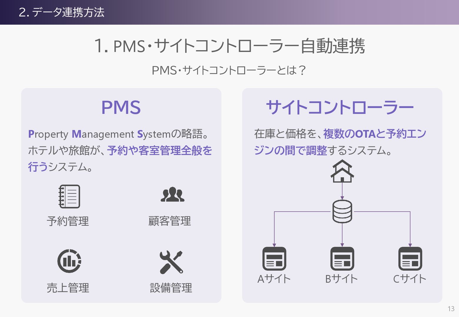 4. 13 2.データ連携方法 PMS・サイトコントローラーとは? PMS サイトコントローラー 1.PMS・サイトコントローラー自動連携 Property Management Systemの略語。 ホテルや旅館が、予約や客室管理全般を