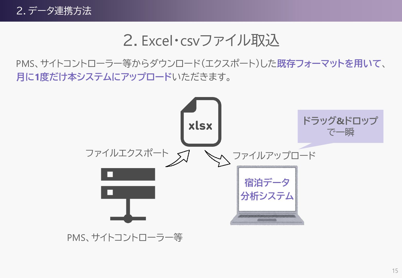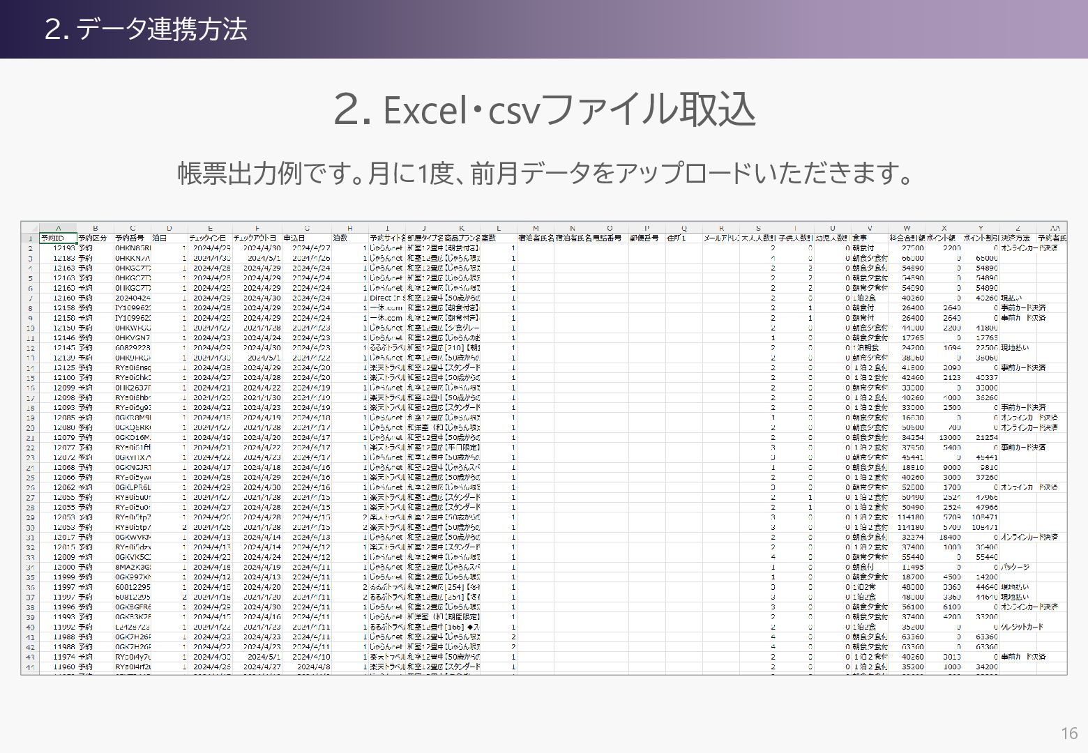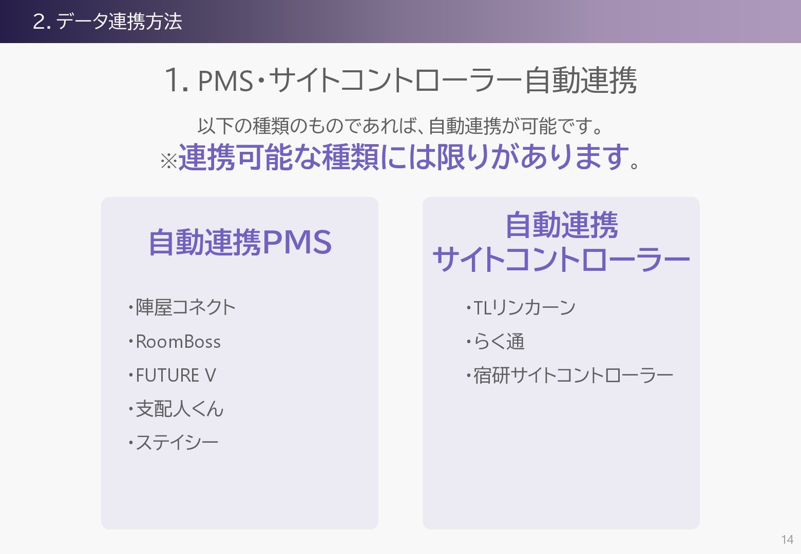 5. 14 2.データ連携方法 以下の種類のものであれば、自動連携が可能です。 ※連携可能な種類には限りがあります。 自動連携PMS ・陣屋コネクト ・RoomBoss ・FUTURE V ・支配人くん