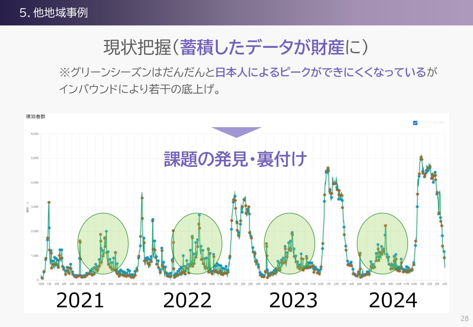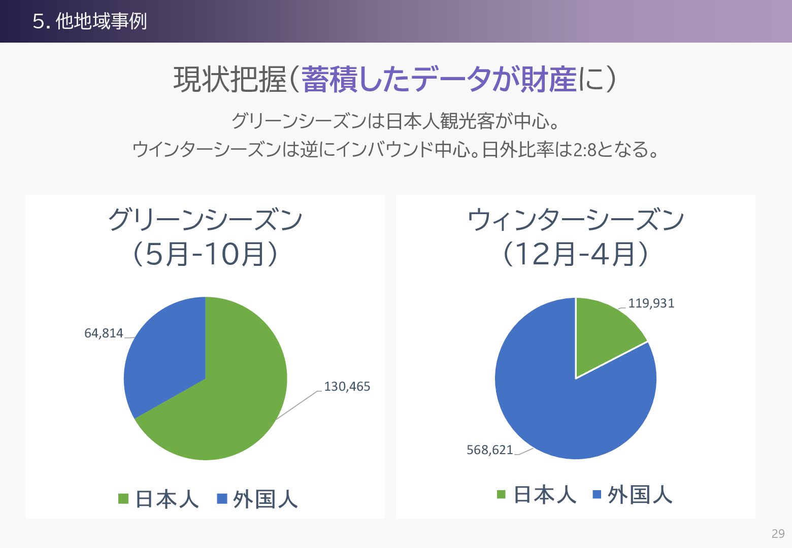 投資 SALE イベ ント 新 プラン データ グラフ化 たとえば… 閑散期対策 平日集客 新プラン集客 食歩き開発の ターゲット選定 宿の客層変更 ・・・・など 本システムでできる事=統計データとしてグラフ化、数値化。 宿泊者 情報 データに基づく意思決定へ 嬬恋村観光協会 宿泊データ 分析システム タイムリー (月次)