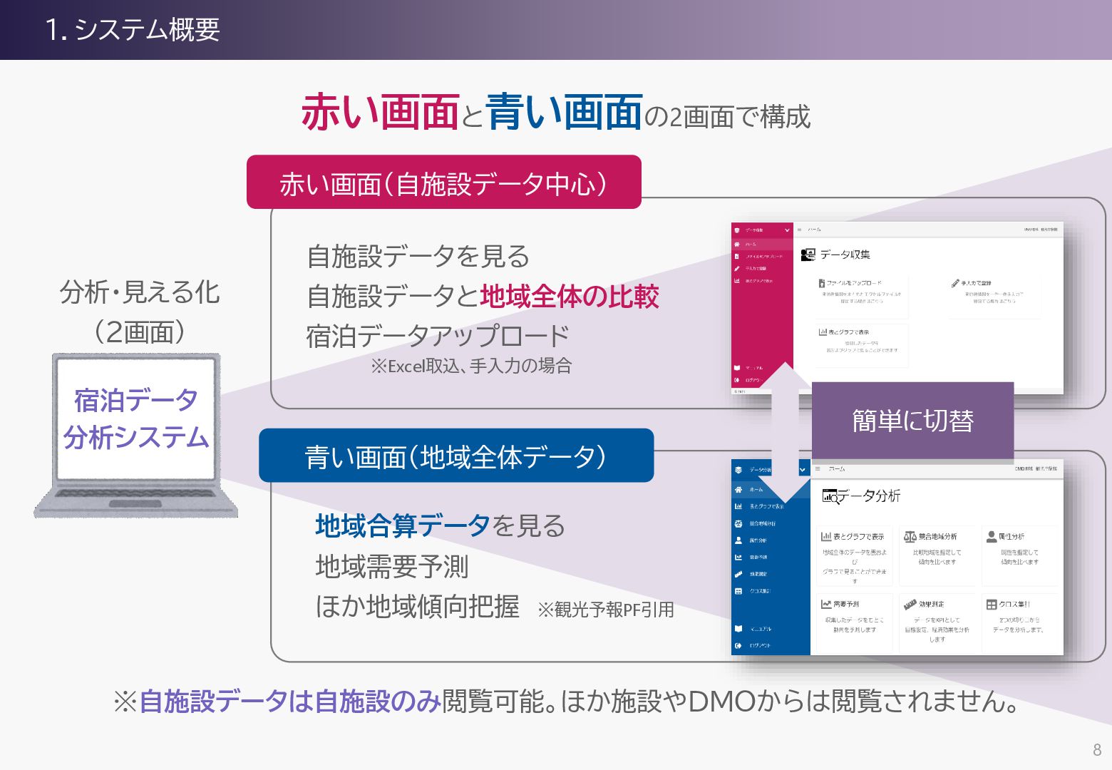 2. 8 1.システム概要 赤い画面と青い画面の2画面で構成 分析・見える化 (2画面) 地域合算データを見る 地域需要予測 ほか地域傾向把握 ※観光予報PF引用 自施設データを見る