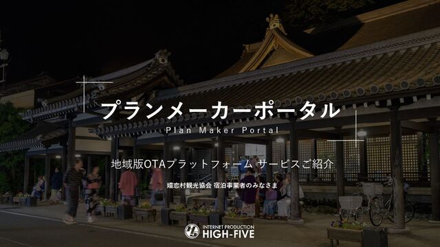 Area Tourism - わたし達 HIGH-FIVE は、地元の観光地「城崎温泉」での地域 版OTAのプラットフォーム立ち上げ〜運用サポートを2008年 からスタート。その後は他エリアである豊岡市、志賀高原な どにも展開し、成功に導いてきました。 地域が稼いで、地域に還元し、地域が育つ─。 OTAプラットフォームを通じてこのサイクルを作ることで、 地域観光の未来をより良いものにする。 そのパートナーとして、ぜひ HIGH-FIVE にご期待ください。 補助金に頼らず 地域でお金を稼ぐ 01 . HIGH-FIVE が考える地域版OTA活用の姿 滞在価値の向上で 口コミ、リピート獲得 04. 稼いだお金を 地域〜旅行者に還元 02. マーケティング人材の 育成&採用 03. 地域へ 旅行者へ プ ラ ン メ ー カ ー ポ ー タ ル ハ イ フ ァ イ ブ ハ イ フ ァ イ ブ ハ イ フ ァ イ ブ