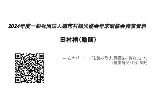 2024年度一般社団法人嬬恋村観光協会年末研修会発表資料 田村梢(動画) ← 左のバーコードを読み取り、動画をご覧ください。 (動画時間:7分15秒)