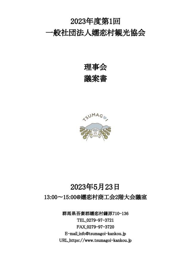1. 2023年度第1回 一般社団法人嬬恋村観光協会理事会 次第 1. 開会 2. ご挨拶 3. 議事 第1号議案