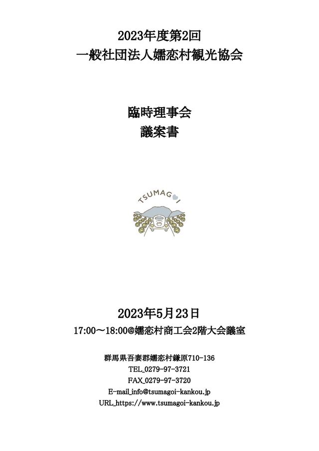 2023年度第2回 一般社団法人嬬恋村観光協会 臨時理事会 議案書 2023年5月23日 17:00〜18:00@嬬恋村商工会2階大会議室 群馬県吾妻郡嬬恋村鎌原710-136 TEL_0279-97-3721 FAX_0279-97-3720