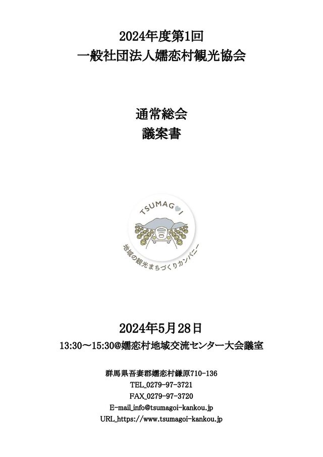 岡村会長 3. 来賓ご紹介 (1) 嬬恋村長 (2) 吾妻振興局長兼吾妻行政県税事務所長 (3) 嬬恋村副村長 (4) 嬬恋村議会正副議長 (5) 嬬恋村商工会長 (6) 嬬恋村議会観光振興特別委員会正副委員長 4. 議事 第1号議案 2023年度事業報告について 第2号議案 2023年度収支決算報告について 第3号議案 2024年度事業計画書(案)について 第4号議案 2024年度収支予算(案)について 第5号議案 役員補選(案)について 5. 閉会 (1) 塚本副会長
