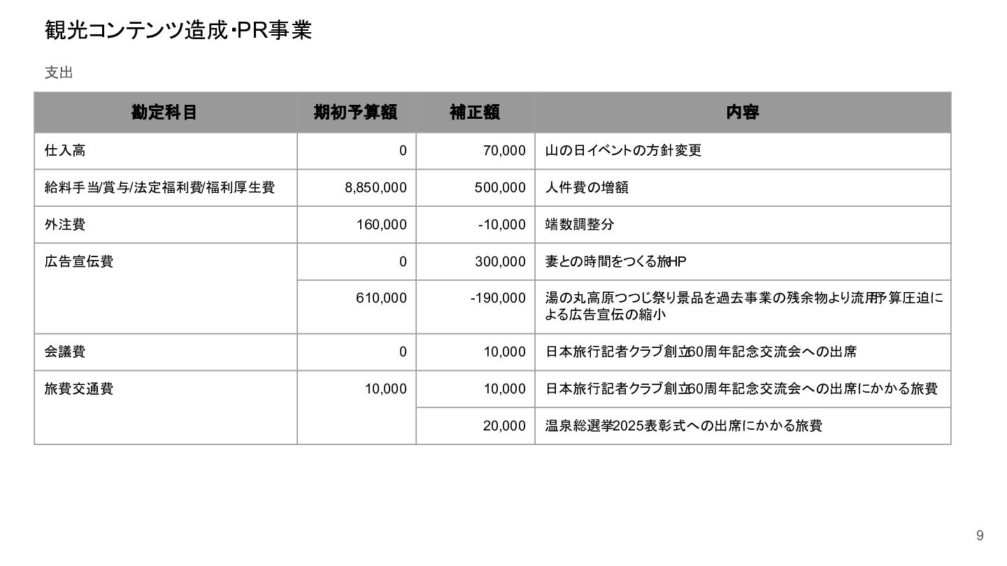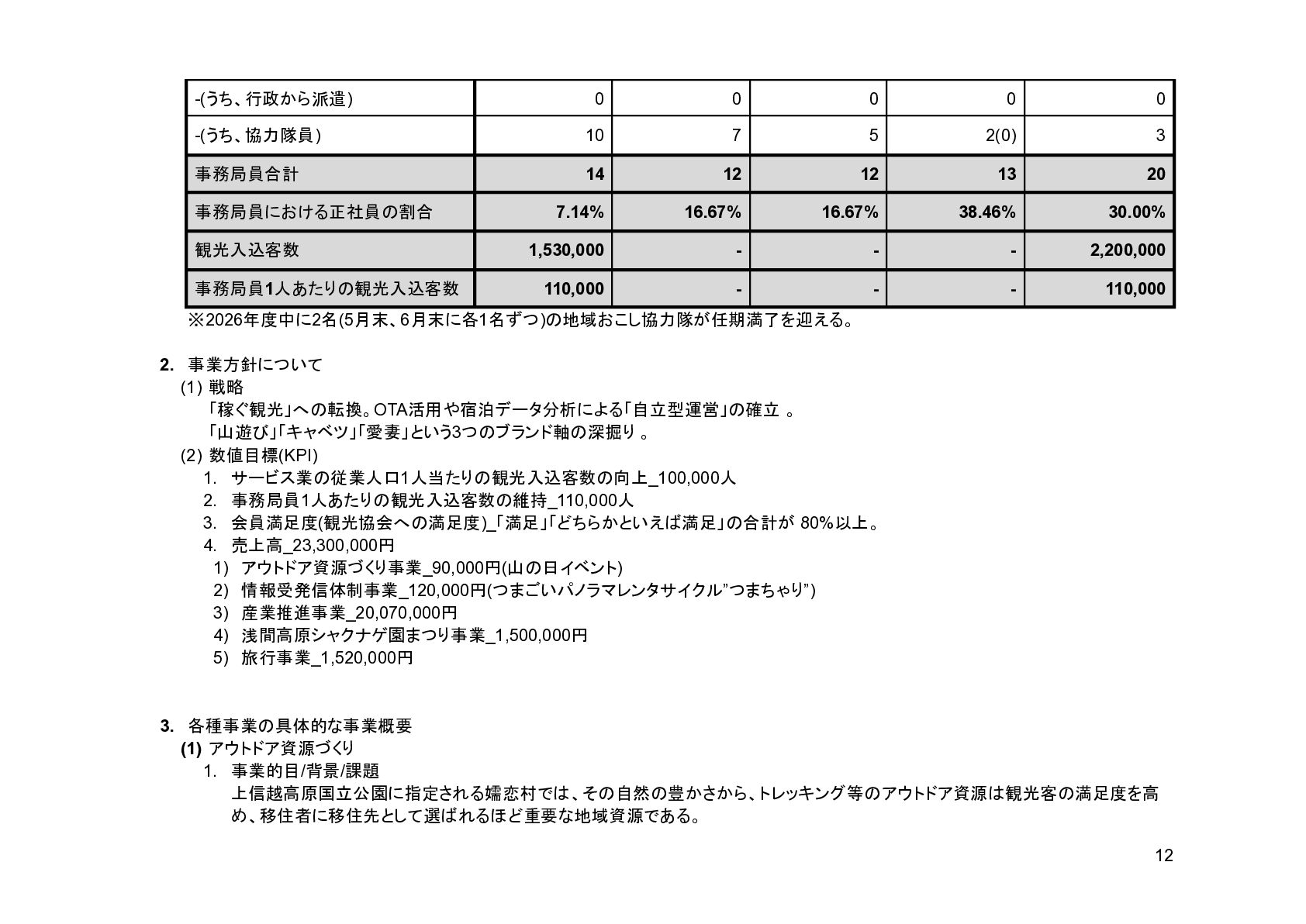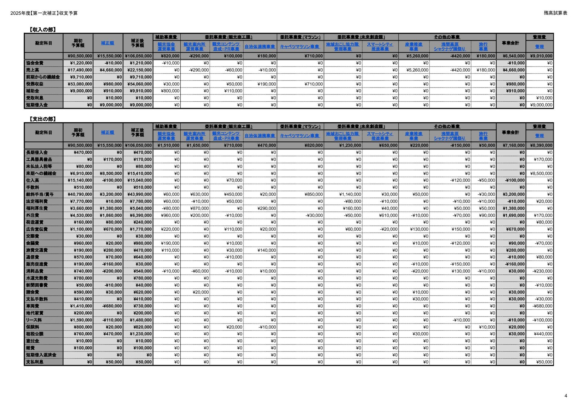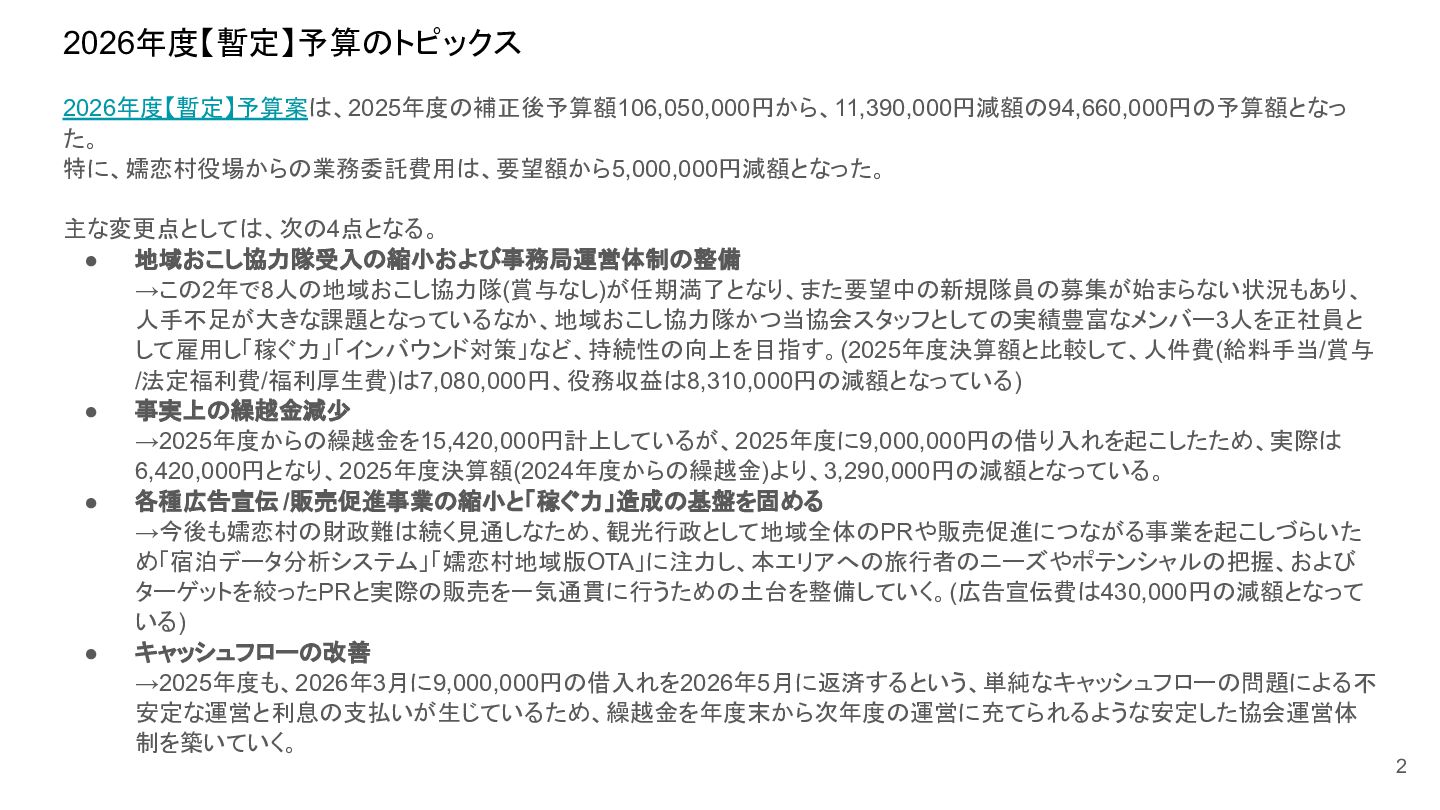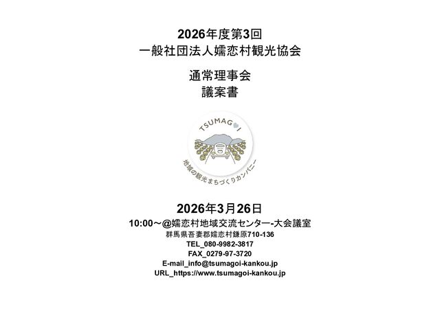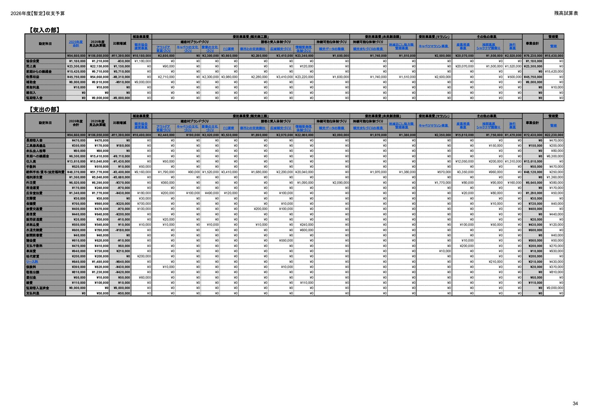 補助事業費 委託事業費 (観光商工課 ) 委託事業費 (未来創造課 ) 委託事業費 (マラソン) その他の事業 事業会計 管理費 観光協会 運営事業 嬬恋村ブランドづくり 誘客と受入体制づくり 持続可能な体制づくり 持続可能な体制づくり 地域おこし協力隊 管理事業 キャベツマラソン事業 産業推進 事業 浅間高原 シャクナゲ園祭り 旅行 事業 管理 アウトドア 資源づくり キャベツの文化 づくり 愛妻の文化 づくり FC運営 都市との交流創出 広域観光づくり 情報受発信 体制づくり 観光データの整備 観光まちづくりの推進 ¥94,660,000 ¥106,050,000 -¥11,390,000 ¥10,180,000 ¥2,800,000 ¥0 ¥2,300,000 ¥3,980,000 ¥2,280,000 ¥3,410,000 ¥23,340,000 ¥1,600,000 ¥1,740,000 ¥1,510,000 ¥2,500,000 ¥20,070,000 ¥1,500,000 ¥2,020,000 ¥79,230,000 ¥15,430,000 協会会費 ¥1,180,000 ¥1,210,000 -¥30,000 ¥1,180,000 ¥0 ¥0 ¥0 ¥0 ¥0 ¥0 ¥0 ¥0 ¥0 ¥0 ¥0 ¥0 ¥0 ¥0 ¥1,180,000 ¥0 売上高 ¥23,300,000 ¥22,150,000 ¥1,150,000 ¥0 ¥90,000 ¥0 ¥0 ¥0 ¥0 ¥0 ¥120,000 ¥0 ¥0 ¥0 ¥0 ¥20,070,000 ¥1,500,000 ¥1,520,000 ¥23,300,000 ¥0 前期からの繰越金 ¥15,420,000 ¥9,710,000 ¥5,710,000 ¥0 ¥0 ¥0 ¥0 ¥0 ¥0 ¥0 ¥0 ¥0 ¥0 ¥0 ¥0 ¥0 ¥0 ¥0 ¥0 ¥15,420,000 役務収益 ¥45,750,000 ¥54,060,000 -¥8,310,000 ¥0 ¥2,710,000 ¥0 ¥2,300,000 ¥3,980,000 ¥2,280,000 ¥3,410,000 ¥23,220,000 ¥1,600,000 ¥1,740,000 ¥1,510,000 ¥2,500,000 ¥0 ¥0 ¥500,000 ¥45,750,000 ¥0 補助金 ¥9,000,000 ¥9,910,000 -¥910,000 ¥9,000,000 ¥0 ¥0 ¥0 ¥0 ¥0 ¥0 ¥0 ¥0 ¥0 ¥0 ¥0 ¥0 ¥0 ¥0 ¥9,000,000 ¥0 受取利息 ¥10,000 ¥10,000 ¥0 ¥0 ¥0 ¥0 ¥0 ¥0 ¥0 ¥0 ¥0 ¥0 ¥0 ¥0 ¥0 ¥0 ¥0 ¥0 ¥0 ¥10,000 雑収入 ¥0 ¥0 ¥0 ¥0 ¥0 ¥0 ¥0 ¥0 ¥0 ¥0 ¥0 ¥0 ¥0 ¥0 ¥0 ¥0 ¥0 ¥0 ¥0 ¥0 短期借入金 ¥0 ¥9,000,000 -¥9,000,000 ¥0 ¥0 ¥0 ¥0 ¥0 ¥0 ¥0 ¥0 ¥0 ¥0 ¥0 ¥0 ¥0 ¥0 ¥0 ¥0 ¥0 【支出の部】 勘定科目 2026年度 合計 2025年度 見込決算額 比較増減 補助事業費 委託事業費 (観光商工課 ) 委託事業費 (未来創造課 ) 委託事業費 (マラソン) その他の事業 事業会計 管理費 観光協会 運営事業 嬬恋村ブランドづくり 誘客と受入体制づくり 持続可能な体制づくり 持続可能な体制づくり 地域おこし協力隊 管理事業 キャベツマラソン事業 産業推進 事業 浅間高原 シャクナゲ園祭り 旅行 事業 管理 アウトドア 資源づくり キャベツの文化 づくり 愛妻の文化 づくり FC運営 都市との交流創出 広域観光づくり 情報受発信 体制づくり 観光データの整備 観光まちづくりの推進 ¥94,660,000 ¥106,050,000 -¥11,390,000 ¥10,490,000 ¥2,440,000 ¥190,000 ¥2,020,000 ¥3,530,000 ¥1,890,000 ¥2,970,000 ¥22,080,000 ¥2,090,000 ¥1,970,000 ¥1,380,000 ¥2,350,000 ¥15,810,000 ¥1,750,000 ¥1,470,000 ¥72,430,000 ¥22,230,000 長期借入金 ¥470,000 ¥470,000 ¥0 ¥0 ¥0 ¥0 ¥0 ¥0 ¥0 ¥0 ¥0 ¥0 ¥0 ¥0 ¥0 ¥0 ¥0 ¥0 ¥0 ¥470,000 工具器具備品 ¥350,000 ¥170,000 ¥180,000 ¥0 ¥0 ¥0 ¥0 ¥0 ¥0 ¥0 ¥0 ¥0 ¥0 ¥0 ¥0 ¥0 ¥150,000 ¥0 ¥150,000 ¥200,000 未払法人税等 ¥80,000 ¥80,000 ¥0 ¥0 ¥0 ¥0 ¥0 ¥0 ¥0 ¥0 ¥0 ¥0 ¥0 ¥0 ¥0 ¥0 ¥0 ¥0 ¥0 ¥80,000 来期への繰越金 ¥6,300,000 ¥15,410,000 -¥9,110,000 ¥0 ¥0 ¥0 ¥0 ¥0 ¥0 ¥0 ¥0 ¥0 ¥0 ¥0 ¥0 ¥0 ¥0 ¥0 ¥0 ¥6,300,000 仕入高 ¥13,610,000 ¥15,040,000 -¥1,430,000 ¥0 ¥50,000 ¥0 ¥0 ¥0 ¥0 ¥0 ¥0 ¥0 ¥0 ¥0 ¥0 ¥12,050,000 ¥200,000 ¥1,310,000 ¥13,610,000 ¥0 手数料 ¥520,000 ¥510,000 ¥10,000 ¥50,000 ¥0 ¥0 ¥0 ¥0 ¥0 ¥0 ¥0 ¥0 ¥0 ¥0 ¥0 ¥0 ¥0 ¥0 ¥50,000 ¥470,000 給料手当/賞与/法定福利費 ¥48,370,000 ¥51,770,000 -¥3,400,000 ¥9,160,000 ¥1,790,000 ¥90,000 ¥1,520,000 ¥3,410,000 ¥1,680,000 ¥2,200,000 ¥20,040,000 ¥0 ¥1,970,000 ¥1,380,000 ¥570,000 ¥3,350,000 ¥960,000 ¥0 ¥48,120,000 ¥250,000 福利厚生費 ¥1,360,000 ¥5,040,000 -¥3,680,000 ¥0 ¥0 ¥0 ¥0 ¥0 ¥0 ¥0 ¥0 ¥0 ¥0 ¥0 ¥0 ¥0 ¥0 ¥0 ¥0 ¥1,360,000 外注費 ¥6,020,000 ¥6,390,000 -¥370,000 ¥0 ¥360,000 ¥0 ¥0 ¥0 ¥0 ¥0 ¥1,090,000 ¥2,090,000 ¥0 ¥0 ¥1,770,000 ¥80,000 ¥90,000 ¥160,000 ¥5,640,000 ¥380,000 荷造運賃 ¥170,000 ¥240,000 -¥70,000 ¥0 ¥0 ¥0 ¥0 ¥0 ¥0 ¥0 ¥0 ¥0 ¥0 ¥0 ¥0 ¥0 ¥0 ¥0 ¥0 ¥170,000 広告宣伝費 ¥1,340,000 ¥1,770,000 -¥430,000 ¥180,000 ¥200,000 ¥100,000 ¥490,000 ¥120,000 ¥0 ¥100,000 ¥0 ¥0 ¥0 ¥0 ¥0 ¥20,000 ¥80,000 ¥0 ¥1,290,000 ¥50,000 交際費 ¥30,000 ¥30,000 ¥0 ¥30,000 ¥0 ¥0 ¥0 ¥0 ¥0 ¥0 ¥0 ¥0 ¥0 ¥0 ¥0 ¥0 ¥0 ¥0 ¥30,000 ¥0 会議費 ¥760,000 ¥980,000 -¥220,000 ¥700,000 ¥0 ¥0 ¥0 ¥0 ¥0 ¥10,000 ¥0 ¥0 ¥0 ¥0 ¥0 ¥0 ¥10,000 ¥0 ¥720,000 ¥40,000 旅費交通費 ¥400,000 ¥470,000 -¥70,000 ¥100,000 ¥0 ¥0 ¥0 ¥0 ¥200,000 ¥100,000 ¥0 ¥0 ¥0 ¥0 ¥0 ¥0 ¥0 ¥0 ¥400,000 ¥0 通信費 ¥440,000 ¥640,000 -¥200,000 ¥0 ¥0 ¥0 ¥0 ¥0 ¥0 ¥0 ¥0 ¥0 ¥0 ¥0 ¥0 ¥0 ¥0 ¥0 ¥0 ¥440,000 販売促進費 ¥20,000 ¥30,000 -¥10,000 ¥0 ¥20,000 ¥0 ¥0 ¥0 ¥0 ¥0 ¥0 ¥0 ¥0 ¥0 ¥0 ¥0 ¥0 ¥0 ¥20,000 ¥0 消耗品費 ¥550,000 ¥540,000 ¥10,000 ¥10,000 ¥10,000 ¥0 ¥10,000 ¥0 ¥10,000 ¥0 ¥240,000 ¥0 ¥0 ¥0 ¥0 ¥100,000 ¥50,000 ¥0 ¥430,000 ¥120,000 水道光熱費 ¥600,000 ¥780,000 -¥180,000 ¥0 ¥0 ¥0 ¥0 ¥0 ¥0 ¥0 ¥600,000 ¥0 ¥0 ¥0 ¥0 ¥0 ¥0 ¥0 ¥600,000 ¥0 新聞図書費 ¥40,000 ¥40,000 ¥0 ¥0 ¥0 ¥0 ¥0 ¥0 ¥0 ¥0 ¥0 ¥0 ¥0 ¥0 ¥0 ¥0 ¥0 ¥0 ¥0 ¥40,000 諸会費 ¥610,000 ¥620,000 -¥10,000 ¥0 ¥0 ¥0 ¥0 ¥0 ¥0 ¥550,000 ¥0 ¥0 ¥0 ¥0 ¥0 ¥10,000 ¥0 ¥0 ¥560,000 ¥50,000 支払手数料 ¥470,000 ¥410,000 ¥60,000 ¥0 ¥0 ¥0 ¥0 ¥0 ¥0 ¥0 ¥0 ¥0 ¥0 ¥0 ¥0 ¥200,000 ¥0 ¥0 ¥200,000 ¥270,000 車両費 ¥940,000 ¥730,000 ¥210,000 ¥0