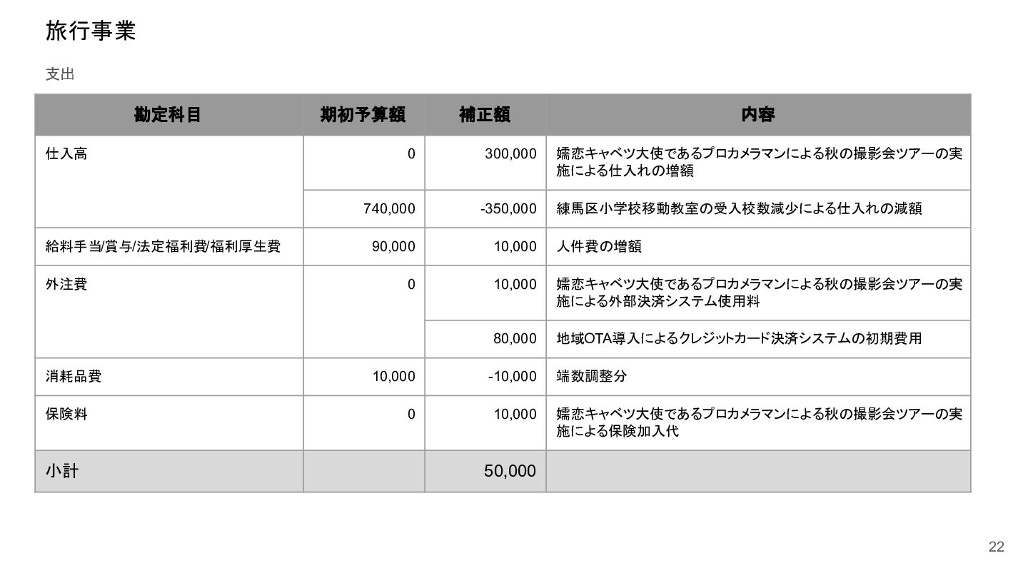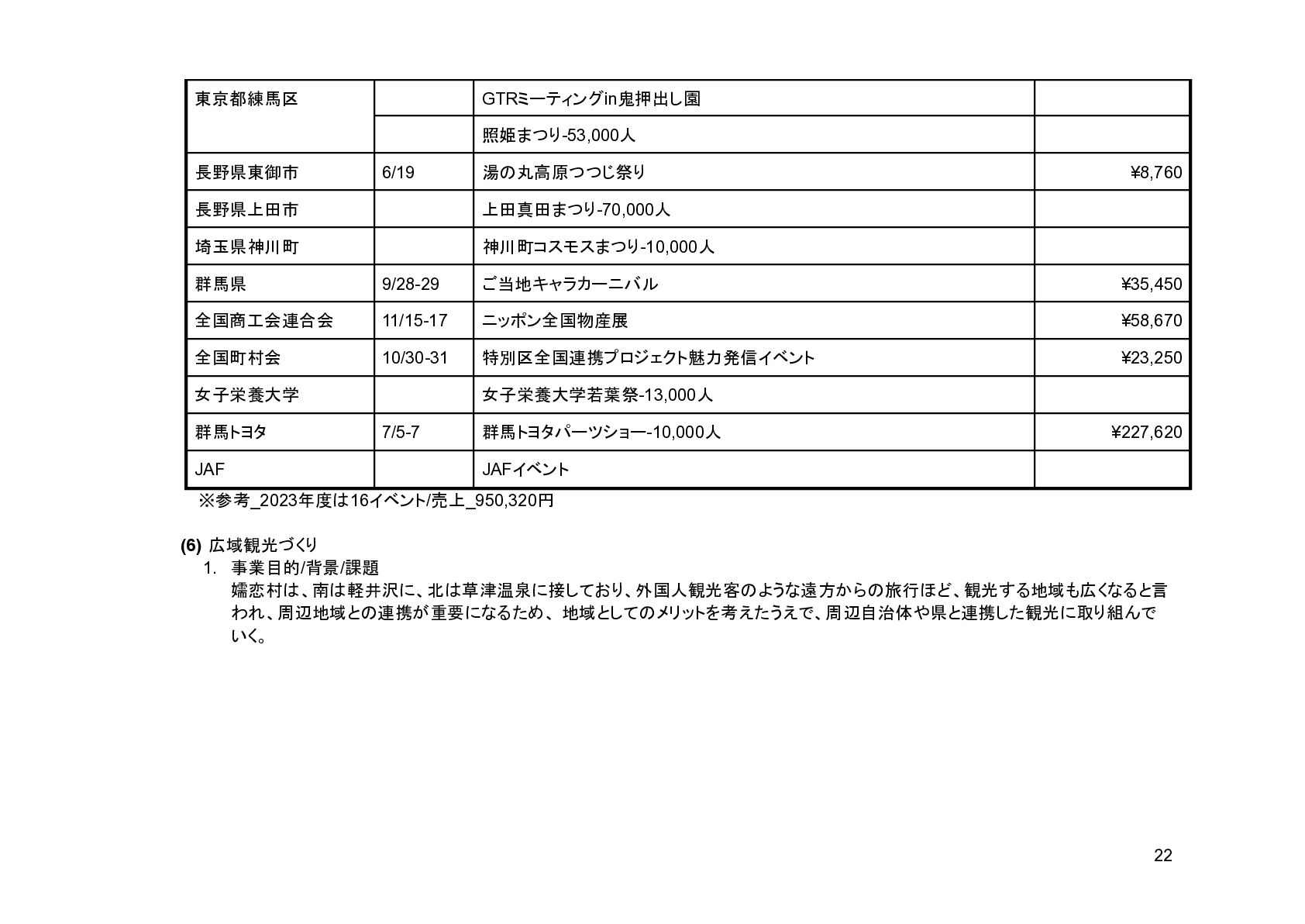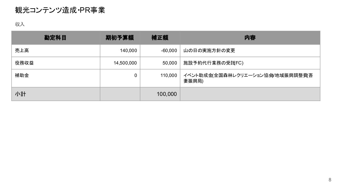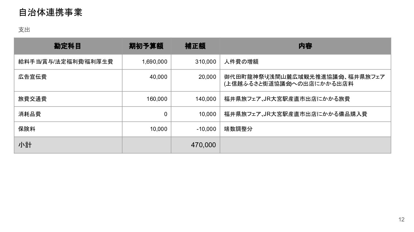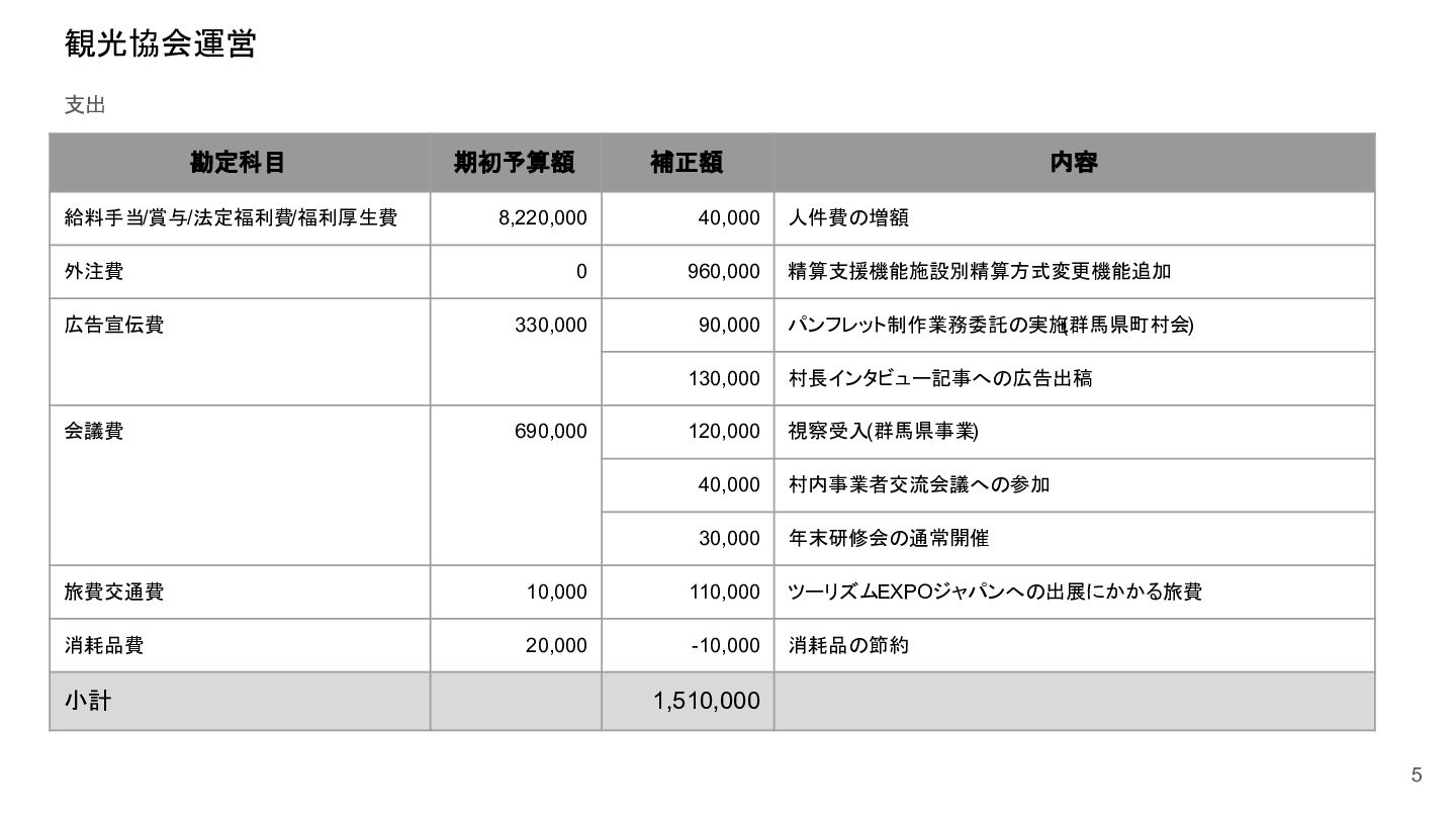 補助事業費 委託事業費 (観光商工課 ) 委託事業費 (未来創造課 ) 委託事業費 (マラソン) その他の事業 事業会計 管理費 観光協会 運営事業 嬬恋村ブランドづくり 誘客と受入体制づくり 持続可能な体制づくり 持続可能な体制づくり 地域おこし協力隊 管理事業 キャベツマラソン事業 産業推進 事業 浅間高原 シャクナゲ園祭り 旅行 事業 管理 アウトドア 資源づくり キャベツの文化 づくり 愛妻の文化 づくり FC運営 都市との交流創出 広域観光づくり 情報受発信 体制づくり 観光データの整備 観光まちづくりの推進 ¥94,660,000 ¥106,050,000 -¥11,390,000 ¥10,180,000 ¥2,800,000 ¥0 ¥2,300,000 ¥3,980,000 ¥2,280,000 ¥3,410,000 ¥23,340,000 ¥1,600,000 ¥1,740,000 ¥1,510,000 ¥2,500,000 ¥20,070,000 ¥1,500,000 ¥2,020,000 ¥79,230,000 ¥15,430,000 協会会費 ¥1,180,000 ¥1,210,000 -¥30,000 ¥1,180,000 ¥0 ¥0 ¥0 ¥0 ¥0 ¥0 ¥0 ¥0 ¥0 ¥0 ¥0 ¥0 ¥0 ¥0 ¥1,180,000 ¥0 売上高 ¥23,300,000 ¥22,150,000 ¥1,150,000 ¥0 ¥90,000 ¥0 ¥0 ¥0 ¥0 ¥0 ¥120,000 ¥0 ¥0 ¥0 ¥0 ¥20,070,000 ¥1,500,000 ¥1,520,000 ¥23,300,000 ¥0 前期からの繰越金 ¥15,420,000 ¥9,710,000 ¥5,710,000 ¥0 ¥0 ¥0 ¥0 ¥0 ¥0 ¥0 ¥0 ¥0 ¥0 ¥0 ¥0 ¥0 ¥0 ¥0 ¥0 ¥15,420,000 役務収益 ¥45,750,000 ¥54,060,000 -¥8,310,000 ¥0 ¥2,710,000 ¥0 ¥2,300,000 ¥3,980,000 ¥2,280,000 ¥3,410,000 ¥23,220,000 ¥1,600,000 ¥1,740,000 ¥1,510,000 ¥2,500,000 ¥0 ¥0 ¥500,000 ¥45,750,000 ¥0 補助金 ¥9,000,000 ¥9,910,000 -¥910,000 ¥9,000,000 ¥0 ¥0 ¥0 ¥0 ¥0 ¥0 ¥0 ¥0 ¥0 ¥0 ¥0 ¥0 ¥0 ¥0 ¥9,000,000 ¥0 受取利息 ¥10,000 ¥10,000 ¥0 ¥0 ¥0 ¥0 ¥0 ¥0 ¥0 ¥0 ¥0 ¥0 ¥0 ¥0 ¥0 ¥0 ¥0 ¥0 ¥0 ¥10,000 雑収入 ¥0 ¥0 ¥0 ¥0 ¥0 ¥0 ¥0 ¥0 ¥0 ¥0 ¥0 ¥0 ¥0 ¥0 ¥0 ¥0 ¥0 ¥0 ¥0 ¥0 短期借入金 ¥0 ¥9,000,000 -¥9,000,000 ¥0 ¥0 ¥0 ¥0 ¥0 ¥0 ¥0 ¥0 ¥0 ¥0 ¥0 ¥0 ¥0 ¥0 ¥0 ¥0 ¥0 【支出の部】 勘定科目 2026年度 合計 2025年度 見込決算額 比較増減 補助事業費 委託事業費 (観光商工課 ) 委託事業費 (未来創造課 ) 委託事業費 (マラソン) その他の事業 事業会計 管理費 観光協会 運営事業 嬬恋村ブランドづくり 誘客と受入体制づくり 持続可能な体制づくり 持続可能な体制づくり 地域おこし協力隊 管理事業 キャベツマラソン事業 産業推進 事業 浅間高原 シャクナゲ園祭り 旅行 事業 管理 アウトドア 資源づくり キャベツの文化 づくり 愛妻の文化 づくり FC運営 都市との交流創出 広域観光づくり 情報受発信 体制づくり 観光データの整備 観光まちづくりの推進 ¥94,660,000 ¥106,050,000 -¥11,390,000 ¥10,490,000 ¥2,440,000 ¥190,000 ¥2,020,000 ¥3,530,000 ¥1,890,000 ¥2,970,000 ¥22,080,000 ¥2,090,000 ¥1,970,000 ¥1,380,000 ¥2,350,000 ¥15,810,000 ¥1,750,000 ¥1,470,000 ¥72,430,000 ¥22,230,000 長期借入金 ¥470,000 ¥470,000 ¥0 ¥0 ¥0 ¥0 ¥0 ¥0 ¥0 ¥0 ¥0 ¥0 ¥0 ¥0 ¥0 ¥0 ¥0 ¥0 ¥0 ¥470,000 工具器具備品 ¥350,000 ¥170,000 ¥180,000 ¥0 ¥0 ¥0 ¥0 ¥0 ¥0 ¥0 ¥0 ¥0 ¥0 ¥0 ¥0 ¥0 ¥150,000 ¥0 ¥150,000 ¥200,000 未払法人税等 ¥80,000 ¥80,000 ¥0 ¥0 ¥0 ¥0 ¥0 ¥0 ¥0 ¥0 ¥0 ¥0 ¥0 ¥0 ¥0 ¥0 ¥0 ¥0 ¥0 ¥80,000 来期への繰越金 ¥6,300,000 ¥15,410,000 -¥9,110,000 ¥0 ¥0 ¥0 ¥0 ¥0 ¥0 ¥0 ¥0 ¥0 ¥0 ¥0 ¥0 ¥0 ¥0 ¥0 ¥0 ¥6,300,000 仕入高 ¥13,610,000 ¥15,040,000 -¥1,430,000 ¥0 ¥50,000 ¥0 ¥0 ¥0 ¥0 ¥0 ¥0 ¥0 ¥0 ¥0 ¥0 ¥12,050,000 ¥200,000 ¥1,310,000 ¥13,610,000 ¥0 手数料 ¥520,000 ¥510,000 ¥10,000 ¥50,000 ¥0 ¥0 ¥0 ¥0 ¥0 ¥0 ¥0 ¥0 ¥0 ¥0 ¥0 ¥0 ¥0 ¥0 ¥50,000 ¥470,000 給料手当/賞与/法定福利費 ¥48,370,000 ¥51,770,000 -¥3,400,000 ¥9,160,000 ¥1,790,000 ¥90,000 ¥1,520,000 ¥3,410,000 ¥1,680,000 ¥2,200,000 ¥20,040,000 ¥0 ¥1,970,000 ¥1,380,000 ¥570,000 ¥3,350,000 ¥960,000 ¥0 ¥48,120,000 ¥250,000 福利厚生費 ¥1,360,000 ¥5,040,000 -¥3,680,000 ¥0 ¥0 ¥0 ¥0 ¥0 ¥0 ¥0 ¥0 ¥0 ¥0 ¥0 ¥0 ¥0 ¥0 ¥0 ¥0 ¥1,360,000 外注費 ¥6,020,000 ¥6,390,000 -¥370,000 ¥0 ¥360,000 ¥0 ¥0 ¥0 ¥0 ¥0 ¥1,090,000 ¥2,090,000 ¥0 ¥0 ¥1,770,000 ¥80,000 ¥90,000 ¥160,000 ¥5,640,000 ¥380,000 荷造運賃 ¥170,000 ¥240,000 -¥70,000 ¥0 ¥0 ¥0 ¥0 ¥0 ¥0 ¥0 ¥0 ¥0 ¥0 ¥0 ¥0 ¥0 ¥0 ¥0 ¥0 ¥170,000 広告宣伝費 ¥1,340,000 ¥1,770,000 -¥430,000 ¥180,000 ¥200,000 ¥100,000 ¥490,000 ¥120,000 ¥0 ¥100,000 ¥0 ¥0 ¥0 ¥0 ¥0 ¥20,000 ¥80,000 ¥0 ¥1,290,000 ¥50,000 交際費 ¥30,000 ¥30,000 ¥0 ¥30,000 ¥0 ¥0 ¥0 ¥0 ¥0 ¥0 ¥0 ¥0 ¥0 ¥0 ¥0 ¥0 ¥0 ¥0 ¥30,000 ¥0 会議費 ¥760,000 ¥980,000 -¥220,000 ¥700,000 ¥0 ¥0 ¥0 ¥0 ¥0 ¥10,000 ¥0 ¥0 ¥0 ¥0 ¥0 ¥0 ¥10,000 ¥0 ¥720,000 ¥40,000 旅費交通費 ¥400,000 ¥470,000 -¥70,000 ¥100,000 ¥0 ¥0 ¥0 ¥0 ¥200,000 ¥100,000 ¥0 ¥0 ¥0 ¥0 ¥0 ¥0 ¥0 ¥0 ¥400,000 ¥0 通信費 ¥440,000 ¥640,000 -¥200,000 ¥0 ¥0 ¥0 ¥0 ¥0 ¥0 ¥0 ¥0 ¥0 ¥0 ¥0 ¥0 ¥0 ¥0 ¥0 ¥0 ¥440,000 販売促進費 ¥20,000 ¥30,000 -¥10,000 ¥0 ¥20,000 ¥0 ¥0 ¥0 ¥0 ¥0 ¥0 ¥0 ¥0 ¥0 ¥0 ¥0 ¥0 ¥0 ¥20,000 ¥0 消耗品費 ¥550,000 ¥540,000 ¥10,000 ¥10,000 ¥10,000 ¥0 ¥10,000 ¥0 ¥10,000 ¥0 ¥240,000 ¥0 ¥0 ¥0 ¥0 ¥100,000 ¥50,000 ¥0 ¥430,000 ¥120,000 水道光熱費 ¥600,000 ¥780,000 -¥180,000 ¥0 ¥0 ¥0 ¥0 ¥0 ¥0 ¥0 ¥600,000 ¥0 ¥0 ¥0 ¥0 ¥0 ¥0 ¥0 ¥600,000 ¥0 新聞図書費 ¥40,000 ¥40,000 ¥0 ¥0 ¥0 ¥0 ¥0 ¥0 ¥0 ¥0 ¥0 ¥0 ¥0 ¥0 ¥0 ¥0 ¥0 ¥0 ¥0 ¥40,000 諸会費 ¥610,000 ¥620,000 -¥10,000 ¥0 ¥0 ¥0 ¥0 ¥0 ¥0 ¥550,000 ¥0 ¥0 ¥0 ¥0 ¥0 ¥10,000 ¥0 ¥0 ¥560,000 ¥50,000 支払手数料 ¥470,000 ¥410,000 ¥60,000 ¥0 ¥0 ¥0 ¥0 ¥0 ¥0 ¥0 ¥0 ¥0 ¥0 ¥0 ¥0 ¥200,000 ¥0 ¥0 ¥200,000 ¥270,000 車両費 ¥940,000 ¥730,000 ¥210,000 ¥0