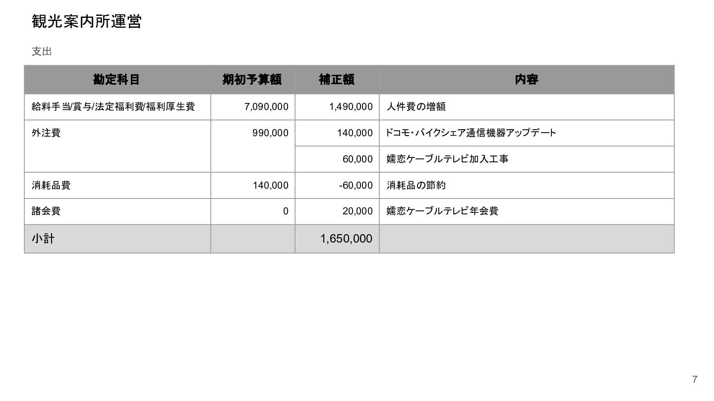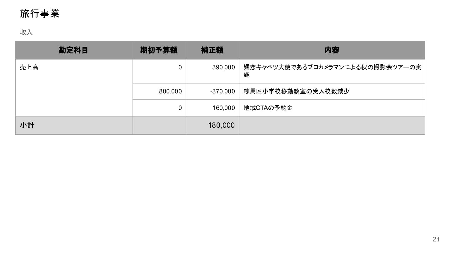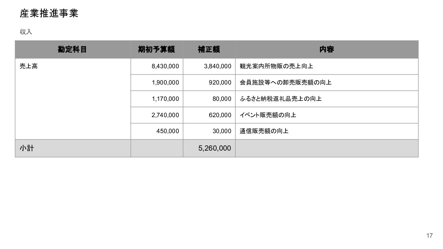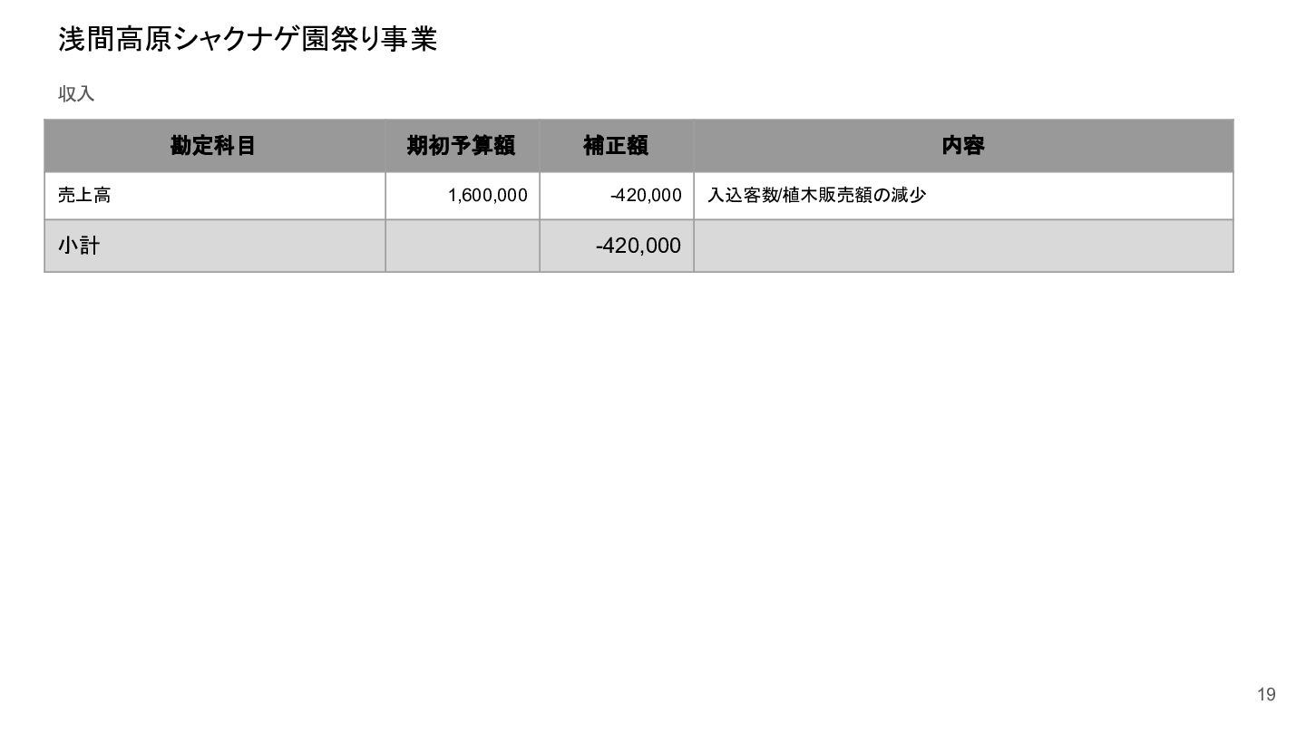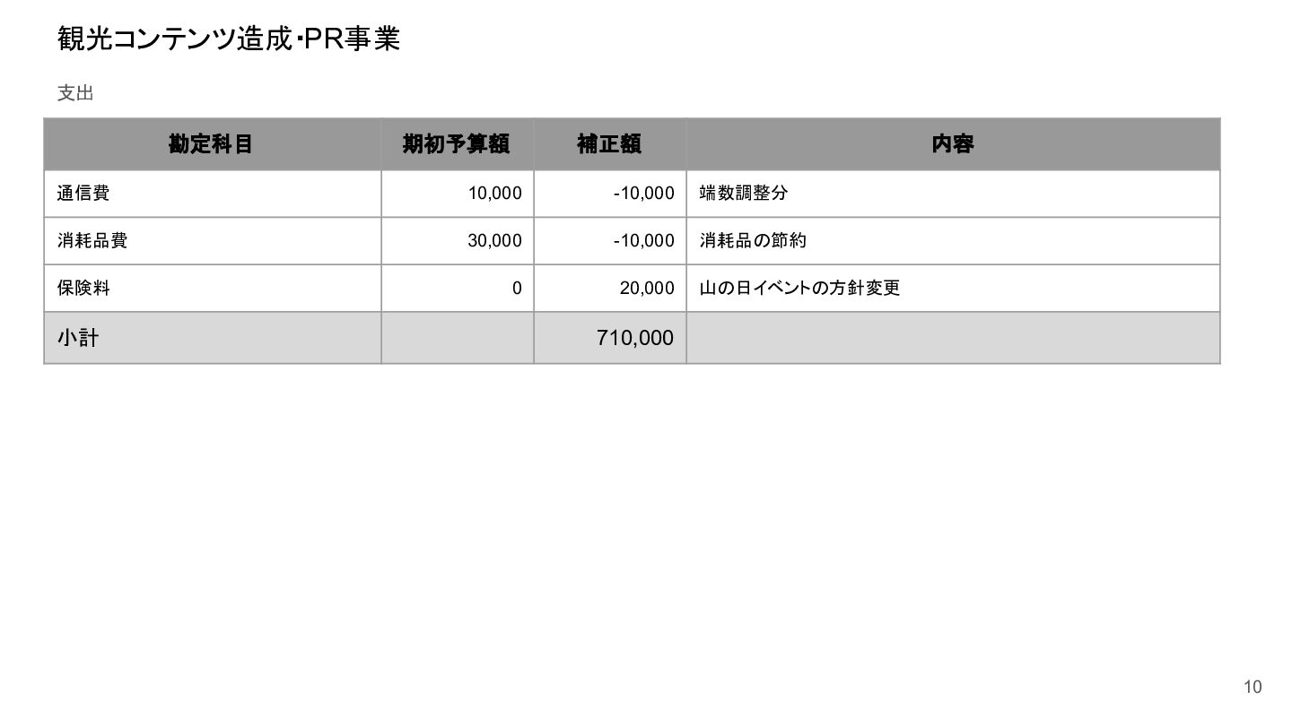 補助事業費 委託事業費 (観光商工課 ) 委託事業費 (未来創造課 ) 委託事業費 (マラソン) その他の事業 事業会計 管理費 観光協会 運営事業 嬬恋村ブランドづくり 誘客と受入体制づくり 持続可能な体制づくり 持続可能な体制づくり 地域おこし協力隊 管理事業 キャベツマラソン事業 産業推進 事業 浅間高原 シャクナゲ園祭り 旅行 事業 管理 アウトドア 資源づくり キャベツの文化 づくり 愛妻の文化 づくり FC運営 都市との交流創出 広域観光づくり 情報受発信 体制づくり 観光データの整備 観光まちづくりの推進 ¥94,660,000 ¥106,050,000 -¥11,390,000 ¥10,180,000 ¥2,800,000 ¥0 ¥2,300,000 ¥3,980,000 ¥2,280,000 ¥3,410,000 ¥23,340,000 ¥1,600,000 ¥1,740,000 ¥1,510,000 ¥2,500,000 ¥20,070,000 ¥1,500,000 ¥2,020,000 ¥79,230,000 ¥15,430,000 協会会費 ¥1,180,000 ¥1,210,000 -¥30,000 ¥1,180,000 ¥0 ¥0 ¥0 ¥0 ¥0 ¥0 ¥0 ¥0 ¥0 ¥0 ¥0 ¥0 ¥0 ¥0 ¥1,180,000 ¥0 売上高 ¥23,300,000 ¥22,150,000 ¥1,150,000 ¥0 ¥90,000 ¥0 ¥0 ¥0 ¥0 ¥0 ¥120,000 ¥0 ¥0 ¥0 ¥0 ¥20,070,000 ¥1,500,000 ¥1,520,000 ¥23,300,000 ¥0 前期からの繰越金 ¥15,420,000 ¥9,710,000 ¥5,710,000 ¥0 ¥0 ¥0 ¥0 ¥0 ¥0 ¥0 ¥0 ¥0 ¥0 ¥0 ¥0 ¥0 ¥0 ¥0 ¥0 ¥15,420,000 役務収益 ¥45,750,000 ¥54,060,000 -¥8,310,000 ¥0 ¥2,710,000 ¥0 ¥2,300,000 ¥3,980,000 ¥2,280,000 ¥3,410,000 ¥23,220,000 ¥1,600,000 ¥1,740,000 ¥1,510,000 ¥2,500,000 ¥0 ¥0 ¥500,000 ¥45,750,000 ¥0 補助金 ¥9,000,000 ¥9,910,000 -¥910,000 ¥9,000,000 ¥0 ¥0 ¥0 ¥0 ¥0 ¥0 ¥0 ¥0 ¥0 ¥0 ¥0 ¥0 ¥0 ¥0 ¥9,000,000 ¥0 受取利息 ¥10,000 ¥10,000 ¥0 ¥0 ¥0 ¥0 ¥0 ¥0 ¥0 ¥0 ¥0 ¥0 ¥0 ¥0 ¥0 ¥0 ¥0 ¥0 ¥0 ¥10,000 雑収入 ¥0 ¥0 ¥0 ¥0 ¥0 ¥0 ¥0 ¥0 ¥0 ¥0 ¥0 ¥0 ¥0 ¥0 ¥0 ¥0 ¥0 ¥0 ¥0 ¥0 短期借入金 ¥0 ¥9,000,000 -¥9,000,000 ¥0 ¥0 ¥0 ¥0 ¥0 ¥0 ¥0 ¥0 ¥0 ¥0 ¥0 ¥0 ¥0 ¥0 ¥0 ¥0 ¥0 【支出の部】 勘定科目 2026年度 合計 2025年度 見込決算額 比較増減 補助事業費 委託事業費 (観光商工課 ) 委託事業費 (未来創造課 ) 委託事業費 (マラソン) その他の事業 事業会計 管理費 観光協会 運営事業 嬬恋村ブランドづくり 誘客と受入体制づくり 持続可能な体制づくり 持続可能な体制づくり 地域おこし協力隊 管理事業 キャベツマラソン事業 産業推進 事業 浅間高原 シャクナゲ園祭り 旅行 事業 管理 アウトドア 資源づくり キャベツの文化 づくり 愛妻の文化 づくり FC運営 都市との交流創出 広域観光づくり 情報受発信 体制づくり 観光データの整備 観光まちづくりの推進 ¥94,660,000 ¥106,050,000 -¥11,390,000 ¥10,490,000 ¥2,440,000 ¥190,000 ¥2,020,000 ¥3,530,000 ¥1,890,000 ¥2,970,000 ¥22,080,000 ¥2,090,000 ¥1,970,000 ¥1,380,000 ¥2,350,000 ¥15,810,000 ¥1,750,000 ¥1,470,000 ¥72,430,000 ¥22,230,000 長期借入金 ¥470,000 ¥470,000 ¥0 ¥0 ¥0 ¥0 ¥0 ¥0 ¥0 ¥0 ¥0 ¥0 ¥0 ¥0 ¥0 ¥0 ¥0 ¥0 ¥0 ¥470,000 工具器具備品 ¥350,000 ¥170,000 ¥180,000 ¥0 ¥0 ¥0 ¥0 ¥0 ¥0 ¥0 ¥0 ¥0 ¥0 ¥0 ¥0 ¥0 ¥150,000 ¥0 ¥150,000 ¥200,000 未払法人税等 ¥80,000 ¥80,000 ¥0 ¥0 ¥0 ¥0 ¥0 ¥0 ¥0 ¥0 ¥0 ¥0 ¥0 ¥0 ¥0 ¥0 ¥0 ¥0 ¥0 ¥80,000 来期への繰越金 ¥6,300,000 ¥15,410,000 -¥9,110,000 ¥0 ¥0 ¥0 ¥0 ¥0 ¥0 ¥0 ¥0 ¥0 ¥0 ¥0 ¥0 ¥0 ¥0 ¥0 ¥0 ¥6,300,000 仕入高 ¥13,610,000 ¥15,040,000 -¥1,430,000 ¥0 ¥50,000 ¥0 ¥0 ¥0 ¥0 ¥0 ¥0 ¥0 ¥0 ¥0 ¥0 ¥12,050,000 ¥200,000 ¥1,310,000 ¥13,610,000 ¥0 手数料 ¥520,000 ¥510,000 ¥10,000 ¥50,000 ¥0 ¥0 ¥0 ¥0 ¥0 ¥0 ¥0 ¥0 ¥0 ¥0 ¥0 ¥0 ¥0 ¥0 ¥50,000 ¥470,000 給料手当/賞与/法定福利費 ¥48,370,000 ¥51,770,000 -¥3,400,000 ¥9,160,000 ¥1,790,000 ¥90,000 ¥1,520,000 ¥3,410,000 ¥1,680,000 ¥2,200,000 ¥20,040,000 ¥0 ¥1,970,000 ¥1,380,000 ¥570,000 ¥3,350,000 ¥960,000 ¥0 ¥48,120,000 ¥250,000 福利厚生費 ¥1,360,000 ¥5,040,000 -¥3,680,000 ¥0 ¥0 ¥0 ¥0 ¥0 ¥0 ¥0 ¥0 ¥0 ¥0 ¥0 ¥0 ¥0 ¥0 ¥0 ¥0 ¥1,360,000 外注費 ¥6,020,000 ¥6,390,000 -¥370,000 ¥0 ¥360,000 ¥0 ¥0 ¥0 ¥0 ¥0 ¥1,090,000 ¥2,090,000 ¥0 ¥0 ¥1,770,000 ¥80,000 ¥90,000 ¥160,000 ¥5,640,000 ¥380,000 荷造運賃 ¥170,000 ¥240,000 -¥70,000 ¥0 ¥0 ¥0 ¥0 ¥0 ¥0 ¥0 ¥0 ¥0 ¥0 ¥0 ¥0 ¥0 ¥0 ¥0 ¥0 ¥170,000 広告宣伝費 ¥1,340,000 ¥1,770,000 -¥430,000 ¥180,000 ¥200,000 ¥100,000 ¥490,000 ¥120,000 ¥0 ¥100,000 ¥0 ¥0 ¥0 ¥0 ¥0 ¥20,000 ¥80,000 ¥0 ¥1,290,000 ¥50,000 交際費 ¥30,000 ¥30,000 ¥0 ¥30,000 ¥0 ¥0 ¥0 ¥0 ¥0 ¥0 ¥0 ¥0 ¥0 ¥0 ¥0 ¥0 ¥0 ¥0 ¥30,000 ¥0 会議費 ¥760,000 ¥980,000 -¥220,000 ¥700,000 ¥0 ¥0 ¥0 ¥0 ¥0 ¥10,000 ¥0 ¥0 ¥0 ¥0 ¥0 ¥0 ¥10,000 ¥0 ¥720,000 ¥40,000 旅費交通費 ¥400,000 ¥470,000 -¥70,000 ¥100,000 ¥0 ¥0 ¥0 ¥0 ¥200,000 ¥100,000 ¥0 ¥0 ¥0 ¥0 ¥0 ¥0 ¥0 ¥0 ¥400,000 ¥0 通信費 ¥440,000 ¥640,000 -¥200,000 ¥0 ¥0 ¥0 ¥0 ¥0 ¥0 ¥0 ¥0 ¥0 ¥0 ¥0 ¥0 ¥0 ¥0 ¥0 ¥0 ¥440,000 販売促進費 ¥20,000 ¥30,000 -¥10,000 ¥0 ¥20,000 ¥0 ¥0 ¥0 ¥0 ¥0 ¥0 ¥0 ¥0 ¥0 ¥0 ¥0 ¥0 ¥0 ¥20,000 ¥0 消耗品費 ¥550,000 ¥540,000 ¥10,000 ¥10,000 ¥10,000 ¥0 ¥10,000 ¥0 ¥10,000 ¥0 ¥240,000 ¥0 ¥0 ¥0 ¥0 ¥100,000 ¥50,000 ¥0 ¥430,000 ¥120,000 水道光熱費 ¥600,000 ¥780,000 -¥180,000 ¥0 ¥0 ¥0 ¥0 ¥0 ¥0 ¥0 ¥600,000 ¥0 ¥0 ¥0 ¥0 ¥0 ¥0 ¥0 ¥600,000 ¥0 新聞図書費 ¥40,000 ¥40,000 ¥0 ¥0 ¥0 ¥0 ¥0 ¥0 ¥0 ¥0 ¥0 ¥0 ¥0 ¥0 ¥0 ¥0 ¥0 ¥0 ¥0 ¥40,000 諸会費 ¥610,000 ¥620,000 -¥10,000 ¥0 ¥0 ¥0 ¥0 ¥0 ¥0 ¥550,000 ¥0 ¥0 ¥0 ¥0 ¥0 ¥10,000 ¥0 ¥0 ¥560,000 ¥50,000 支払手数料 ¥470,000 ¥410,000 ¥60,000 ¥0 ¥0 ¥0 ¥0 ¥0 ¥0 ¥0 ¥0 ¥0 ¥0 ¥0 ¥0 ¥200,000 ¥0 ¥0 ¥200,000 ¥270,000 車両費 ¥940,000 ¥730,000 ¥210,000 ¥0