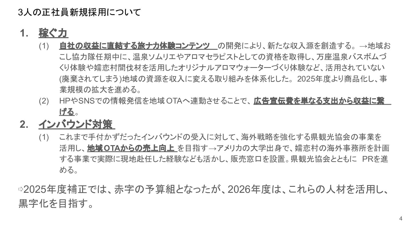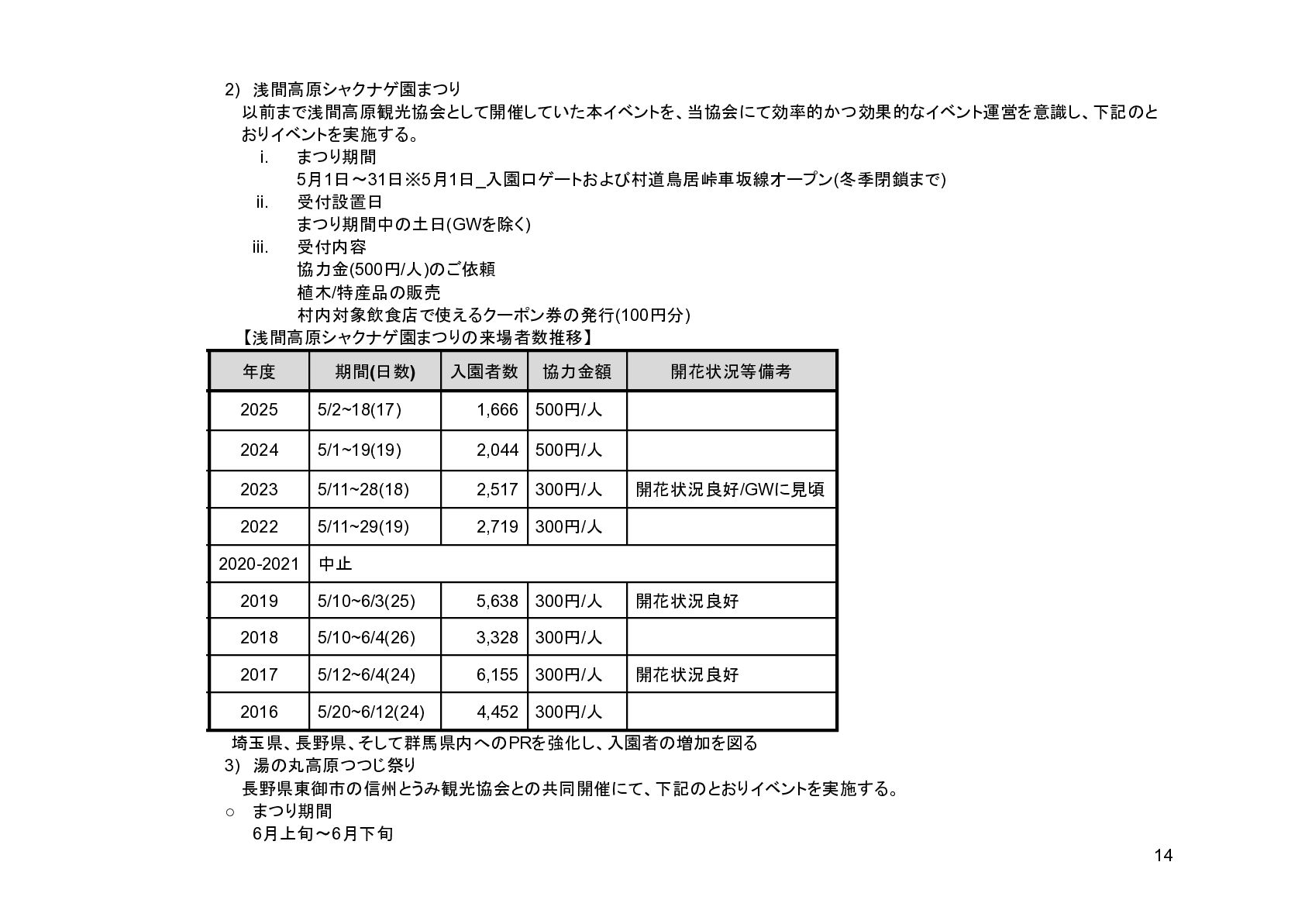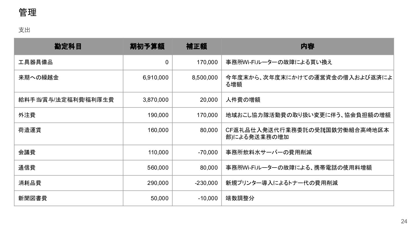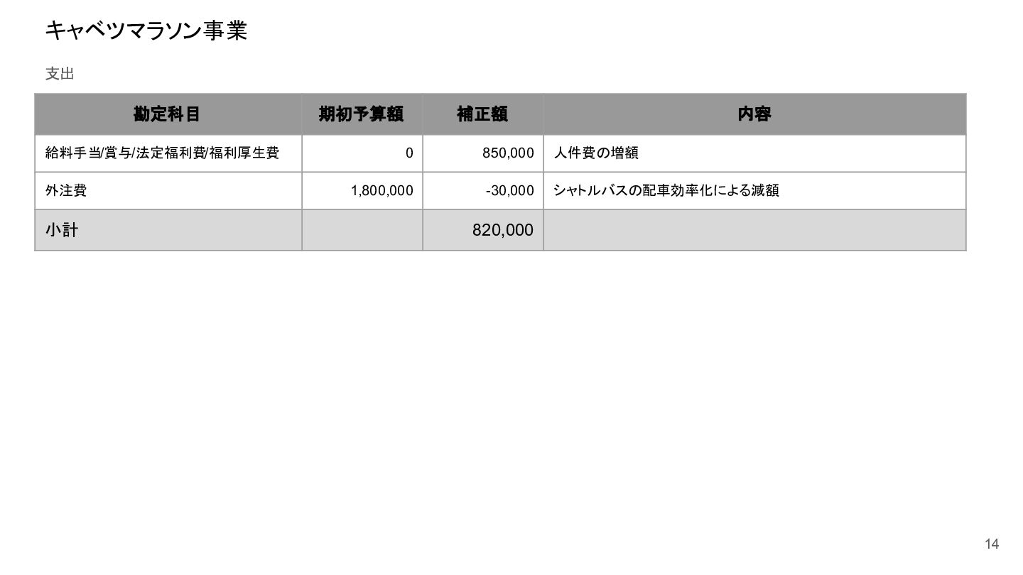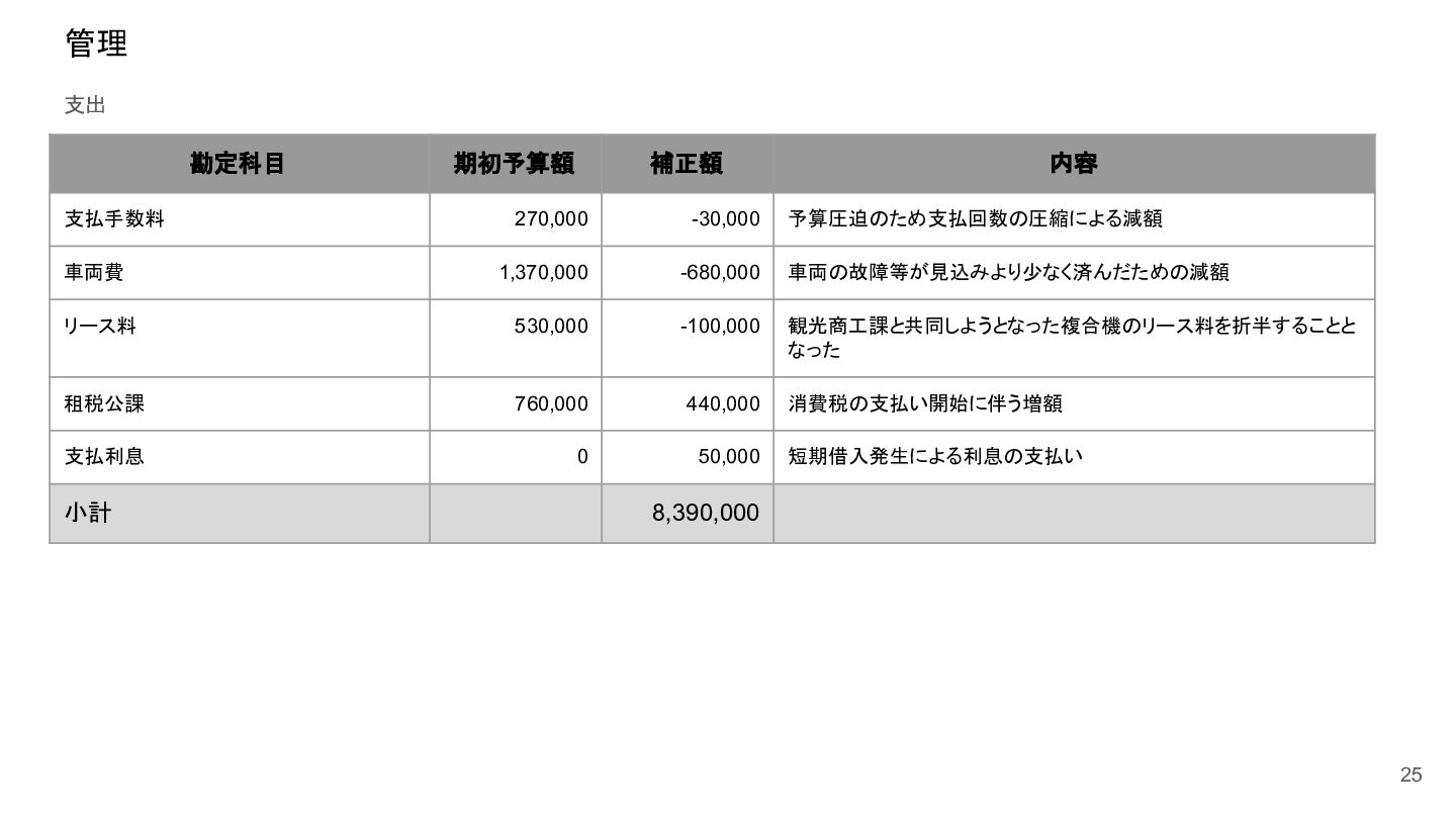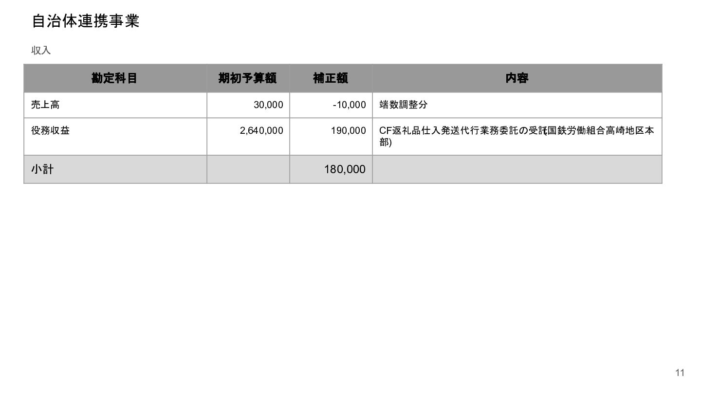 補助事業費 委託事業費 (観光商工課 ) 委託事業費 (未来創造課 ) 委託事業費 (マラソン) その他の事業 事業会計 管理費 観光協会 運営事業 嬬恋村ブランドづくり 誘客と受入体制づくり 持続可能な体制づくり 持続可能な体制づくり 地域おこし協力隊 管理事業 キャベツマラソン事業 産業推進 事業 浅間高原 シャクナゲ園祭り 旅行 事業 管理 アウトドア 資源づくり キャベツの文化 づくり 愛妻の文化 づくり FC運営 都市との交流創出 広域観光づくり 情報受発信 体制づくり 観光データの整備 観光まちづくりの推進 ¥94,660,000 ¥106,050,000 -¥11,390,000 ¥10,180,000 ¥2,800,000 ¥0 ¥2,300,000 ¥3,980,000 ¥2,280,000 ¥3,410,000 ¥23,340,000 ¥1,600,000 ¥1,740,000 ¥1,510,000 ¥2,500,000 ¥20,070,000 ¥1,500,000 ¥2,020,000 ¥79,230,000 ¥15,430,000 協会会費 ¥1,180,000 ¥1,210,000 -¥30,000 ¥1,180,000 ¥0 ¥0 ¥0 ¥0 ¥0 ¥0 ¥0 ¥0 ¥0 ¥0 ¥0 ¥0 ¥0 ¥0 ¥1,180,000 ¥0 売上高 ¥23,300,000 ¥22,150,000 ¥1,150,000 ¥0 ¥90,000 ¥0 ¥0 ¥0 ¥0 ¥0 ¥120,000 ¥0 ¥0 ¥0 ¥0 ¥20,070,000 ¥1,500,000 ¥1,520,000 ¥23,300,000 ¥0 前期からの繰越金 ¥15,420,000 ¥9,710,000 ¥5,710,000 ¥0 ¥0 ¥0 ¥0 ¥0 ¥0 ¥0 ¥0 ¥0 ¥0 ¥0 ¥0 ¥0 ¥0 ¥0 ¥0 ¥15,420,000 役務収益 ¥45,750,000 ¥54,060,000 -¥8,310,000 ¥0 ¥2,710,000 ¥0 ¥2,300,000 ¥3,980,000 ¥2,280,000 ¥3,410,000 ¥23,220,000 ¥1,600,000 ¥1,740,000 ¥1,510,000 ¥2,500,000 ¥0 ¥0 ¥500,000 ¥45,750,000 ¥0 補助金 ¥9,000,000 ¥9,910,000 -¥910,000 ¥9,000,000 ¥0 ¥0 ¥0 ¥0 ¥0 ¥0 ¥0 ¥0 ¥0 ¥0 ¥0 ¥0 ¥0 ¥0 ¥9,000,000 ¥0 受取利息 ¥10,000 ¥10,000 ¥0 ¥0 ¥0 ¥0 ¥0 ¥0 ¥0 ¥0 ¥0 ¥0 ¥0 ¥0 ¥0 ¥0 ¥0 ¥0 ¥0 ¥10,000 雑収入 ¥0 ¥0 ¥0 ¥0 ¥0 ¥0 ¥0 ¥0 ¥0 ¥0 ¥0 ¥0 ¥0 ¥0 ¥0 ¥0 ¥0 ¥0 ¥0 ¥0 短期借入金 ¥0 ¥9,000,000 -¥9,000,000 ¥0 ¥0 ¥0 ¥0 ¥0 ¥0 ¥0 ¥0 ¥0 ¥0 ¥0 ¥0 ¥0 ¥0 ¥0 ¥0 ¥0 【支出の部】 勘定科目 2026年度 合計 2025年度 見込決算額 比較増減 補助事業費 委託事業費 (観光商工課 ) 委託事業費 (未来創造課 ) 委託事業費 (マラソン) その他の事業 事業会計 管理費 観光協会 運営事業 嬬恋村ブランドづくり 誘客と受入体制づくり 持続可能な体制づくり 持続可能な体制づくり 地域おこし協力隊 管理事業 キャベツマラソン事業 産業推進 事業 浅間高原 シャクナゲ園祭り 旅行 事業 管理 アウトドア 資源づくり キャベツの文化 づくり 愛妻の文化 づくり FC運営 都市との交流創出 広域観光づくり 情報受発信 体制づくり 観光データの整備 観光まちづくりの推進 ¥94,660,000 ¥106,050,000 -¥11,390,000 ¥10,490,000 ¥2,440,000 ¥190,000 ¥2,020,000 ¥3,530,000 ¥1,890,000 ¥2,970,000 ¥22,080,000 ¥2,090,000 ¥1,970,000 ¥1,380,000 ¥2,350,000 ¥15,810,000 ¥1,750,000 ¥1,470,000 ¥72,430,000 ¥22,230,000 長期借入金 ¥470,000 ¥470,000 ¥0 ¥0 ¥0 ¥0 ¥0 ¥0 ¥0 ¥0 ¥0 ¥0 ¥0 ¥0 ¥0 ¥0 ¥0 ¥0 ¥0 ¥470,000 工具器具備品 ¥350,000 ¥170,000 ¥180,000 ¥0 ¥0 ¥0 ¥0 ¥0 ¥0 ¥0 ¥0 ¥0 ¥0 ¥0 ¥0 ¥0 ¥150,000 ¥0 ¥150,000 ¥200,000 未払法人税等 ¥80,000 ¥80,000 ¥0 ¥0 ¥0 ¥0 ¥0 ¥0 ¥0 ¥0 ¥0 ¥0 ¥0 ¥0 ¥0 ¥0 ¥0 ¥0 ¥0 ¥80,000 来期への繰越金 ¥6,300,000 ¥15,410,000 -¥9,110,000 ¥0 ¥0 ¥0 ¥0 ¥0 ¥0 ¥0 ¥0 ¥0 ¥0 ¥0 ¥0 ¥0 ¥0 ¥0 ¥0 ¥6,300,000 仕入高 ¥13,610,000 ¥15,040,000 -¥1,430,000 ¥0 ¥50,000 ¥0 ¥0 ¥0 ¥0 ¥0 ¥0 ¥0 ¥0 ¥0 ¥0 ¥12,050,000 ¥200,000 ¥1,310,000 ¥13,610,000 ¥0 手数料 ¥520,000 ¥510,000 ¥10,000 ¥50,000 ¥0 ¥0 ¥0 ¥0 ¥0 ¥0 ¥0 ¥0 ¥0 ¥0 ¥0 ¥0 ¥0 ¥0 ¥50,000 ¥470,000 給料手当/賞与/法定福利費 ¥48,370,000 ¥51,770,000 -¥3,400,000 ¥9,160,000 ¥1,790,000 ¥90,000 ¥1,520,000 ¥3,410,000 ¥1,680,000 ¥2,200,000 ¥20,040,000 ¥0 ¥1,970,000 ¥1,380,000 ¥570,000 ¥3,350,000 ¥960,000 ¥0 ¥48,120,000 ¥250,000 福利厚生費 ¥1,360,000 ¥5,040,000 -¥3,680,000 ¥0 ¥0 ¥0 ¥0 ¥0 ¥0 ¥0 ¥0 ¥0 ¥0 ¥0 ¥0 ¥0 ¥0 ¥0 ¥0 ¥1,360,000 外注費 ¥6,020,000 ¥6,390,000 -¥370,000 ¥0 ¥360,000 ¥0 ¥0 ¥0 ¥0 ¥0 ¥1,090,000 ¥2,090,000 ¥0 ¥0 ¥1,770,000 ¥80,000 ¥90,000 ¥160,000 ¥5,640,000 ¥380,000 荷造運賃 ¥170,000 ¥240,000 -¥70,000 ¥0 ¥0 ¥0 ¥0 ¥0 ¥0 ¥0 ¥0 ¥0 ¥0 ¥0 ¥0 ¥0 ¥0 ¥0 ¥0 ¥170,000 広告宣伝費 ¥1,340,000 ¥1,770,000 -¥430,000 ¥180,000 ¥200,000 ¥100,000 ¥490,000 ¥120,000 ¥0 ¥100,000 ¥0 ¥0 ¥0 ¥0 ¥0 ¥20,000 ¥80,000 ¥0 ¥1,290,000 ¥50,000 交際費 ¥30,000 ¥30,000 ¥0 ¥30,000 ¥0 ¥0 ¥0 ¥0 ¥0 ¥0 ¥0 ¥0 ¥0 ¥0 ¥0 ¥0 ¥0 ¥0 ¥30,000 ¥0 会議費 ¥760,000 ¥980,000 -¥220,000 ¥700,000 ¥0 ¥0 ¥0 ¥0 ¥0 ¥10,000 ¥0 ¥0 ¥0 ¥0 ¥0 ¥0 ¥10,000 ¥0 ¥720,000 ¥40,000 旅費交通費 ¥400,000 ¥470,000 -¥70,000 ¥100,000 ¥0 ¥0 ¥0 ¥0 ¥200,000 ¥100,000 ¥0 ¥0 ¥0 ¥0 ¥0 ¥0 ¥0 ¥0 ¥400,000 ¥0 通信費 ¥440,000 ¥640,000 -¥200,000 ¥0 ¥0 ¥0 ¥0 ¥0 ¥0 ¥0 ¥0 ¥0 ¥0 ¥0 ¥0 ¥0 ¥0 ¥0 ¥0 ¥440,000 販売促進費 ¥20,000 ¥30,000 -¥10,000 ¥0 ¥20,000 ¥0 ¥0 ¥0 ¥0 ¥0 ¥0 ¥0 ¥0 ¥0 ¥0 ¥0 ¥0 ¥0 ¥20,000 ¥0 消耗品費 ¥550,000 ¥540,000 ¥10,000 ¥10,000 ¥10,000 ¥0 ¥10,000 ¥0 ¥10,000 ¥0 ¥240,000 ¥0 ¥0 ¥0 ¥0 ¥100,000 ¥50,000 ¥0 ¥430,000 ¥120,000 水道光熱費 ¥600,000 ¥780,000 -¥180,000 ¥0 ¥0 ¥0 ¥0 ¥0 ¥0 ¥0 ¥600,000 ¥0 ¥0 ¥0 ¥0 ¥0 ¥0 ¥0 ¥600,000 ¥0 新聞図書費 ¥40,000 ¥40,000 ¥0 ¥0 ¥0 ¥0 ¥0 ¥0 ¥0 ¥0 ¥0 ¥0 ¥0 ¥0 ¥0 ¥0 ¥0 ¥0 ¥0 ¥40,000 諸会費 ¥610,000 ¥620,000 -¥10,000 ¥0 ¥0 ¥0 ¥0 ¥0 ¥0 ¥550,000 ¥0 ¥0 ¥0 ¥0 ¥0 ¥10,000 ¥0 ¥0 ¥560,000 ¥50,000 支払手数料 ¥470,000 ¥410,000 ¥60,000 ¥0 ¥0 ¥0 ¥0 ¥0 ¥0 ¥0 ¥0 ¥0 ¥0 ¥0 ¥0 ¥200,000 ¥0 ¥0 ¥200,000 ¥270,000 車両費 ¥940,000 ¥730,000 ¥210,000 ¥0