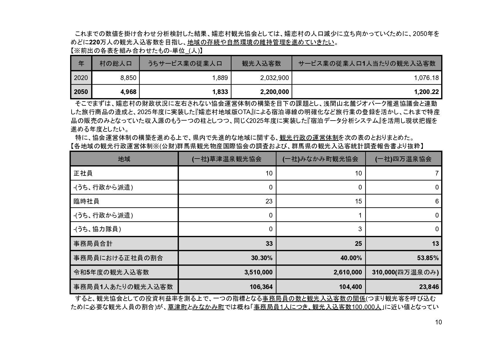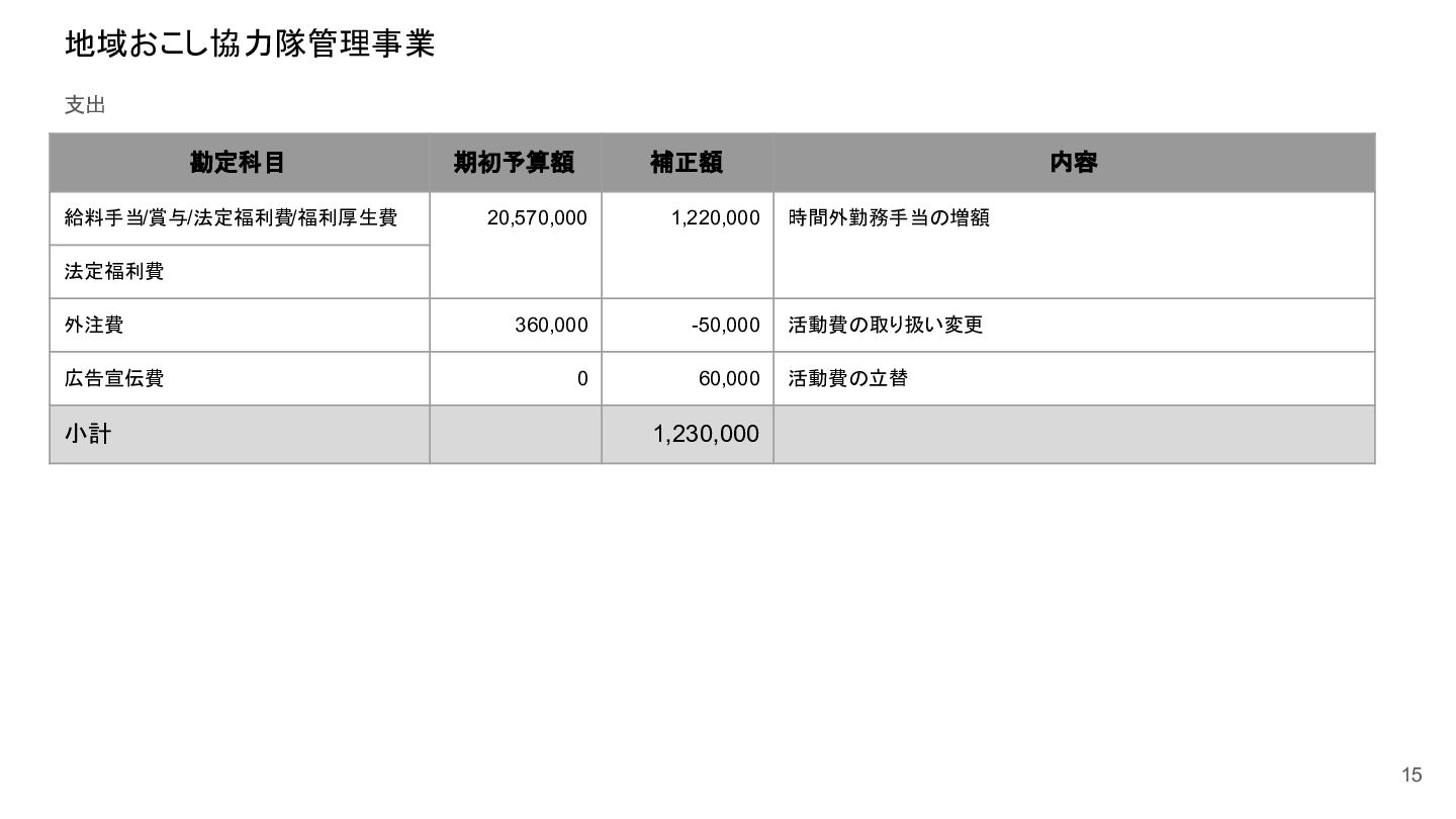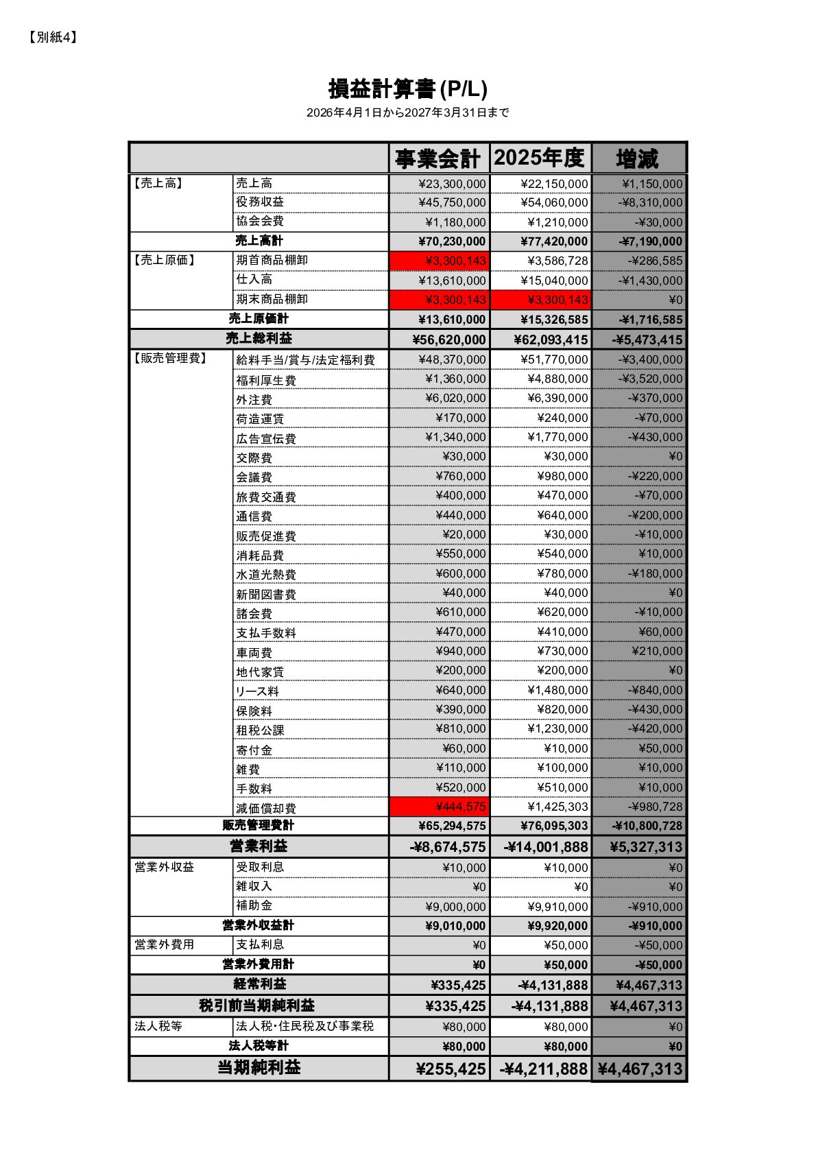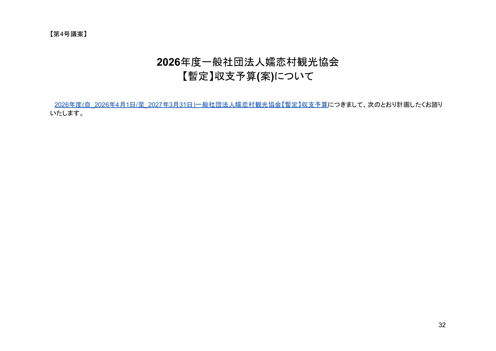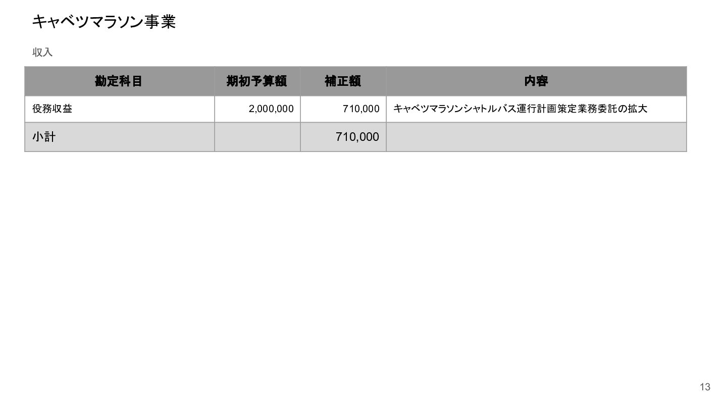 補助事業費 委託事業費 (観光商工課 ) 委託事業費 (未来創造課 ) 委託事業費 (マラソン) その他の事業 事業会計 管理費 観光協会 運営事業 嬬恋村ブランドづくり 誘客と受入体制づくり 持続可能な体制づくり 持続可能な体制づくり 地域おこし協力隊 管理事業 キャベツマラソン事業 産業推進 事業 浅間高原 シャクナゲ園祭り 旅行 事業 管理 アウトドア 資源づくり キャベツの文化 づくり 愛妻の文化 づくり FC運営 都市との交流創出 広域観光づくり 情報受発信 体制づくり 観光データの整備 観光まちづくりの推進 ¥94,660,000 ¥106,050,000 -¥11,390,000 ¥10,180,000 ¥2,800,000 ¥0 ¥2,300,000 ¥3,980,000 ¥2,280,000 ¥3,410,000 ¥23,340,000 ¥1,600,000 ¥1,740,000 ¥1,510,000 ¥2,500,000 ¥20,070,000 ¥1,500,000 ¥2,020,000 ¥79,230,000 ¥15,430,000 協会会費 ¥1,180,000 ¥1,210,000 -¥30,000 ¥1,180,000 ¥0 ¥0 ¥0 ¥0 ¥0 ¥0 ¥0 ¥0 ¥0 ¥0 ¥0 ¥0 ¥0 ¥0 ¥1,180,000 ¥0 売上高 ¥23,300,000 ¥22,150,000 ¥1,150,000 ¥0 ¥90,000 ¥0 ¥0 ¥0 ¥0 ¥0 ¥120,000 ¥0 ¥0 ¥0 ¥0 ¥20,070,000 ¥1,500,000 ¥1,520,000 ¥23,300,000 ¥0 前期からの繰越金 ¥15,420,000 ¥9,710,000 ¥5,710,000 ¥0 ¥0 ¥0 ¥0 ¥0 ¥0 ¥0 ¥0 ¥0 ¥0 ¥0 ¥0 ¥0 ¥0 ¥0 ¥0 ¥15,420,000 役務収益 ¥45,750,000 ¥54,060,000 -¥8,310,000 ¥0 ¥2,710,000 ¥0 ¥2,300,000 ¥3,980,000 ¥2,280,000 ¥3,410,000 ¥23,220,000 ¥1,600,000 ¥1,740,000 ¥1,510,000 ¥2,500,000 ¥0 ¥0 ¥500,000 ¥45,750,000 ¥0 補助金 ¥9,000,000 ¥9,910,000 -¥910,000 ¥9,000,000 ¥0 ¥0 ¥0 ¥0 ¥0 ¥0 ¥0 ¥0 ¥0 ¥0 ¥0 ¥0 ¥0 ¥0 ¥9,000,000 ¥0 受取利息 ¥10,000 ¥10,000 ¥0 ¥0 ¥0 ¥0 ¥0 ¥0 ¥0 ¥0 ¥0 ¥0 ¥0 ¥0 ¥0 ¥0 ¥0 ¥0 ¥0 ¥10,000 雑収入 ¥0 ¥0 ¥0 ¥0 ¥0 ¥0 ¥0 ¥0 ¥0 ¥0 ¥0 ¥0 ¥0 ¥0 ¥0 ¥0 ¥0 ¥0 ¥0 ¥0 短期借入金 ¥0 ¥9,000,000 -¥9,000,000 ¥0 ¥0 ¥0 ¥0 ¥0 ¥0 ¥0 ¥0 ¥0 ¥0 ¥0 ¥0 ¥0 ¥0 ¥0 ¥0 ¥0 【支出の部】 勘定科目 2026年度 合計 2025年度 見込決算額 比較増減 補助事業費 委託事業費 (観光商工課 ) 委託事業費 (未来創造課 ) 委託事業費 (マラソン) その他の事業 事業会計 管理費 観光協会 運営事業 嬬恋村ブランドづくり 誘客と受入体制づくり 持続可能な体制づくり 持続可能な体制づくり 地域おこし協力隊 管理事業 キャベツマラソン事業 産業推進 事業 浅間高原 シャクナゲ園祭り 旅行 事業 管理 アウトドア 資源づくり キャベツの文化 づくり 愛妻の文化 づくり FC運営 都市との交流創出 広域観光づくり 情報受発信 体制づくり 観光データの整備 観光まちづくりの推進 ¥94,660,000 ¥106,050,000 -¥11,390,000 ¥10,490,000 ¥2,440,000 ¥190,000 ¥2,020,000 ¥3,530,000 ¥1,890,000 ¥2,970,000 ¥22,080,000 ¥2,090,000 ¥1,970,000 ¥1,380,000 ¥2,350,000 ¥15,810,000 ¥1,750,000 ¥1,470,000 ¥72,430,000 ¥22,230,000 長期借入金 ¥470,000 ¥470,000 ¥0 ¥0 ¥0 ¥0 ¥0 ¥0 ¥0 ¥0 ¥0 ¥0 ¥0 ¥0 ¥0 ¥0 ¥0 ¥0 ¥0 ¥470,000 工具器具備品 ¥350,000 ¥170,000 ¥180,000 ¥0 ¥0 ¥0 ¥0 ¥0 ¥0 ¥0 ¥0 ¥0 ¥0 ¥0 ¥0 ¥0 ¥150,000 ¥0 ¥150,000 ¥200,000 未払法人税等 ¥80,000 ¥80,000 ¥0 ¥0 ¥0 ¥0 ¥0 ¥0 ¥0 ¥0 ¥0 ¥0 ¥0 ¥0 ¥0 ¥0 ¥0 ¥0 ¥0 ¥80,000 来期への繰越金 ¥6,300,000 ¥15,410,000 -¥9,110,000 ¥0 ¥0 ¥0 ¥0 ¥0 ¥0 ¥0 ¥0 ¥0 ¥0 ¥0 ¥0 ¥0 ¥0 ¥0 ¥0 ¥6,300,000 仕入高 ¥13,610,000 ¥15,040,000 -¥1,430,000 ¥0 ¥50,000 ¥0 ¥0 ¥0 ¥0 ¥0 ¥0 ¥0 ¥0 ¥0 ¥0 ¥12,050,000 ¥200,000 ¥1,310,000 ¥13,610,000 ¥0 手数料 ¥520,000 ¥510,000 ¥10,000 ¥50,000 ¥0 ¥0 ¥0 ¥0 ¥0 ¥0 ¥0 ¥0 ¥0 ¥0 ¥0 ¥0 ¥0 ¥0 ¥50,000 ¥470,000 給料手当/賞与/法定福利費 ¥48,370,000 ¥51,770,000 -¥3,400,000 ¥9,160,000 ¥1,790,000 ¥90,000 ¥1,520,000 ¥3,410,000 ¥1,680,000 ¥2,200,000 ¥20,040,000 ¥0 ¥1,970,000 ¥1,380,000 ¥570,000 ¥3,350,000 ¥960,000 ¥0 ¥48,120,000 ¥250,000 福利厚生費 ¥1,360,000 ¥5,040,000 -¥3,680,000 ¥0 ¥0 ¥0 ¥0 ¥0 ¥0 ¥0 ¥0 ¥0 ¥0 ¥0 ¥0 ¥0 ¥0 ¥0 ¥0 ¥1,360,000 外注費 ¥6,020,000 ¥6,390,000 -¥370,000 ¥0 ¥360,000 ¥0 ¥0 ¥0 ¥0 ¥0 ¥1,090,000 ¥2,090,000 ¥0 ¥0 ¥1,770,000 ¥80,000 ¥90,000 ¥160,000 ¥5,640,000 ¥380,000 荷造運賃 ¥170,000 ¥240,000 -¥70,000 ¥0 ¥0 ¥0 ¥0 ¥0 ¥0 ¥0 ¥0 ¥0 ¥0 ¥0 ¥0 ¥0 ¥0 ¥0 ¥0 ¥170,000 広告宣伝費 ¥1,340,000 ¥1,770,000 -¥430,000 ¥180,000 ¥200,000 ¥100,000 ¥490,000 ¥120,000 ¥0 ¥100,000 ¥0 ¥0 ¥0 ¥0 ¥0 ¥20,000 ¥80,000 ¥0 ¥1,290,000 ¥50,000 交際費 ¥30,000 ¥30,000 ¥0 ¥30,000 ¥0 ¥0 ¥0 ¥0 ¥0 ¥0 ¥0 ¥0 ¥0 ¥0 ¥0 ¥0 ¥0 ¥0 ¥30,000 ¥0 会議費 ¥760,000 ¥980,000 -¥220,000 ¥700,000 ¥0 ¥0 ¥0 ¥0 ¥0 ¥10,000 ¥0 ¥0 ¥0 ¥0 ¥0 ¥0 ¥10,000 ¥0 ¥720,000 ¥40,000 旅費交通費 ¥400,000 ¥470,000 -¥70,000 ¥100,000 ¥0 ¥0 ¥0 ¥0 ¥200,000 ¥100,000 ¥0 ¥0 ¥0 ¥0 ¥0 ¥0 ¥0 ¥0 ¥400,000 ¥0 通信費 ¥440,000 ¥640,000 -¥200,000 ¥0 ¥0 ¥0 ¥0 ¥0 ¥0 ¥0 ¥0 ¥0 ¥0 ¥0 ¥0 ¥0 ¥0 ¥0 ¥0 ¥440,000 販売促進費 ¥20,000 ¥30,000 -¥10,000 ¥0 ¥20,000 ¥0 ¥0 ¥0 ¥0 ¥0 ¥0 ¥0 ¥0 ¥0 ¥0 ¥0 ¥0 ¥0 ¥20,000 ¥0 消耗品費 ¥550,000 ¥540,000 ¥10,000 ¥10,000 ¥10,000 ¥0 ¥10,000 ¥0 ¥10,000 ¥0 ¥240,000 ¥0 ¥0 ¥0 ¥0 ¥100,000 ¥50,000 ¥0 ¥430,000 ¥120,000 水道光熱費 ¥600,000 ¥780,000 -¥180,000 ¥0 ¥0 ¥0 ¥0 ¥0 ¥0 ¥0 ¥600,000 ¥0 ¥0 ¥0 ¥0 ¥0 ¥0 ¥0 ¥600,000 ¥0 新聞図書費 ¥40,000 ¥40,000 ¥0 ¥0 ¥0 ¥0 ¥0 ¥0 ¥0 ¥0 ¥0 ¥0 ¥0 ¥0 ¥0 ¥0 ¥0 ¥0 ¥0 ¥40,000 諸会費 ¥610,000 ¥620,000 -¥10,000 ¥0 ¥0 ¥0 ¥0 ¥0 ¥0 ¥550,000 ¥0 ¥0 ¥0 ¥0 ¥0 ¥10,000 ¥0 ¥0 ¥560,000 ¥50,000 支払手数料 ¥470,000 ¥410,000 ¥60,000 ¥0 ¥0 ¥0 ¥0 ¥0 ¥0 ¥0 ¥0 ¥0 ¥0 ¥0 ¥0 ¥200,000 ¥0 ¥0 ¥200,000 ¥270,000 車両費 ¥940,000 ¥730,000 ¥210,000 ¥0
