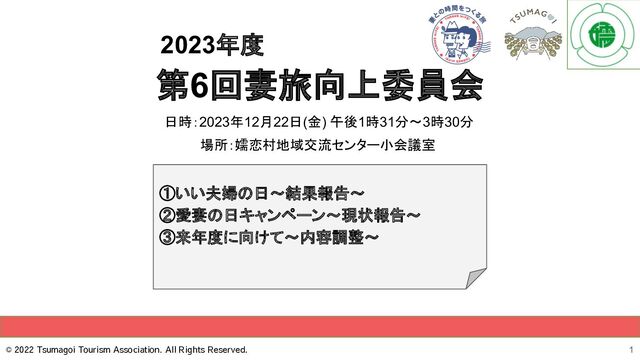 を配布し普及活動実施! 各イベントを一過性のものにしないよう、各イベントの参加者にはステッカーを配布し、継続的に普及活動をしていく。使い古して剥がれてしまったら、ご近所から 「あら、あの夫婦大丈夫かしら・・・」なんて思われるかも。 【検討事項】 • 売り上げの一部を環境保全に活用 • そのほかのノベルティ現状 (フローティングペン _235本→スタンプウォーク +アルファ/あづまはやステッカー _5,300枚→条例制定時に全戸配布 +アルファ/夫 婦円満お守り _1,900個→これまで通り ) • 宿泊プランに抱き合わせのお守り • tsuma-bellの活用 • 15