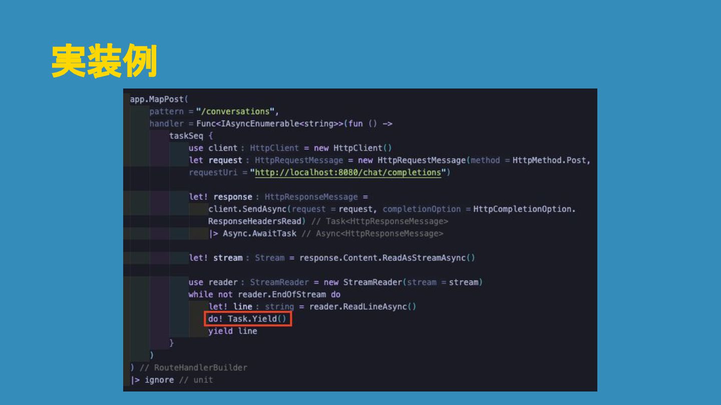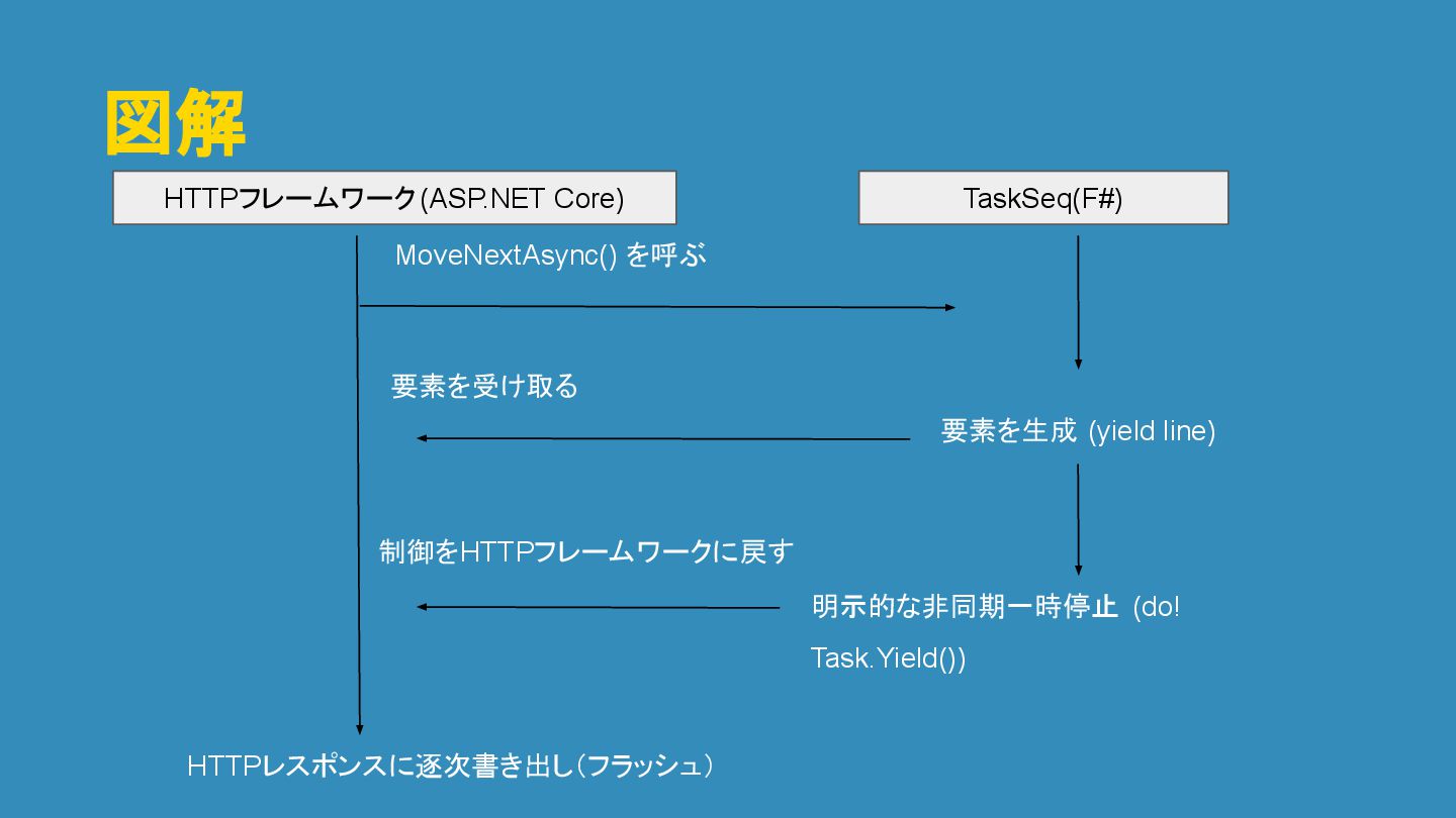 HTTPフレームワーク(ASP.NET Core) TaskSeq(F#) HTTPレスポンスに逐次書き出し(フラッシュ) MoveNextAsync() を呼ぶ 明示的な非同期一時停止 (do! Task.Yield()) 制御をHTTPフレームワークに戻す