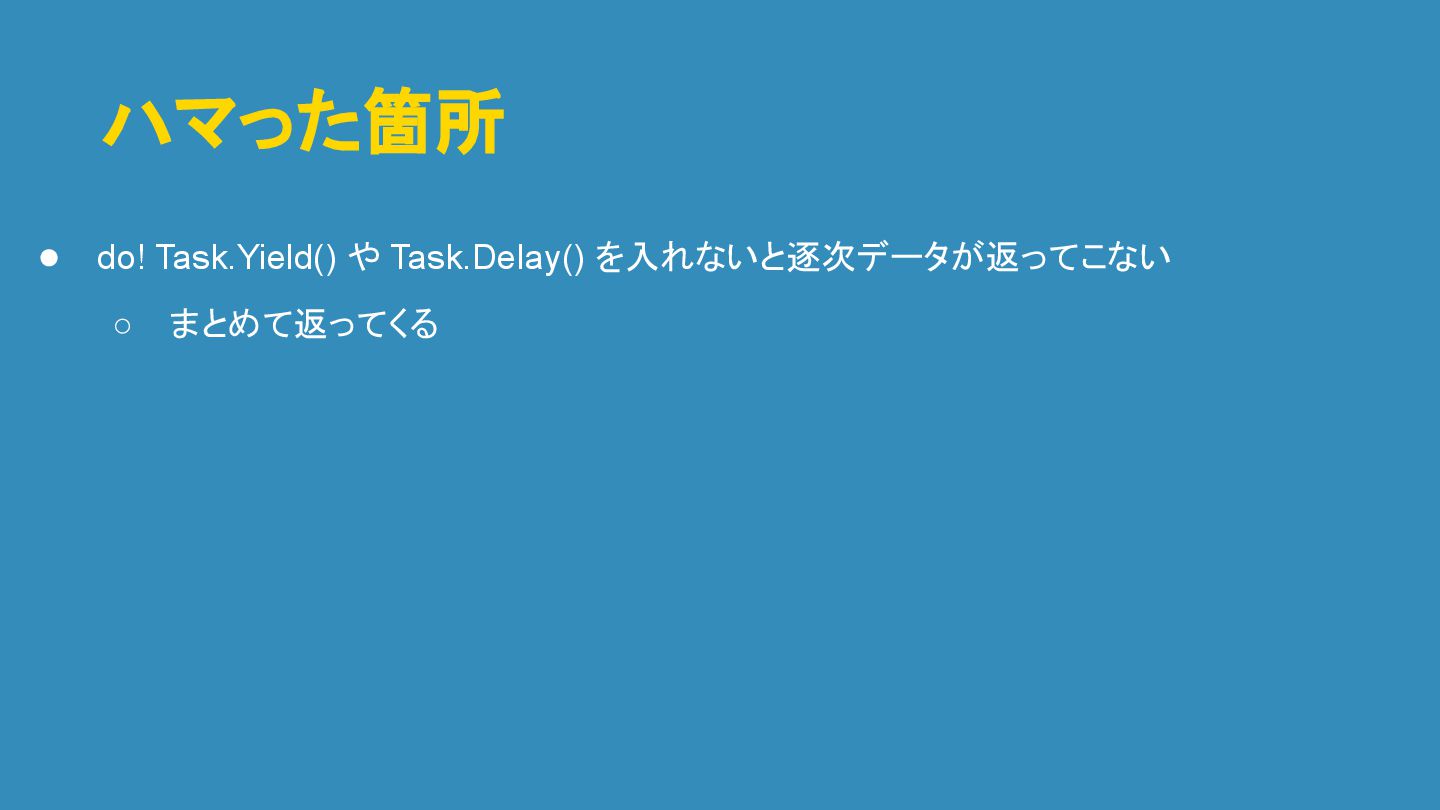 ハマった箇所 • do! Task.Yield() や Task.Delay() を入れないと逐次データが返ってこない ◦ まとめて返ってくる