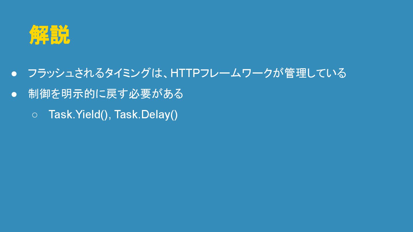 解説 • フラッシュされるタイミングは、HTTPフレームワークが管理している • 制御を明示的に戻す必要がある ◦ Task.Yield(), Task.Delay()