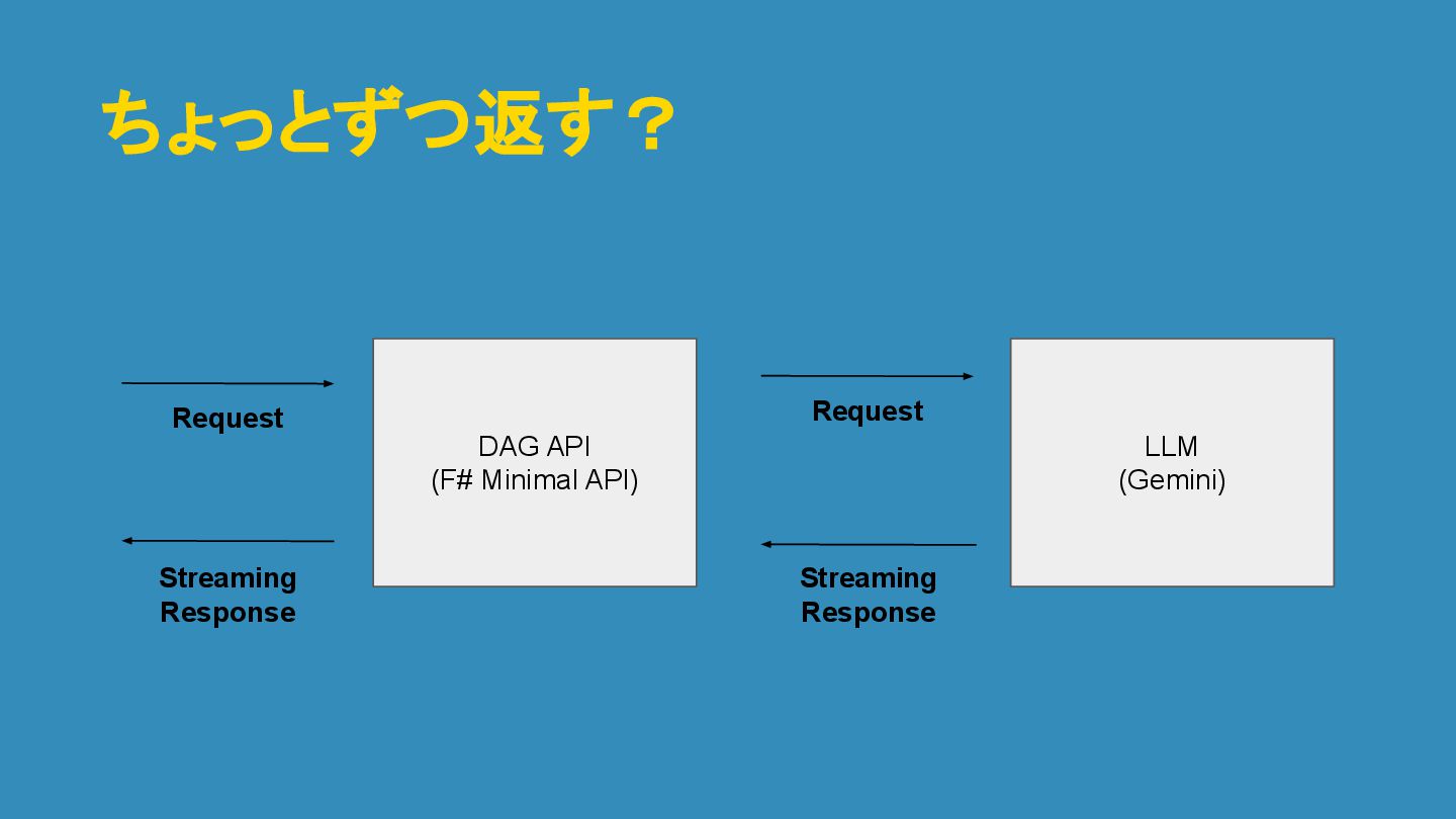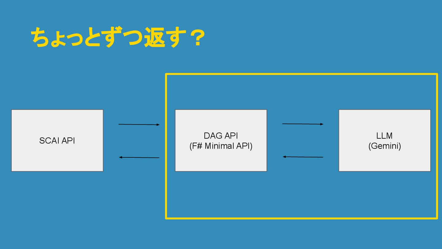 ちょっとずつ返す? DAG API (F# Minimal API) LLM (Gemini) SCAI