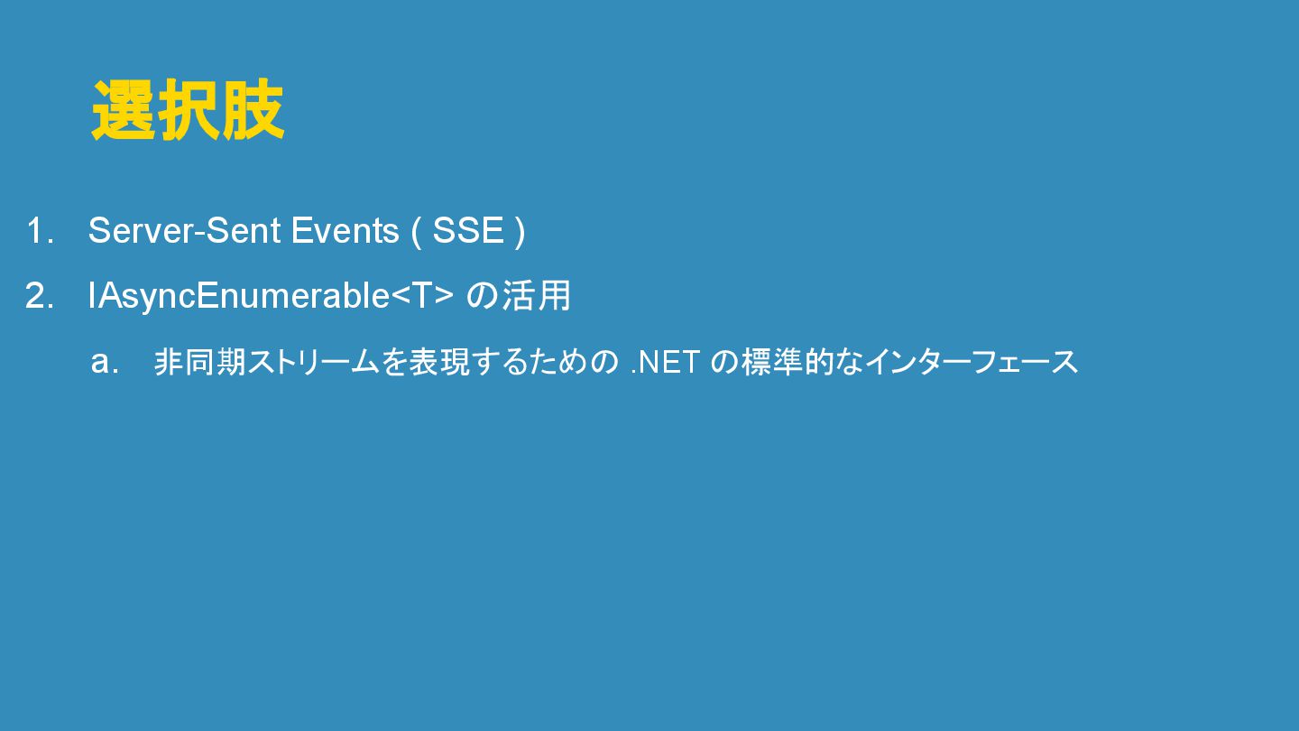選択肢 1. Server-Sent Events ( SSE ) 2. IAsyncEnumerable<T> の活用