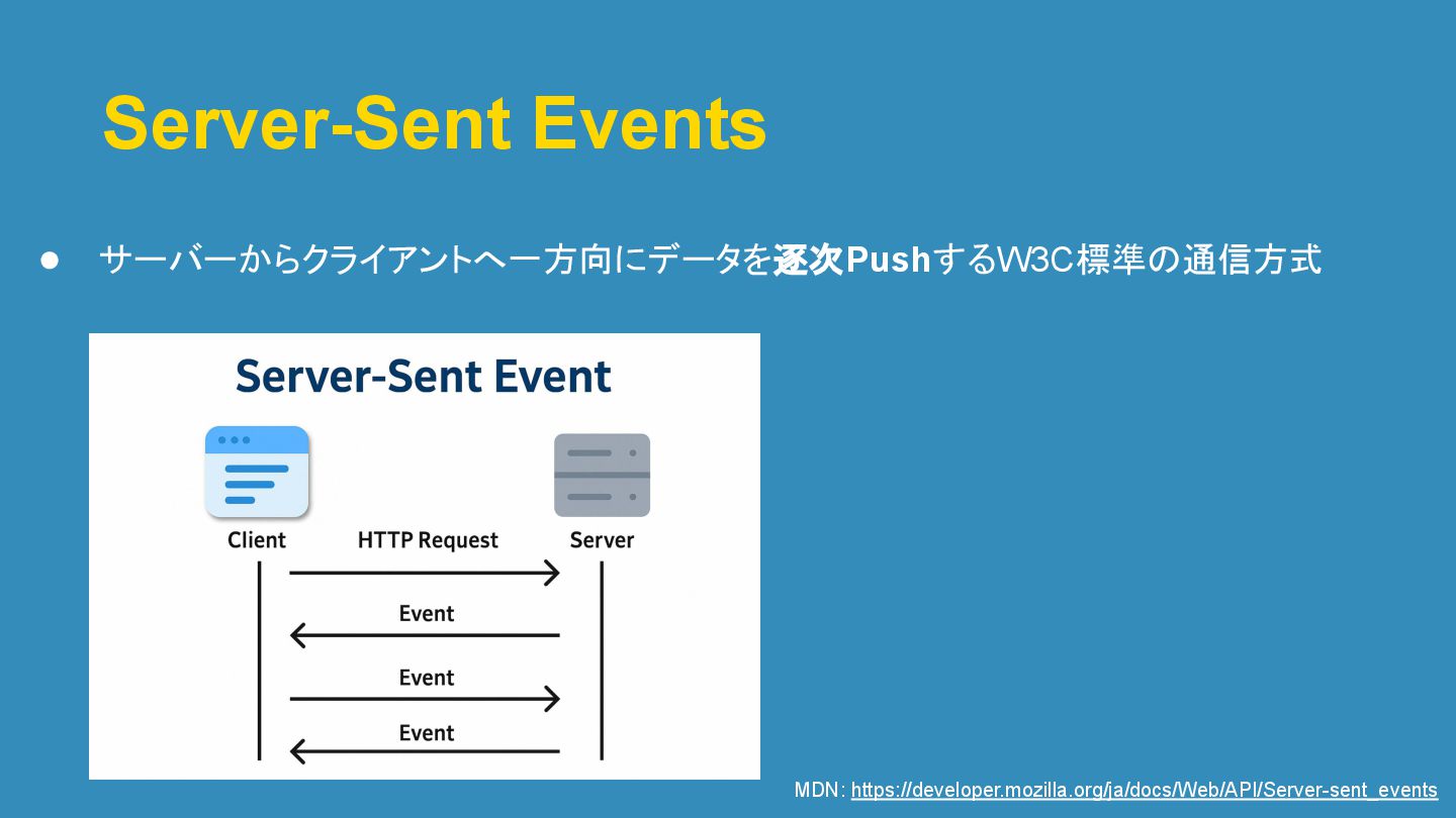 Server-Sent Events • サーバーからクライアントへ一方向にデータを逐次PushするW3C標準の通信方式 MDN: https://developer.mozilla.org/ja/docs/Web/API/Server-sent_events