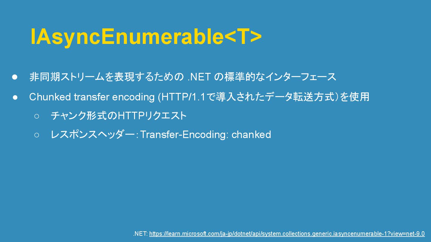 ◦ チャンク形式のHTTPリクエスト ◦ レスポンスヘッダー:Transfer-Encoding: chanked .NET: https://learn.microsoft.com/ja-jp/dotnet/api/system.collections.generic.iasyncenumerable-1?view=net-9.0
