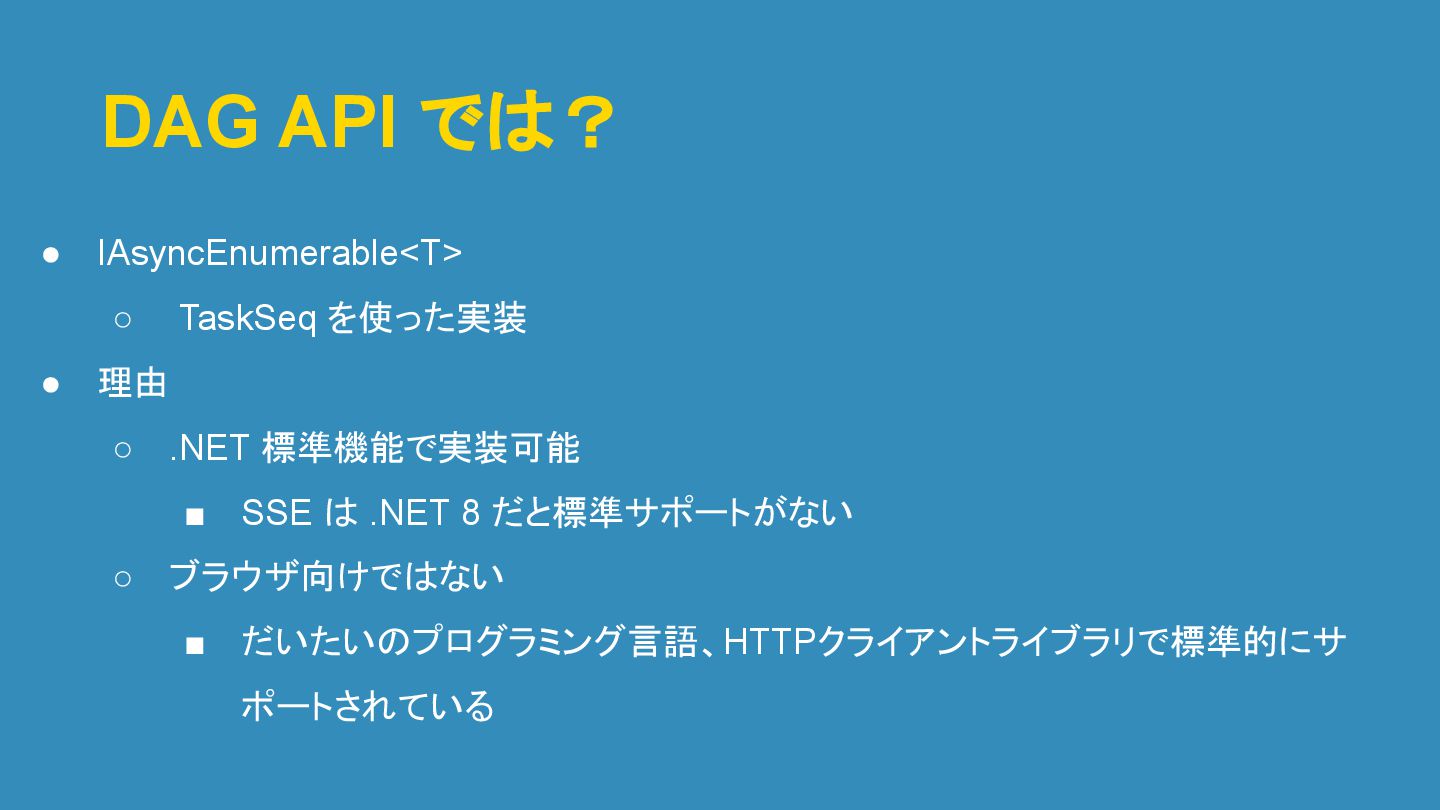 DAG API では? • IAsyncEnumerable<T> ◦ TaskSeq を使った実装 • 理由