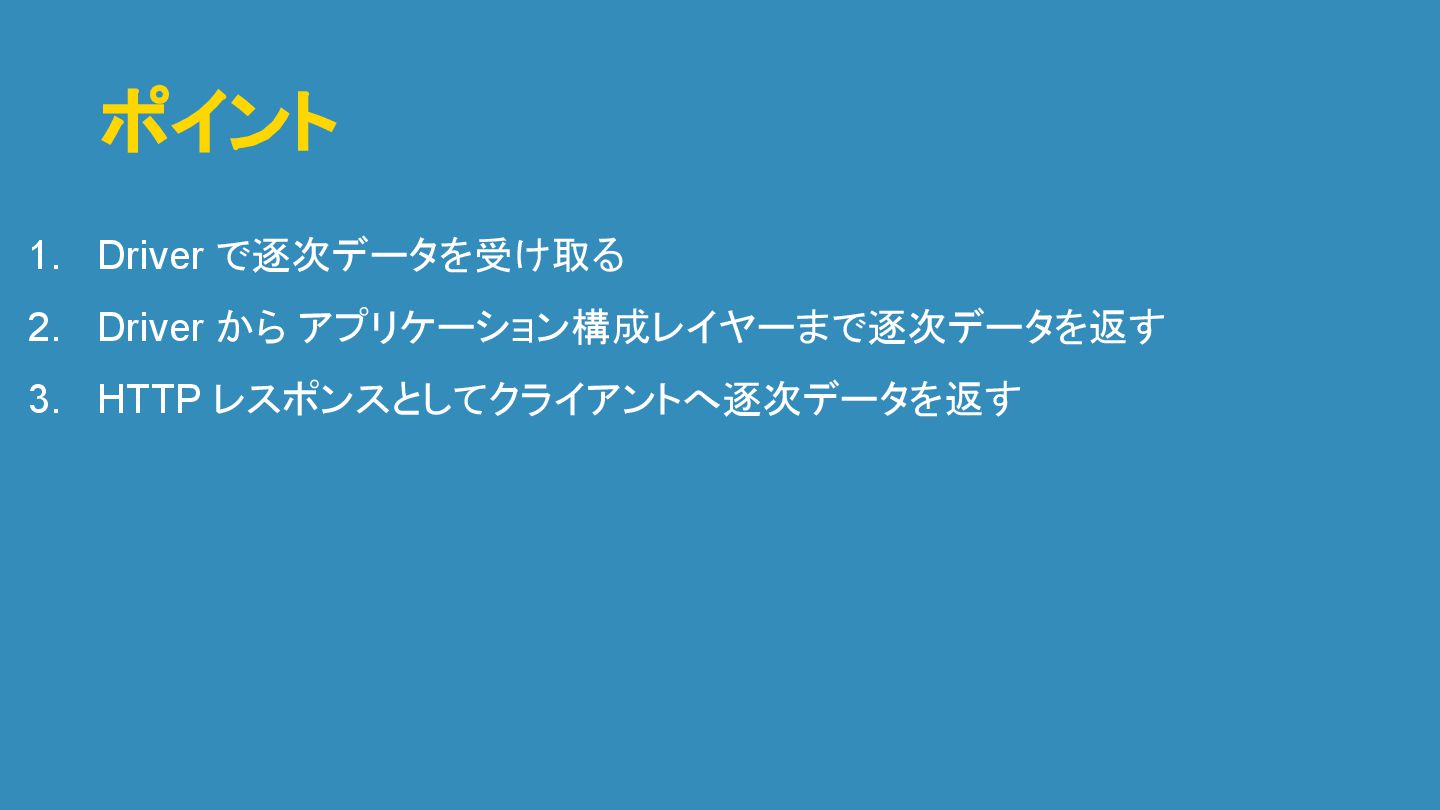 ポイント 1. Driver で逐次データを受け取る 2. Driver から アプリケーション構成レイヤーまで逐次データを返す 3. HTTP