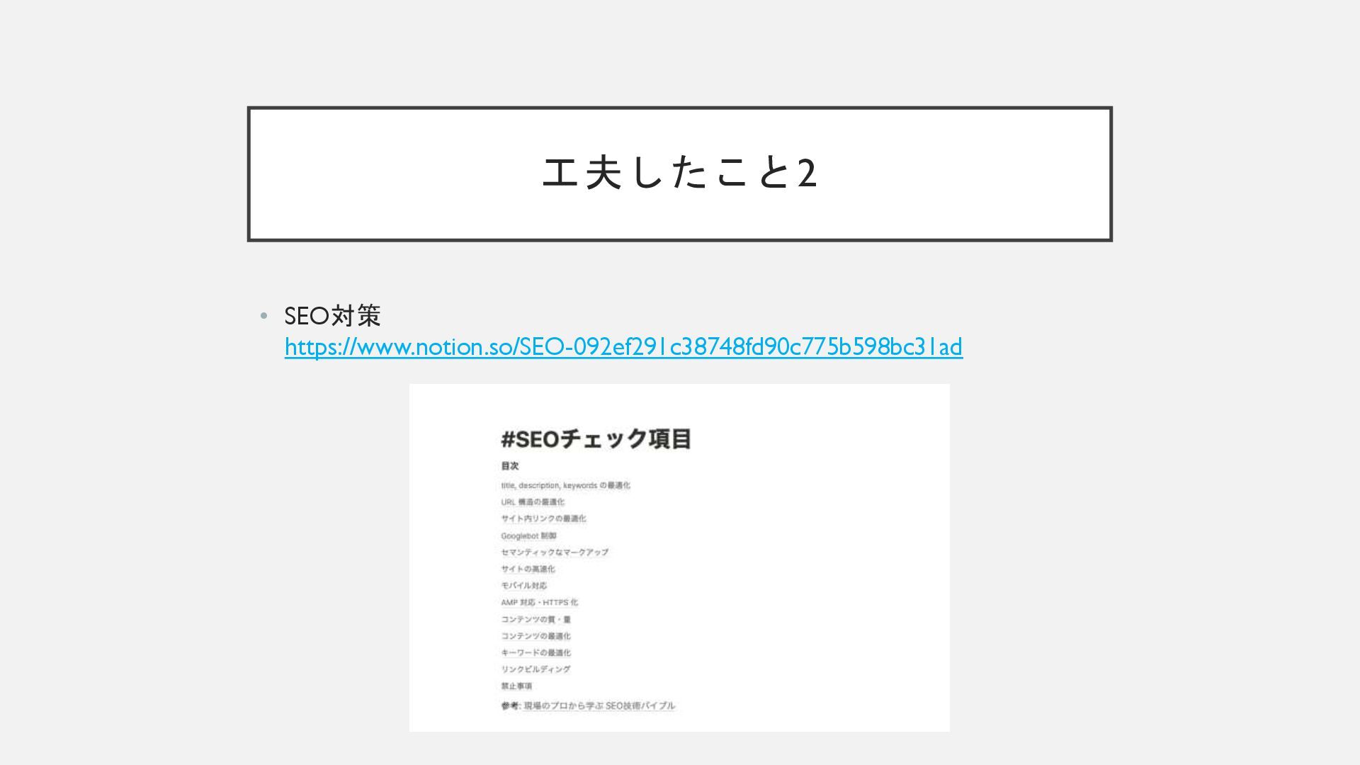 工夫したこと2 • SEO対策 https://www.notion.so/SEO-092ef291c38748fd90c775b598bc31ad