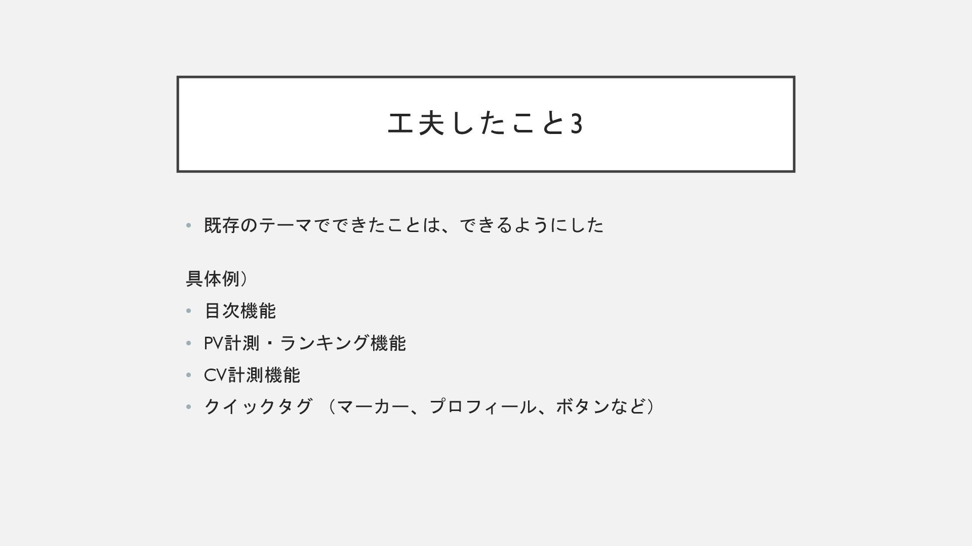工夫したこと3 • 既存のテーマでできたことは、できるようにした 具体例) • 目次機能 • PV計測・ランキング機能 • CV計測機能