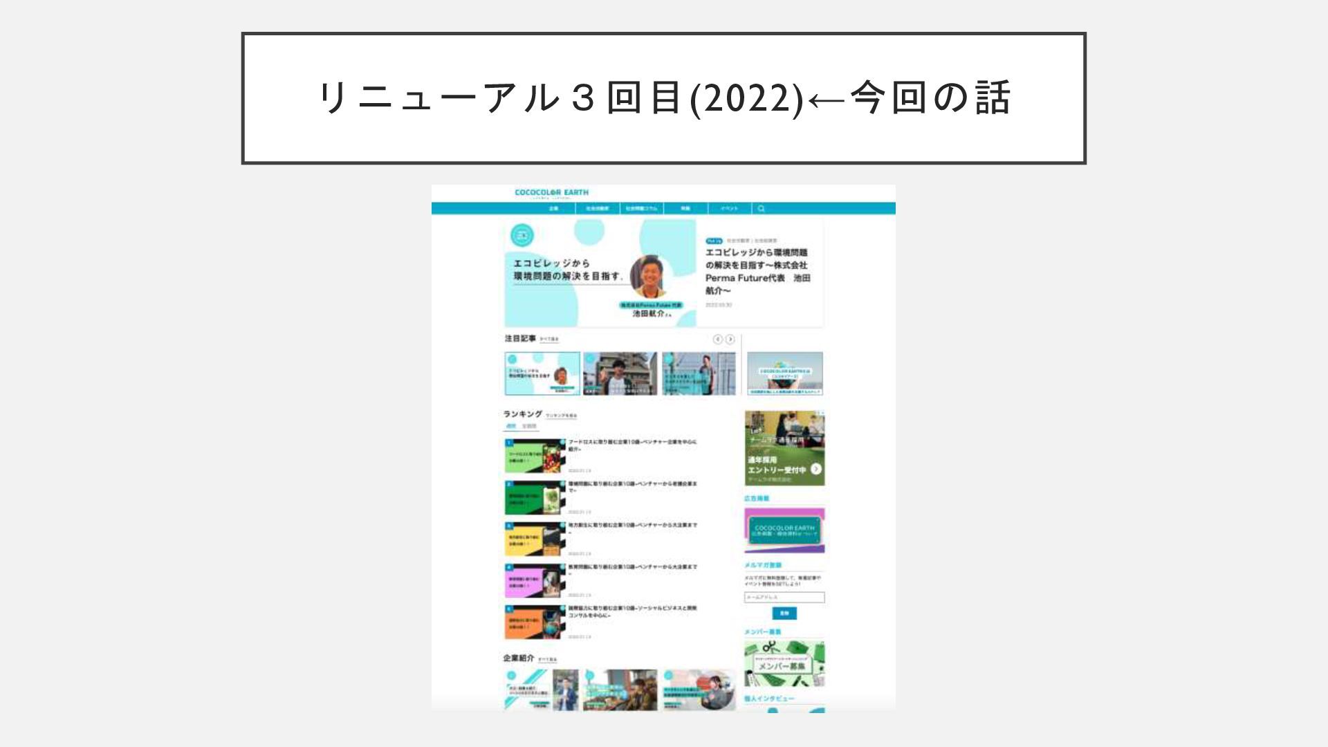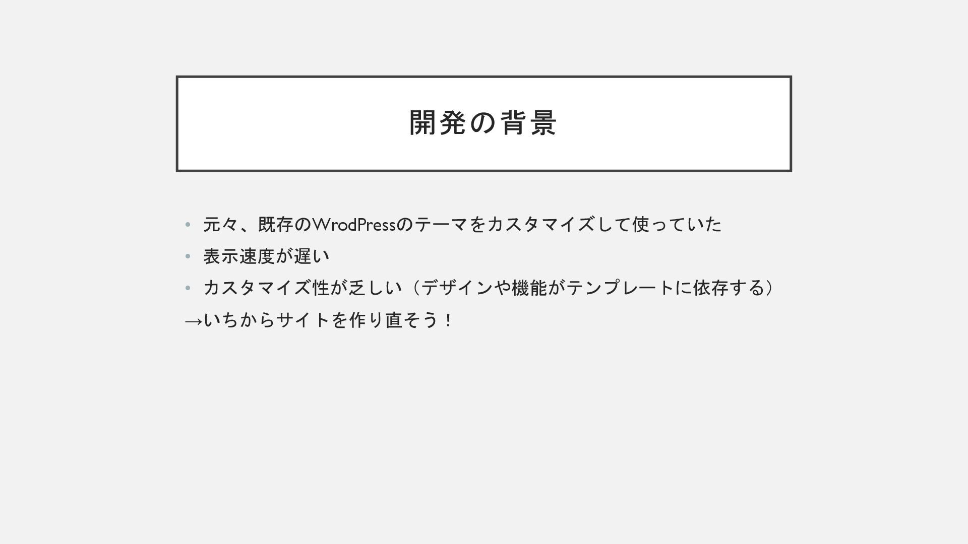 開発の背景 • 元々、既存のWrodPressのテーマをカスタマイズして使っていた • 表示速度が遅い • カスタマイズ性が乏しい(デザインや機能がテンプレートに依存する) →いちからサイトを作り直そう!