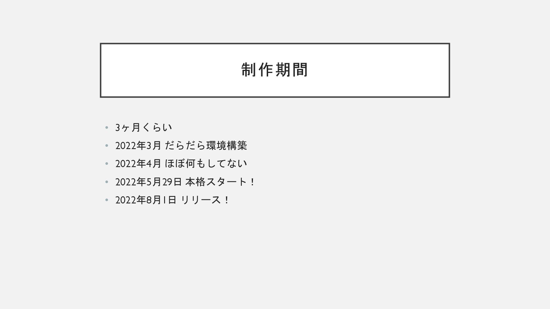 制作期間 • 3ヶ月くらい • 2022年3月 だらだら環境構築 • 2022年4月 ほぼ何もしてない •