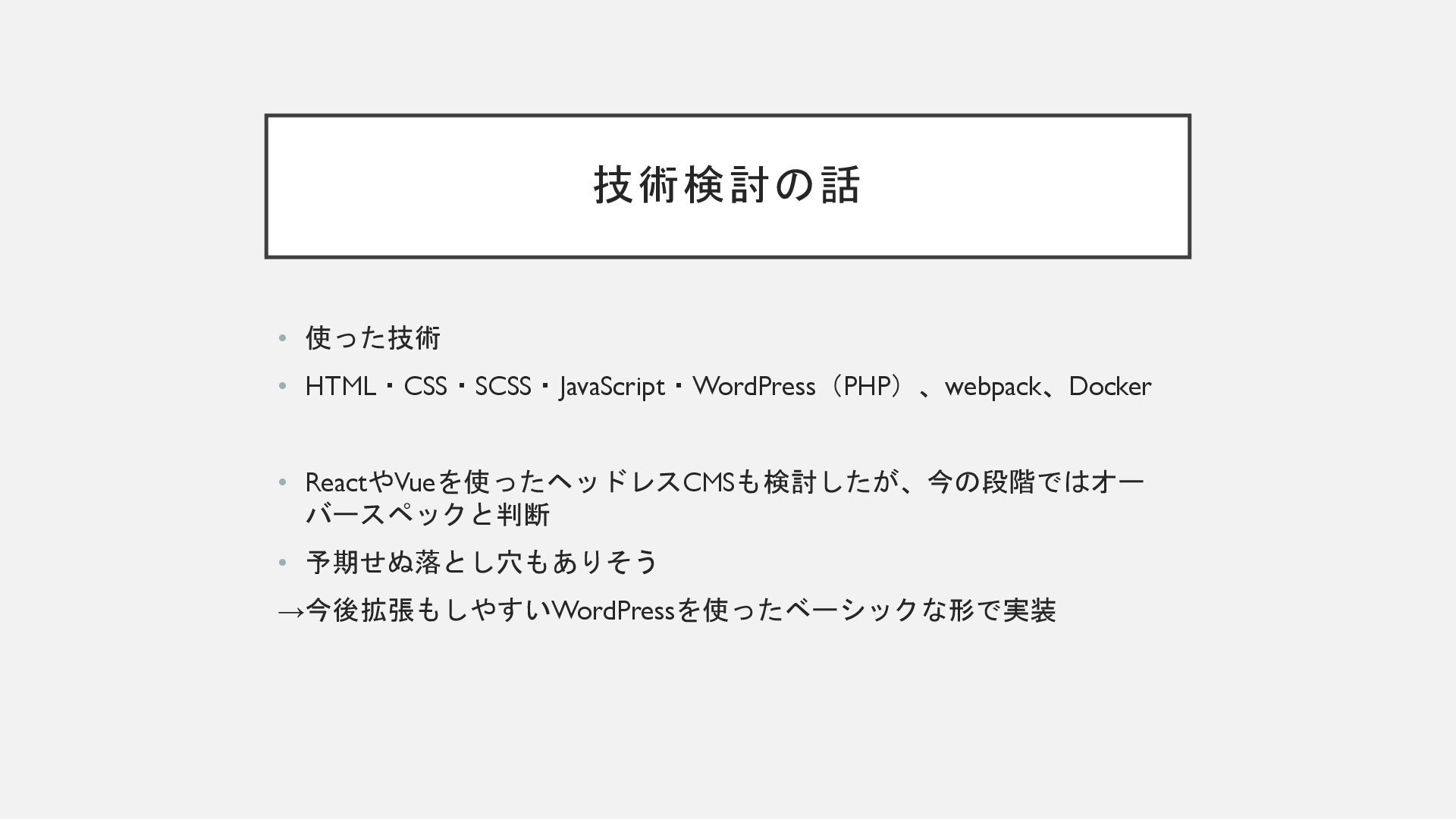 技術検討の話 • 使った技術 • HTML・CSS・SCSS・JavaScript・WordPress(PHP)、webpack、Docker • ReactやVueを使ったヘッドレスCMSも検討したが、今の段階ではオー バースペックと判断 • 予期せぬ落とし穴もありそう