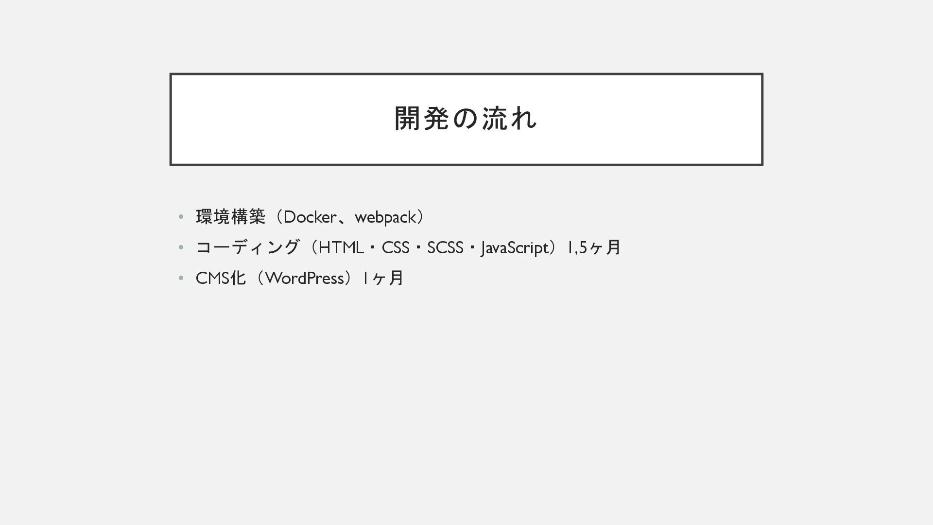 開発の流れ • 環境構築(Docker、webpack) • コーディング(HTML・CSS・SCSS・JavaScript)1,5ヶ月 • CMS化(WordPress)1ヶ月