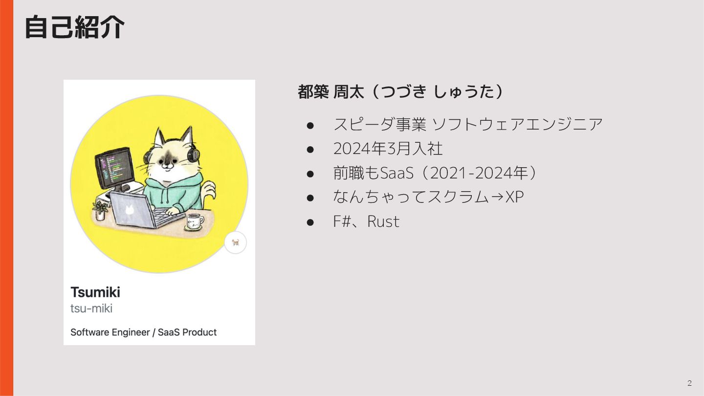 前職もSaaS(2021-2024年) • なんちゃってスクラム→XP • F#、Rust 自己紹介