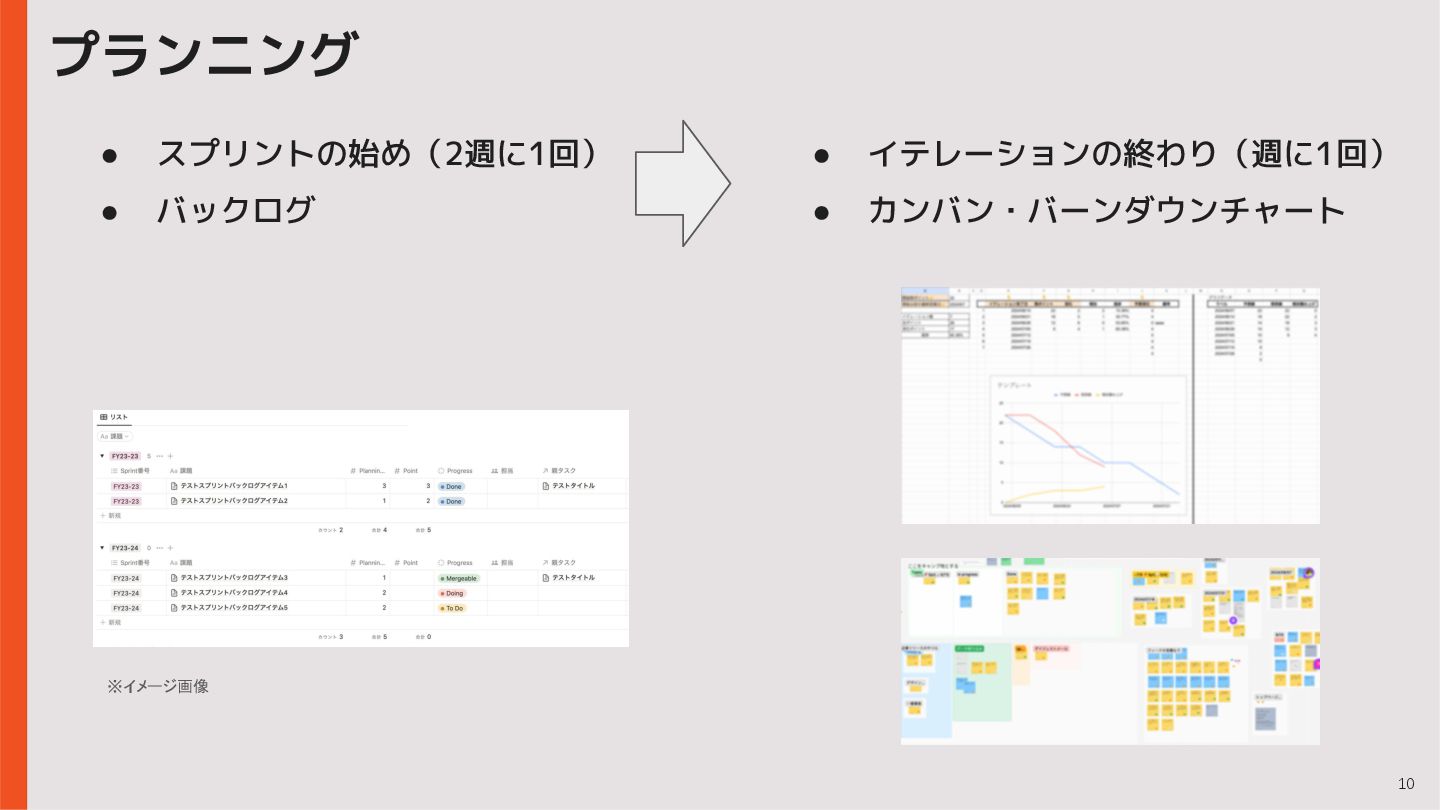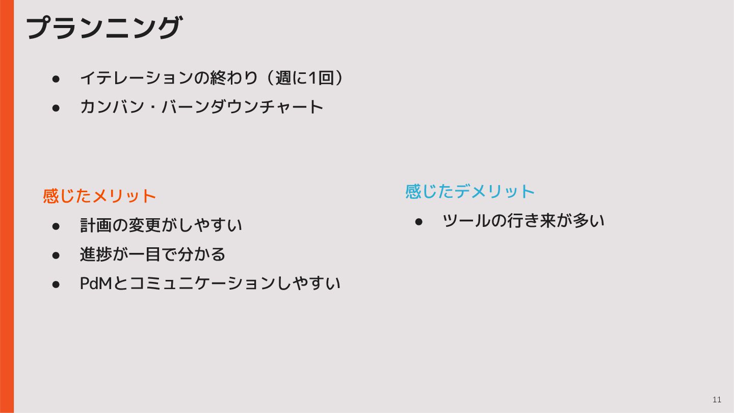 10 • イテレーションの終わり(週に1回) • カンバン・バーンダウンチャート プランニング • スプリントの始め(2週に1回) • バックログ