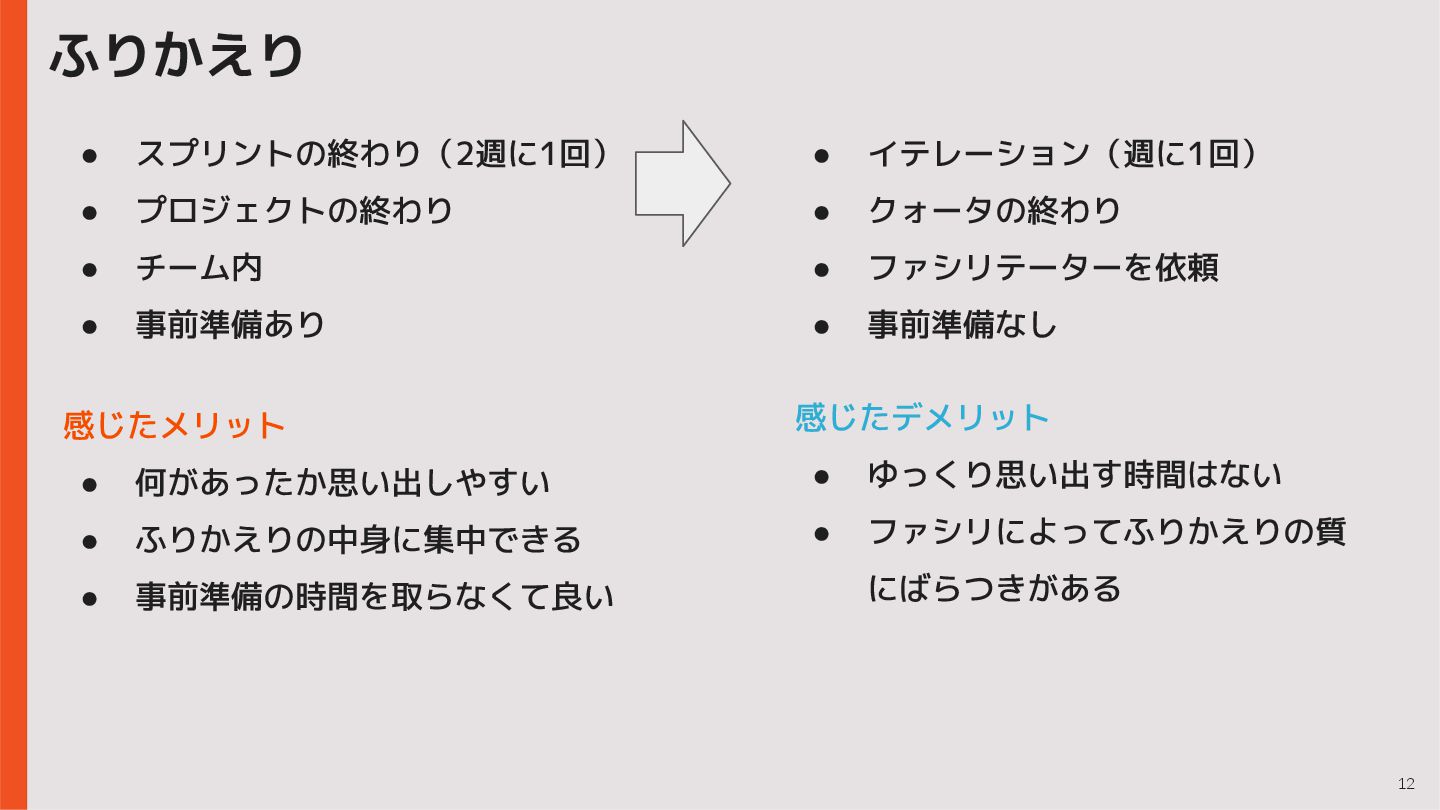• スプリントの終わり(2週に1回) • プロジェクトの終わり • チーム内 • 事前準備あり 感じたメリット • 何があったか思い出しやすい • ふりかえりの中身に集中できる • 事前準備の時間を取らなくて良い 感じたデメリット • ゆっくり思い出す時間はない • ファシリによってふりかえりの質 にばらつきがある