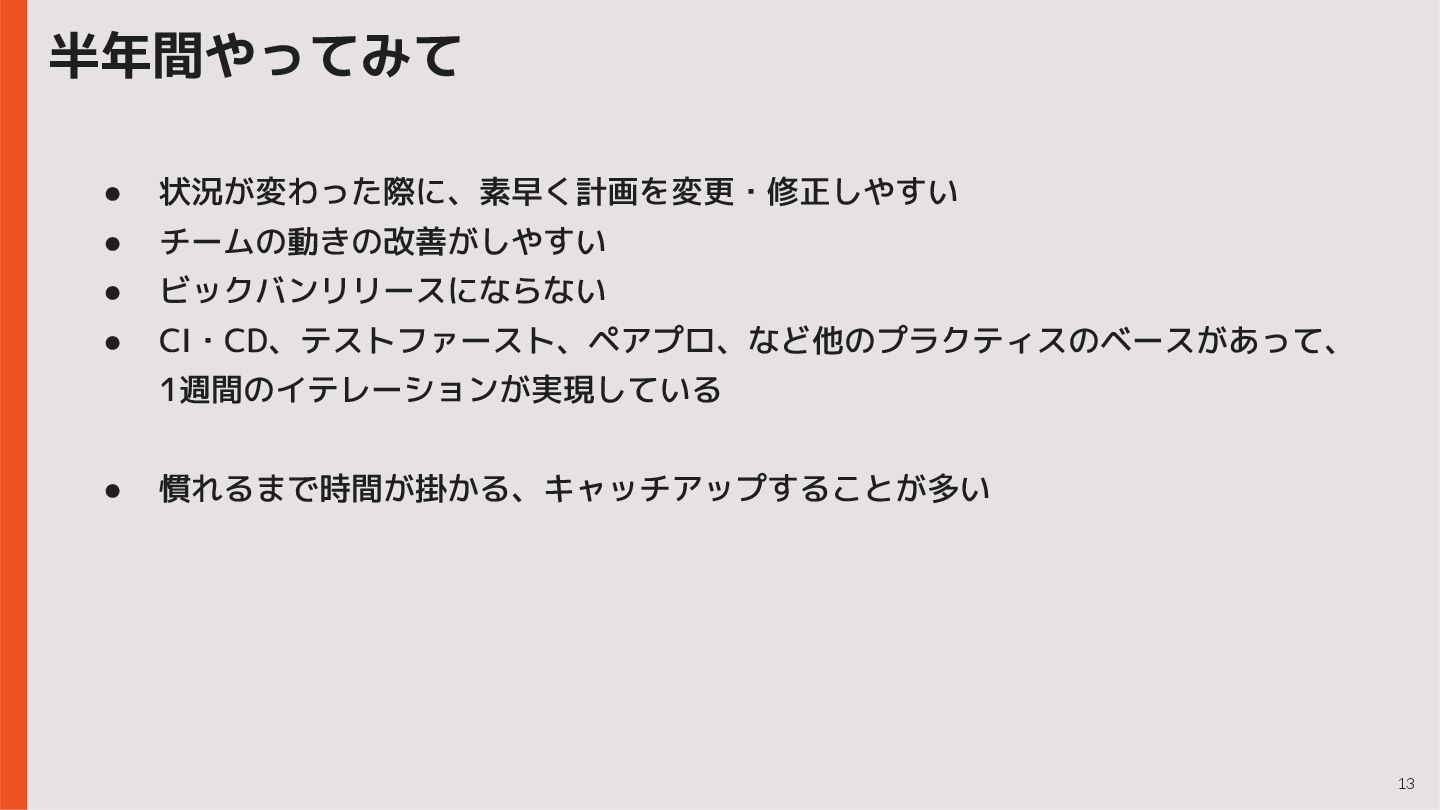 13 半年間やってみて • 状況が変わった際に、素早く計画を変更・修正しやすい • チームの動きの改善がしやすい • ビックバンリリースにならない • CI・CD、テストファースト、ペアプロ、など他のプラクティスのベースがあって、